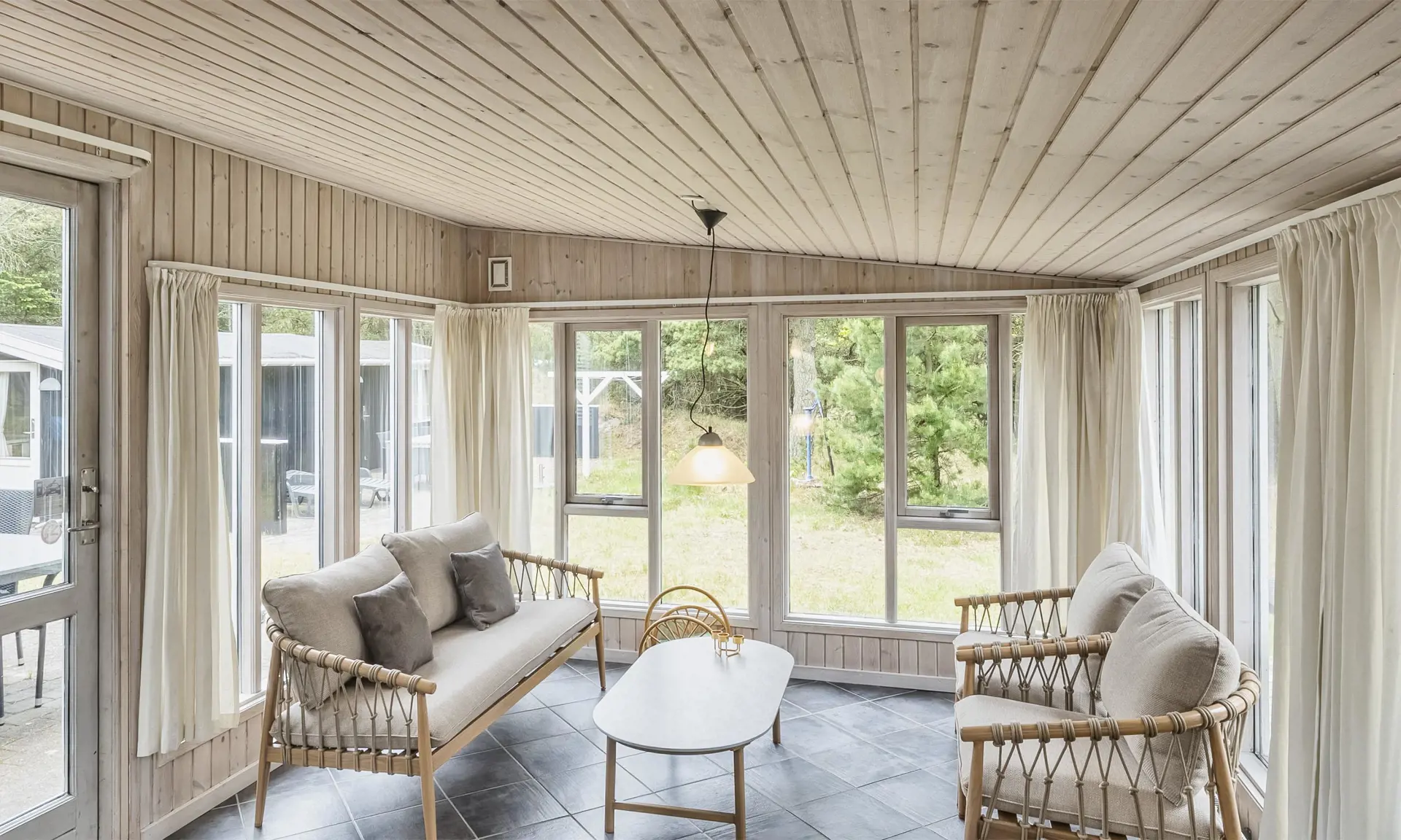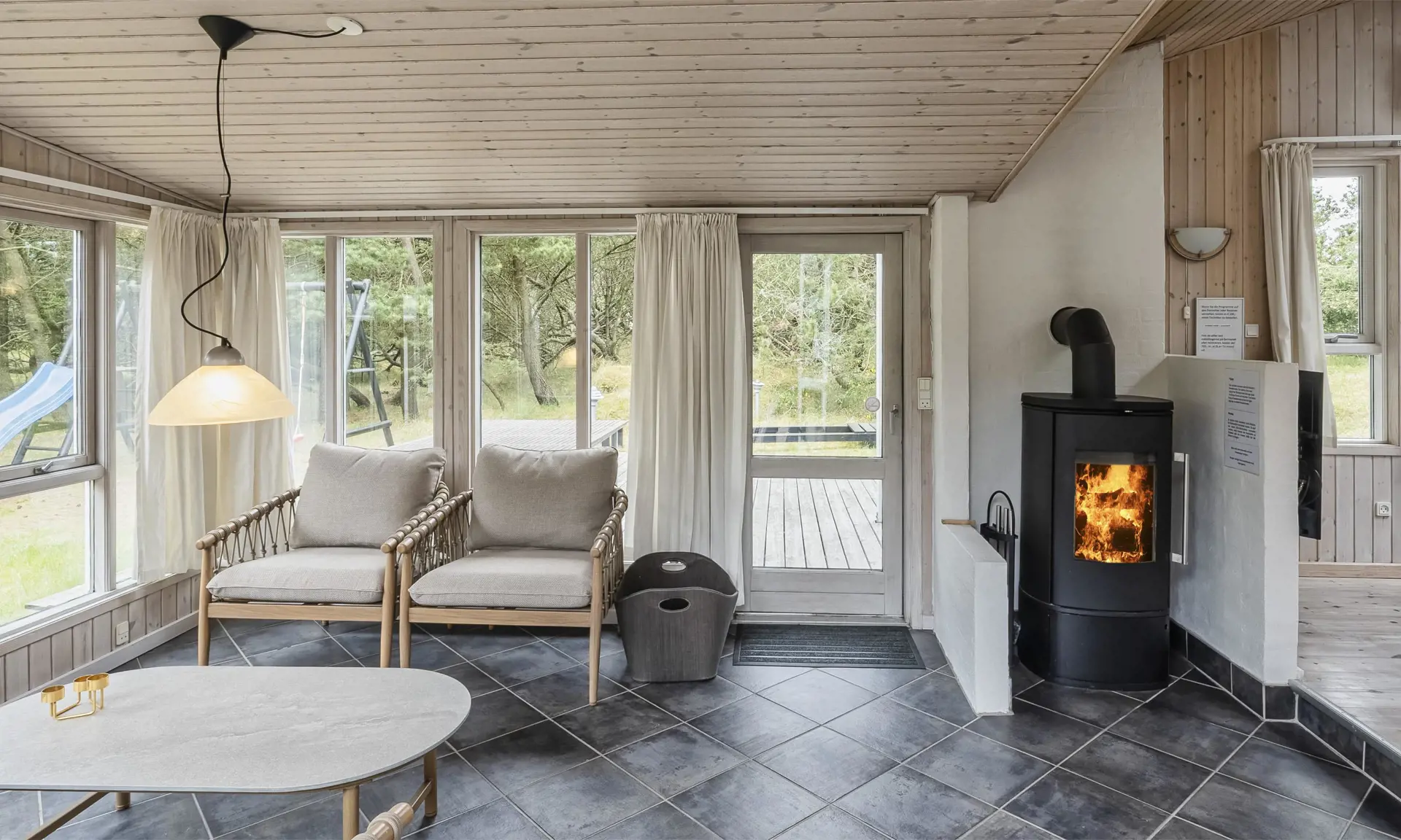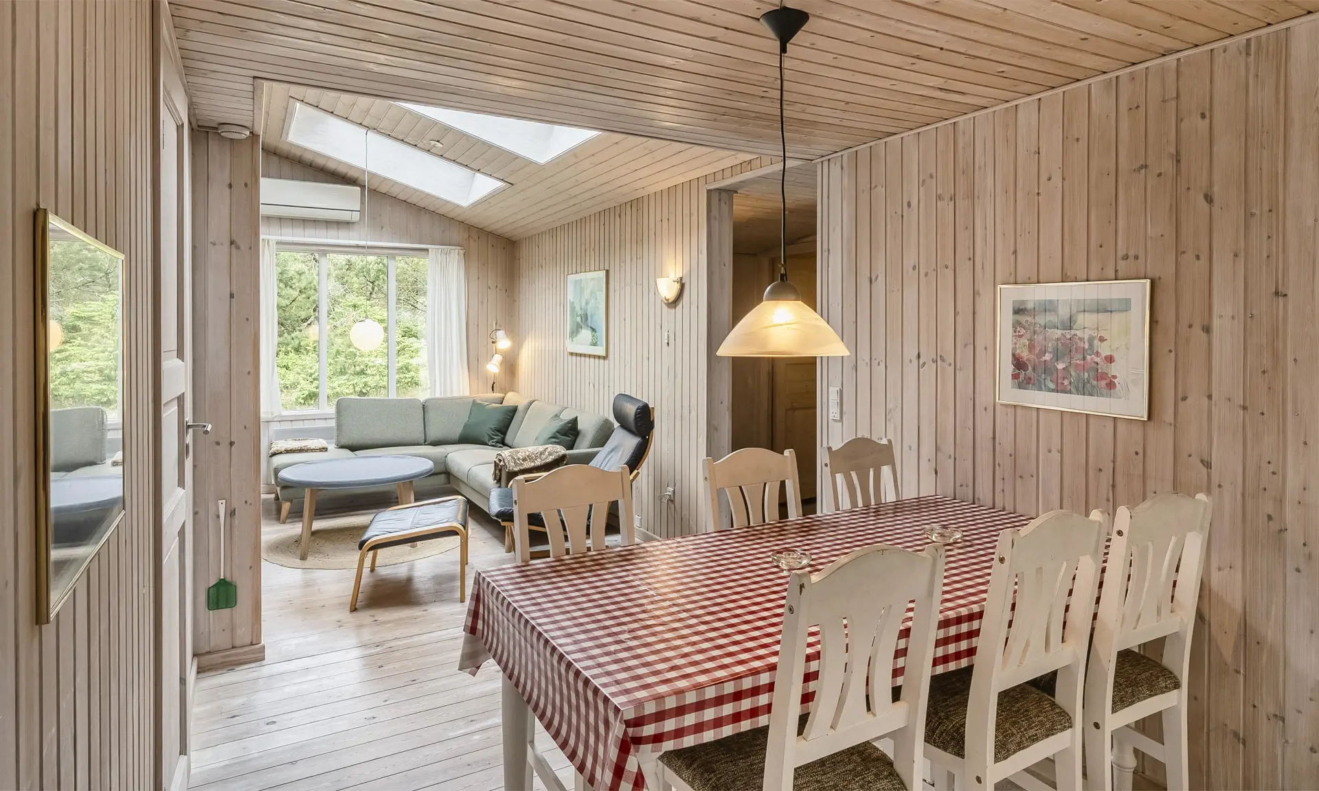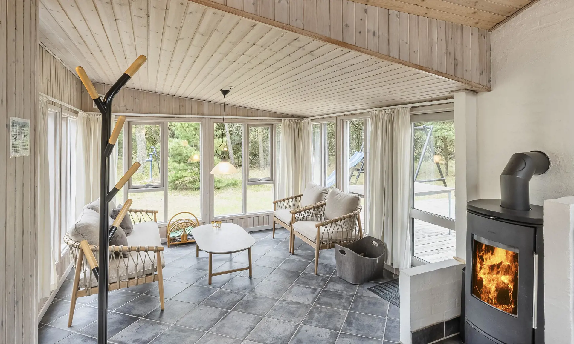 Hübsche eingerichtetes und freundliches Ferienhaus, mit Namen ”Solglimt” auf einem geschlossenen Waldgrundstück gelegen und für 6 Personen ausgestattet. Es liegt nur 1 Km vom Strand entfernt. Das Wohnzimmer ist mit gemütlichen Ledermöbeln und tollem Holzfußboden ausgestattet und durch das Oberlicht kommt zusätzlich viel Helligkeit in diesen Bereich. Das deutsche Fernsehprogramm empfangen Sie über eine Parabolantenne. Über eine Stufe nach unten kommen Sie dann in den gefliesten Wintergarten, wo auch der Kamin aufgestellt ist. Es befindet sich eine Warmepumpe im Ferienhaus. Mit dieser Warmepumpe haben sie die Möglichkeit die Stromkosten zu senken, denn die Warmepumpe ist energiesparend. Die offene Küche verfügt über einen Herd mit Cerankochfeld, einem Backofen in Arbeitshöhe, eine Geschirrspülmaschine, eine Mikrowelle und einer Kühl- und Gefrierkombination. Das Badezimmer ist mit einem WC, einem Handwaschbecken und einer Dusche ausgestattet. Es gibt drei Schlafzimmer im Ferienhaus: DB + DB + 2B. Das Ferienhaus verfügt über einen Internetanschluss (W-Lan). Die Sauna, die Waschmaschine und der Trockner befinden sich im Nebengebäude auf dem Grundstück. Das Ferienhaus verfügt über mehrere Terrassen, die eine krosse Holzterrasse ist zum Teil auch überdacht. Auf dem Grundstück befindet sich für die ”Kleinen Gäste” auch ein Spiel- und Klettergerüst mit Rutsche und Schaukel. Auch eine Sandkiste ist aufgestellt. Es sind keine Haustiere erlaubt, mit Ausnahme ein kleiner Hund mit max. Rauchen ist nicht erlaubt im Ferienhaus. Rückenhöhe von 30 cm. Der Hund darf nicht in die Möbeln oder Betten. Das Ferienhaus ist 1955 erbaut und in 2010 renoviert worden. Für dieses Ferienhaus entstehen Zusatzkosten für den Wasserverbrauch.