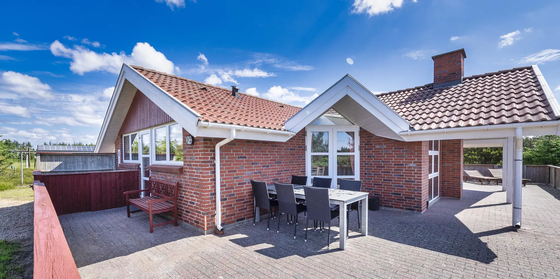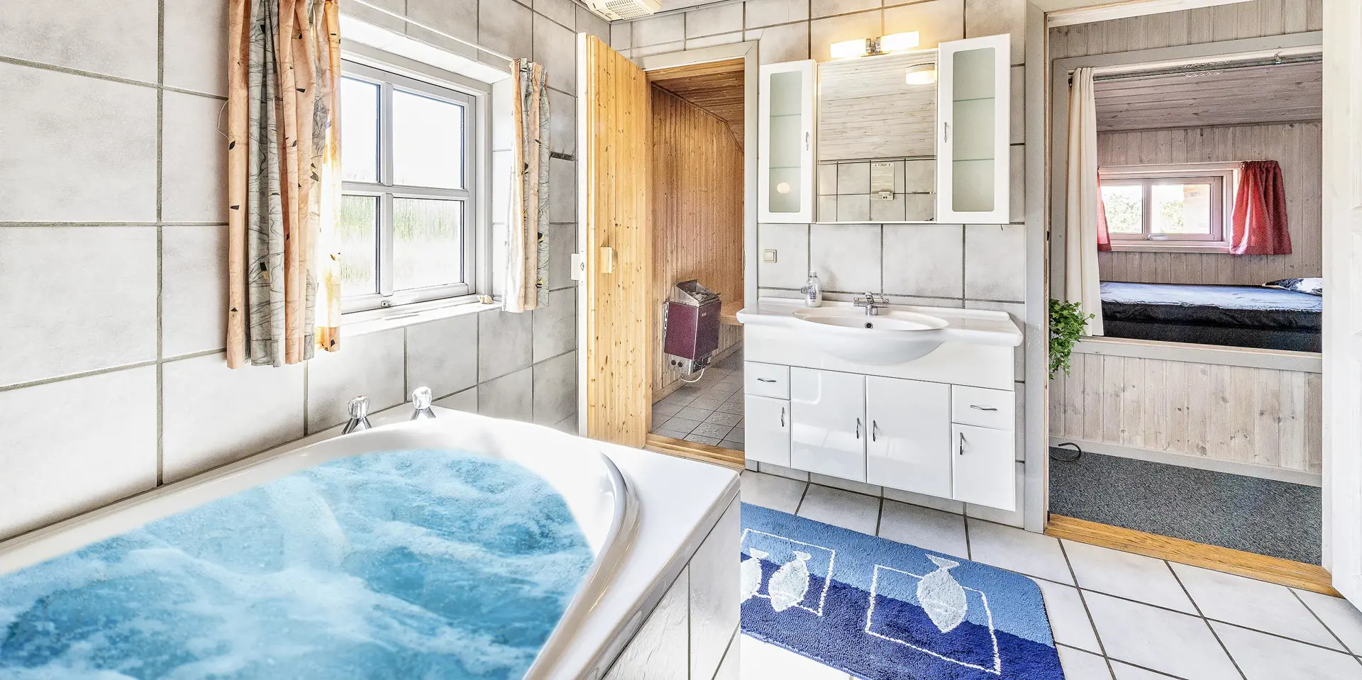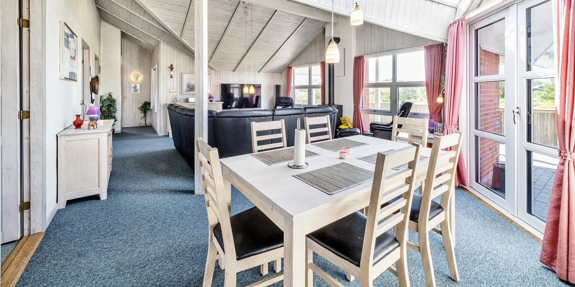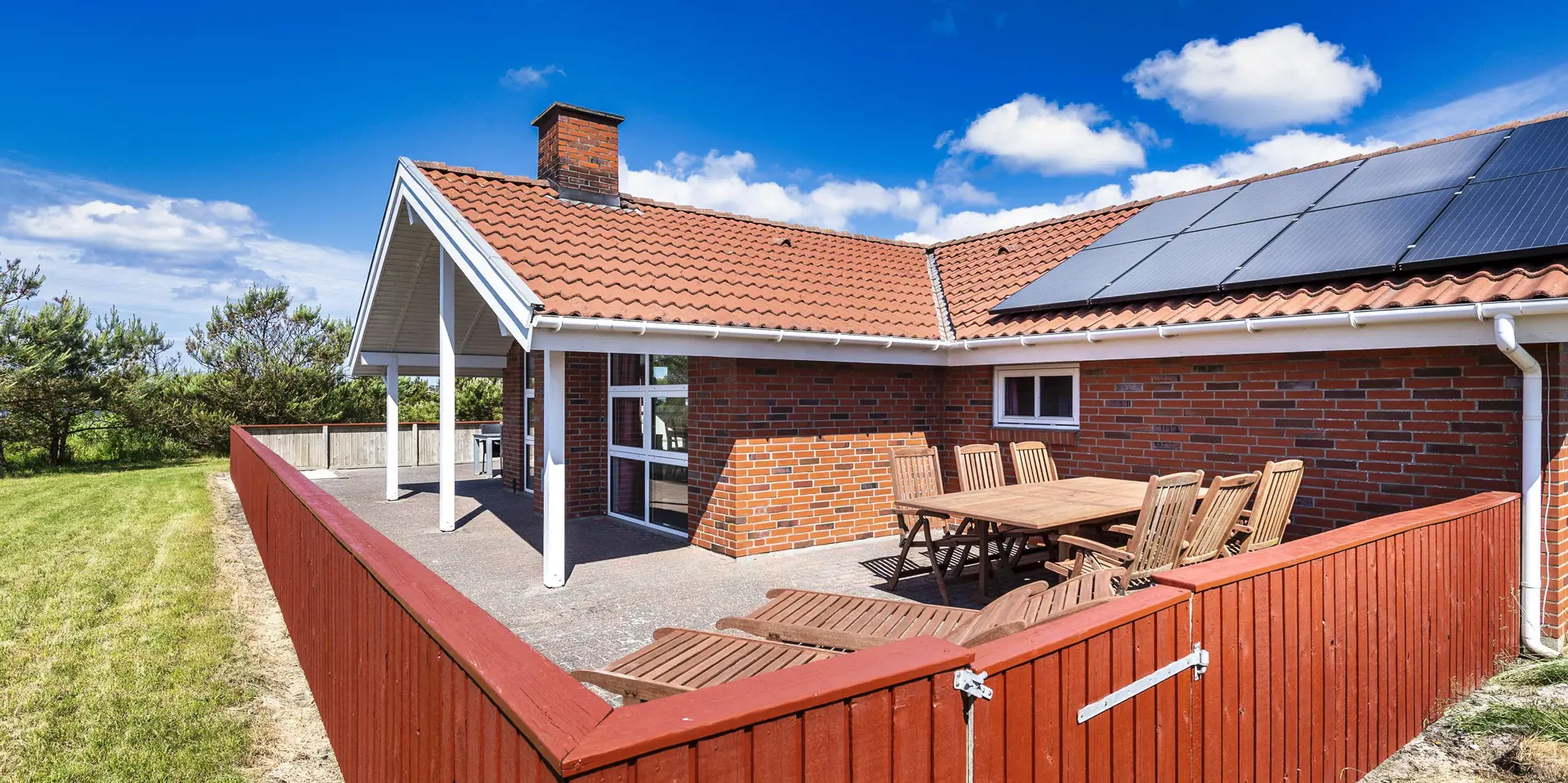 Dieses Ferienhaus befindet sich auf einem Naturgrundstück, mit Blick auf den kleinen See und ist für 6 Personen ausgestattet. Der Strand ist ca. 1 Km vom Ferienhaus entfernt. Hinter dem Ferienhaus ist ein kleines Waldgebiet und dort führt auch ein Fußweg von Vejers Strand nach Grærup Strand. Hier können Sie gemütlich mit Ihren Vierbeinern einen langen Spaziergang machen. Auf der großen geschlossenen Terrasse können Ihre Vierbeiner mal Luft schnappen, ohne das Sie stiften gehen können. Auf dem Ferienhaus befinden sich solarcellen, die Ihnen auch zu Gute kommen. Der Strom ist für Sie als Gast dann etwas günstiger und das Ferienhaus ist energiesparender geworden. Das Wohnzimmer verfügt über einen Kamin und ist mit einer großen Rundsitzecke ausgestattet. Es befindet sich eine Warmepumpe im Ferienhaus. Mit dieser Warmepumpe haben sie die Möglichkeit die Stromkosten zu senken, denn die Warmepumpe ist energiesparend. Smart TV und das deutsche Fernsehprogramm ist über eine Parabolantenne zu empfangen. Die beiden Tische im Wohn- und Essbereich sind abgestimmt und sind Antik ähnlich. Die Küche ist einfach gehalten bietet aber alles was Sie benötigen. Sie ist mit einem Herd mit Cerankochfeld, einem Backofen, einer Mikrowelle, einer Geschirrspülmaschine und einer Kühl- und Gefrierrkombination ausgestattet. Das Badezimmer ist mit einem WC, einem Handwaschbecken, einer Dusche, einer Sauna und einem Whirlpool ausgestattet. Es gibt noch ein weiteres kleines Gästebad mit WC und Handwaschbecken. Es gibt insgesamt drei Schlafzimmer im Hause: DB + DB + 2 Etagenbett. Allerdings wünscht der Eigentümer, das nicht mehr als 6 Personen das Haus beziehen. Die Waschmaschine und der Trockner befinden sich im Hauswirtschaftsraum. Eine Schaukel und eine Sandkiste stehen für die Kleinen Gäste auf dem Grundstück zur Verfügung. Das Ferienhaus verfügt über einen Internetanschluss (W-Lan). Bei diesem Ferienhaus steht gratis Heizmaterial vom Eigentümer für den Kamin zur Verfügung. Es sind max. drei Haustiere erlaubt. Gratis Eintritt für das Badeland in Oksbøl in 2025. Das Ferienhaus wurde 1991 erbaut.