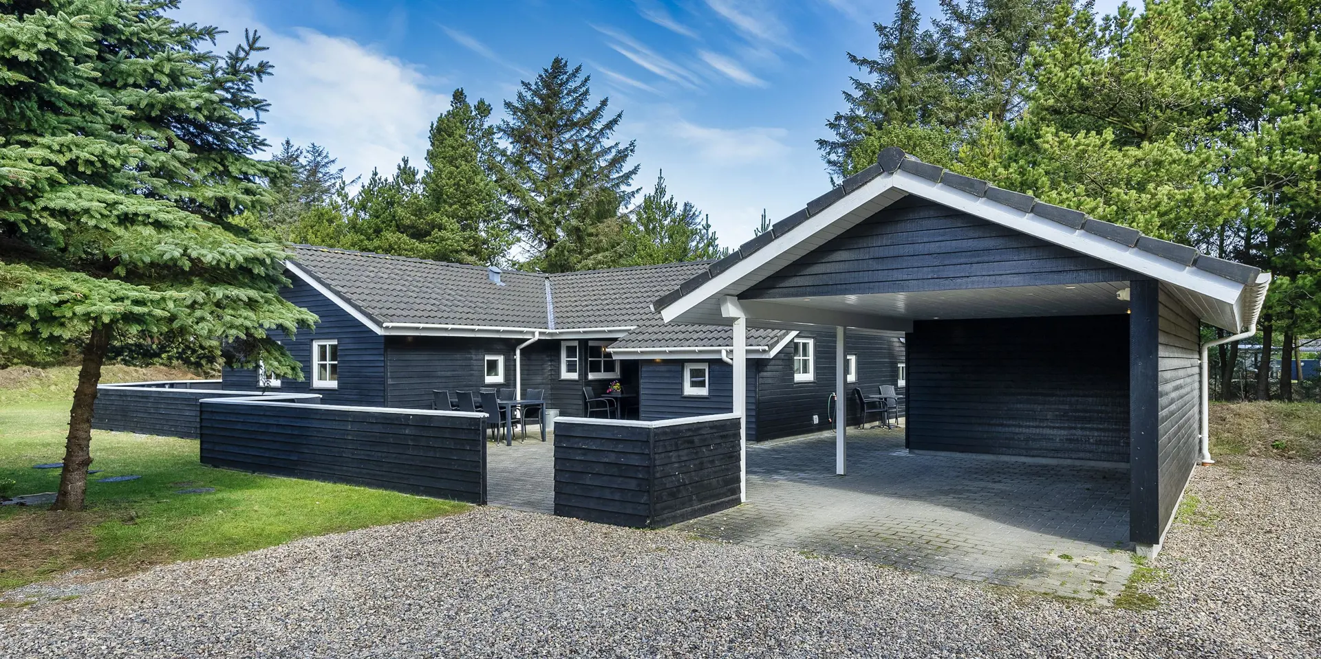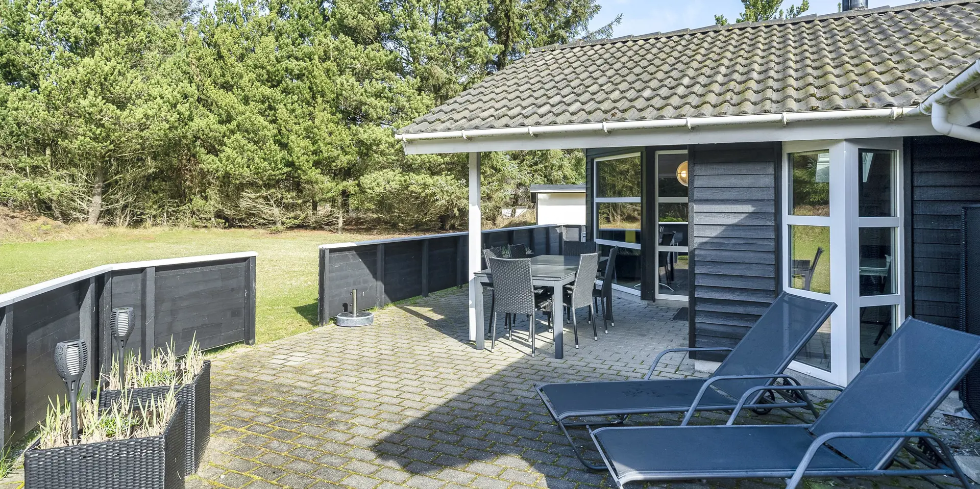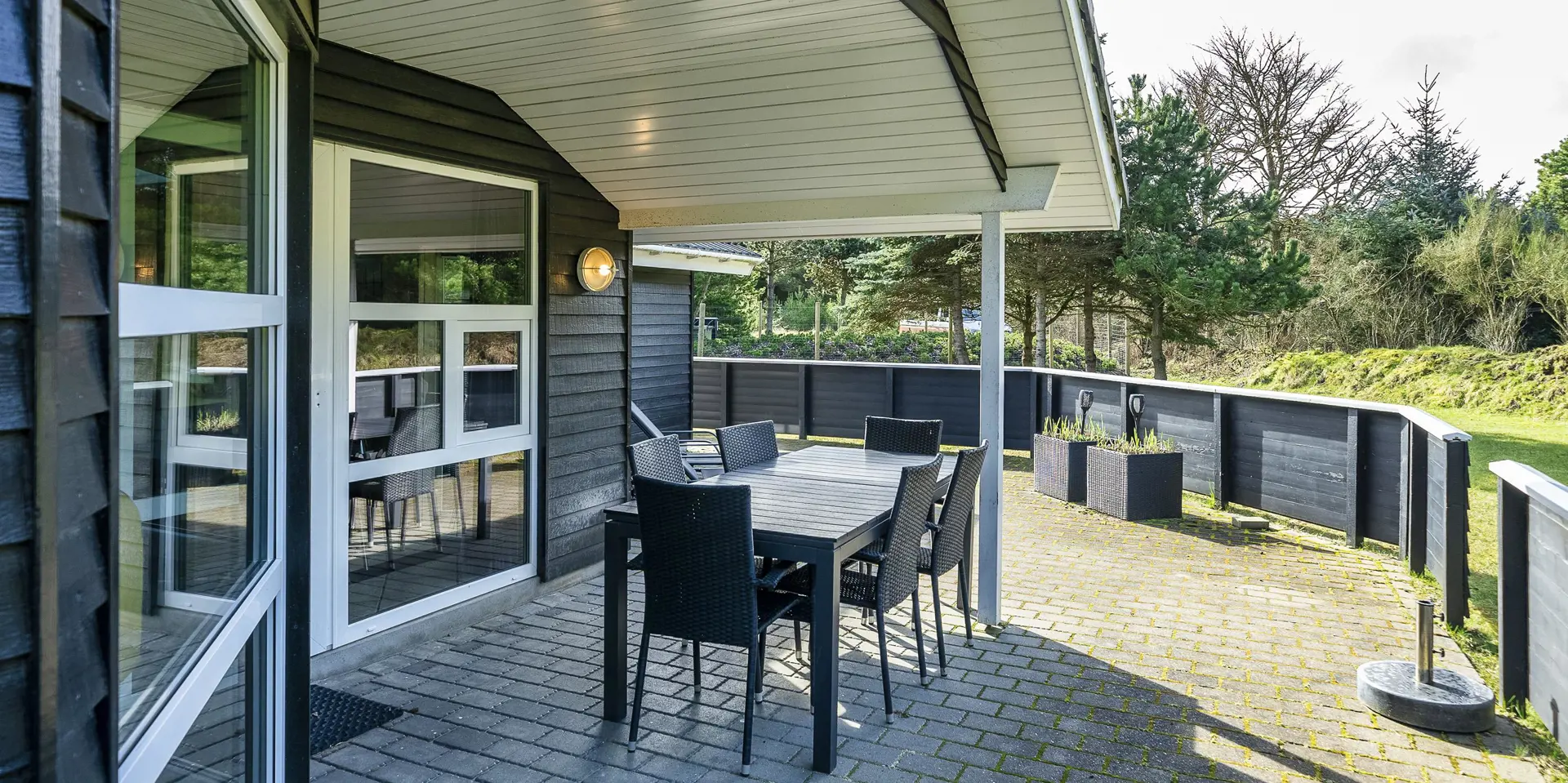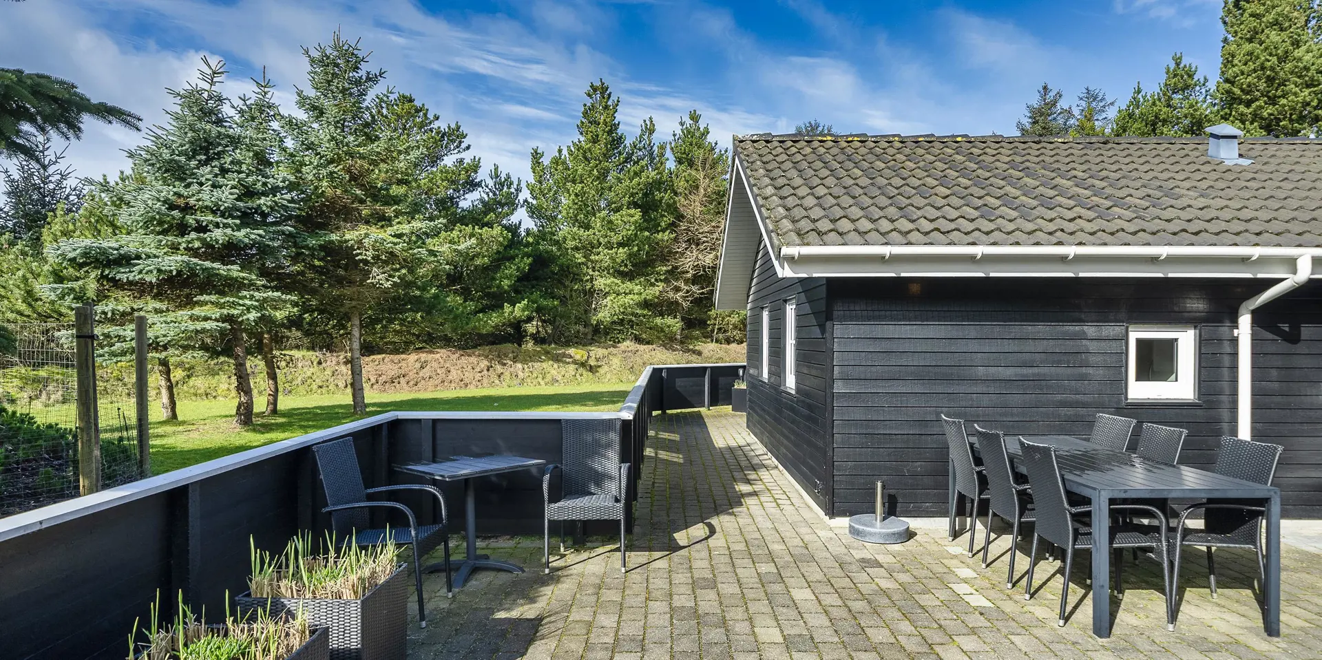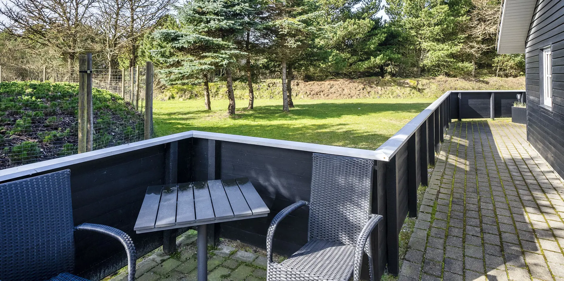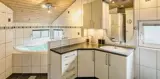 Freundliches und hell ausgestattetes Ferienhaus auf einem großen Grundstück für 8 Personen und von Bäumen umgeben. Der Strand ist rund 1 Km vom Haus entfernt. Die Terrasse ist grosszügig ums Haus verlegt und im vorderen Bereich geht es bis zum Carport ran. Auf den Grundstück befindet sich ein Schelter (Übernachtungshütte) für "hygge" oder Übernachtung. Das Carport ist ebenfalls mit einer Fliese verlegt. So haben Sie die Möglichkeit trockenen Fusses (ohne Matsch an den Schuhen) ins Ferienhaus zu gelangen. Ein kleiner Teil der Terrasse ist sogar überdacht. Das Wohnzimmer verfügt über einen Kaminofen, den Sie gut von der Rundsitzecke aus beobachten können. Das deutsche Fernsehprogramm empfangen Sie über Stofa, daher sind es nur 5-8 Kanäle die Sie empfangen können. Der Wohnbereich ist offen zur Küche. Die Küche verfügt über einen Herd mit Cerankochfeld, einem Backofen in Arbeitshöhe, einer Geschirrspülmaschine und einer Mikrowelle. Es gibt insgesamt 4 Schlafzimmer im Hause: DB + DB + DB + 2B. Das große Badezimmer hat ein WC, ein Handwaschbecken (in einer großen Arbeitsfläche eingelassen und bietet daher auch die Möglichkeit für einen Platz als Wickeltisch), eine Dusche, eine Handtuchhaltereizung, eine Sauna und der Whirlpool ist hier auch aufgestellt. Das kleinere Badezimmer hat ein WC, ein Handwaschbecken und eine Dusche. Im Hauswirtschaftsraum ist die Waschmaschine und er Trockner untergebracht. Es befindet sich eine Warmepumpe im Ferienhaus. Mit dieser Warmepumpe haben sie die Möglichkeit die Stromkosten zu senken, denn die Warmepumpe ist energiesparend. Das Ferienhaus verfügt über einen Internetanschluss (W-Lan). Rauchen ist nicht erlaubt. Es sind keine Haustiere erlaubt! Das Ferienhaus ist 2001 erbaut.