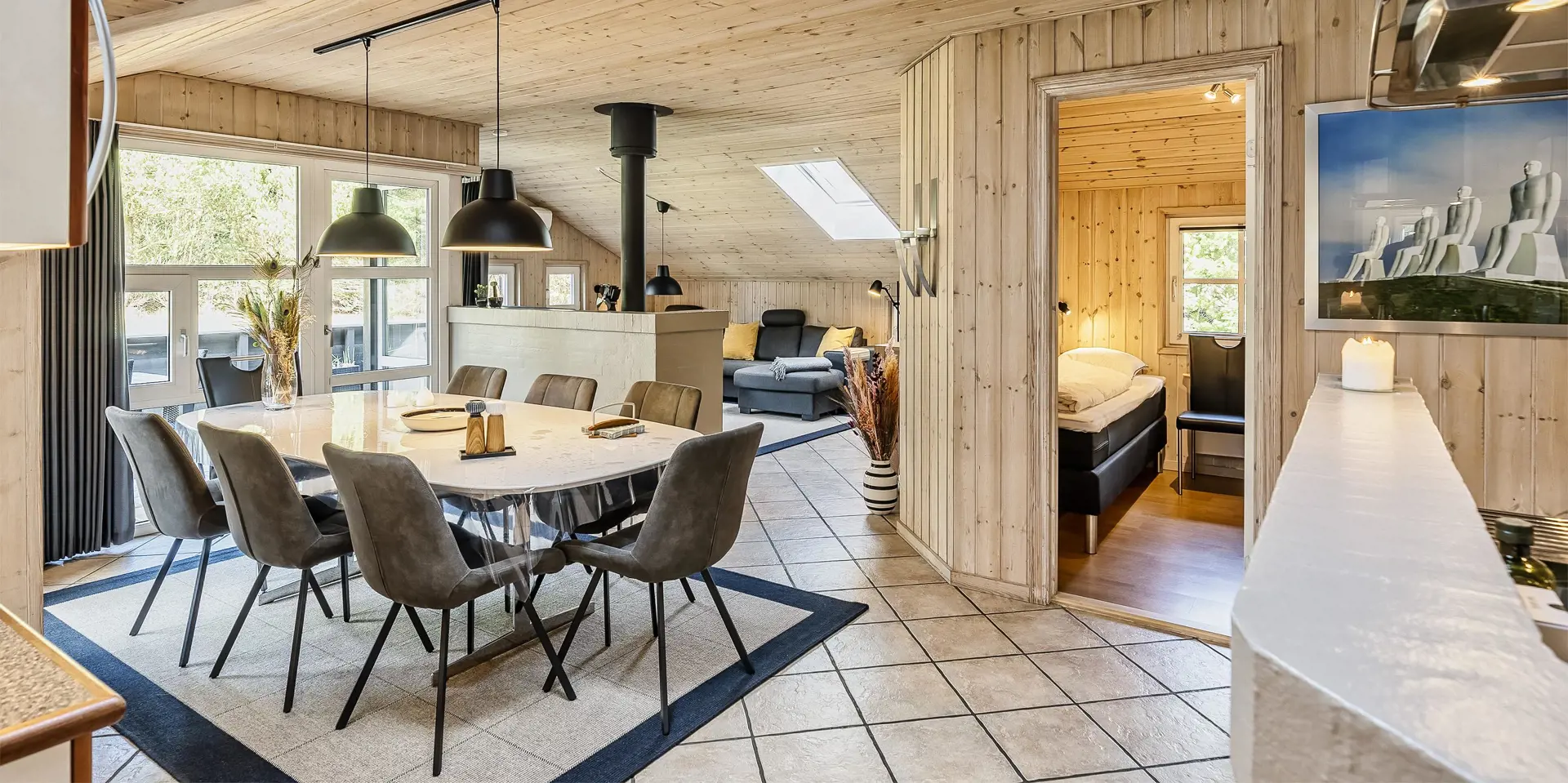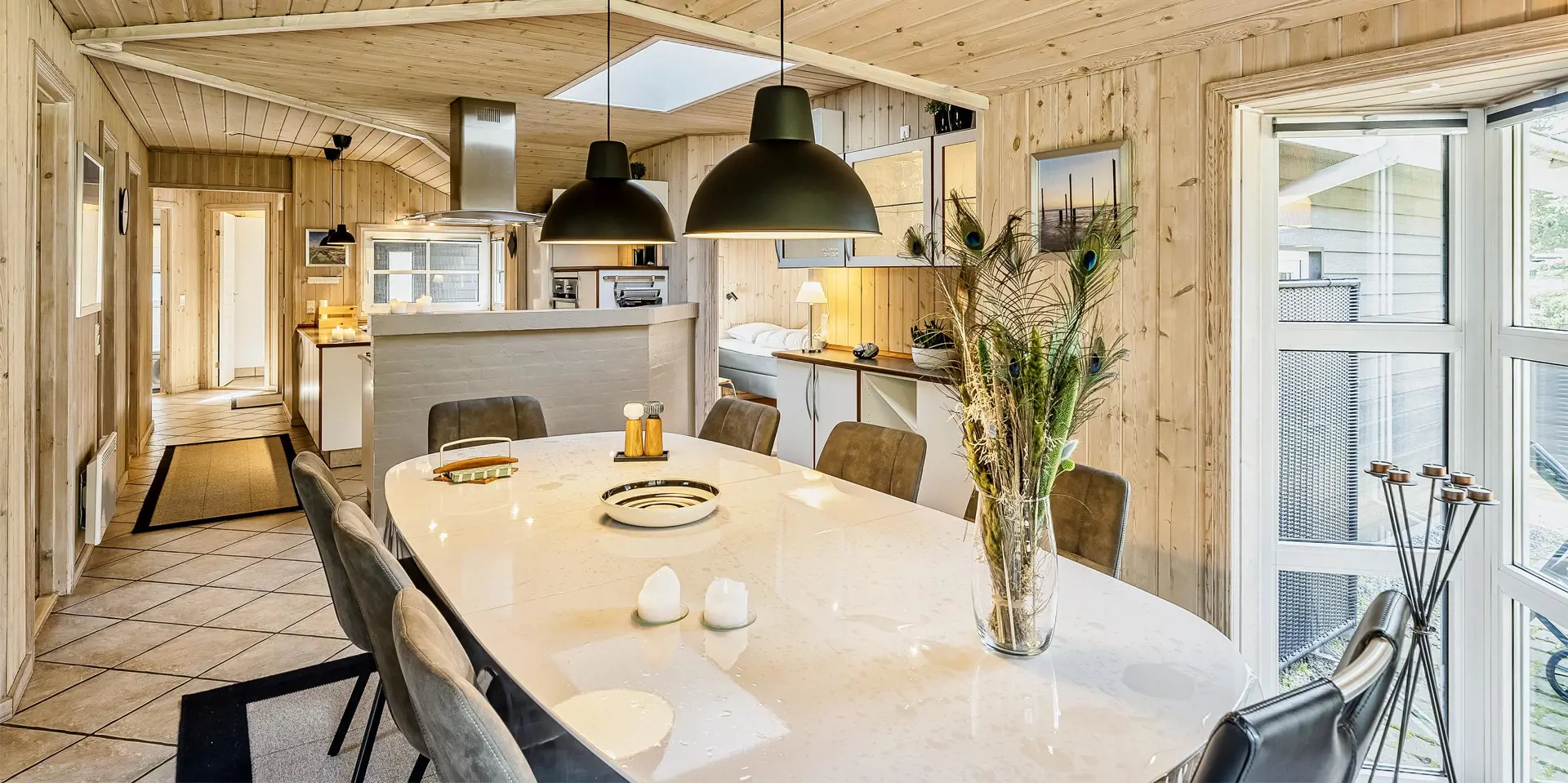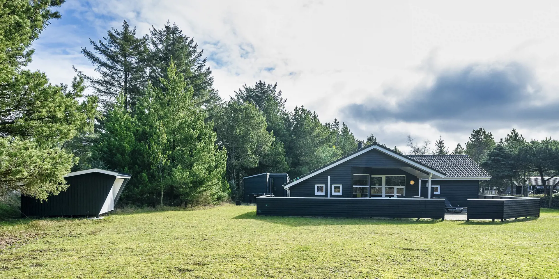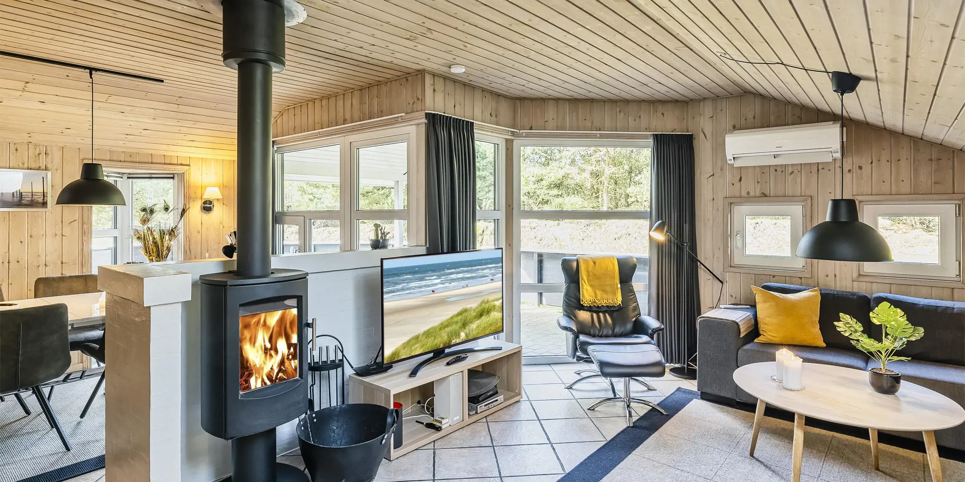 Freundliches und hell ausgestattetes Ferienhaus auf einem großen Grundstück für 8 Personen und von Bäumen umgeben. Der Strand ist rund 1 Km vom Haus entfernt. Die Terrasse ist grosszügig ums Haus verlegt und im vorderen Bereich geht es bis zum Carport ran. Auf den Grundstück befindet sich ein Schelter (Übernachtungshütte) für "hygge" oder Übernachtung. Das Carport ist ebenfalls mit einer Fliese verlegt. So haben Sie die Möglichkeit trockenen Fusses (ohne Matsch an den Schuhen) ins Ferienhaus zu gelangen. Ein kleiner Teil der Terrasse ist sogar überdacht. Das Wohnzimmer verfügt über einen Kaminofen, den Sie gut von der Rundsitzecke aus beobachten können. Das deutsche Fernsehprogramm empfangen Sie über Stofa, daher sind es nur 5-8 Kanäle die Sie empfangen können. Der Wohnbereich ist offen zur Küche. Die Küche verfügt über einen Herd mit Cerankochfeld, einem Backofen in Arbeitshöhe, einer Geschirrspülmaschine und einer Mikrowelle. Es gibt insgesamt 4 Schlafzimmer im Hause: DB + DB + DB + 2B. Das große Badezimmer hat ein WC, ein Handwaschbecken (in einer großen Arbeitsfläche eingelassen und bietet daher auch die Möglichkeit für einen Platz als Wickeltisch), eine Dusche, eine Handtuchhaltereizung, eine Sauna und der Whirlpool ist hier auch aufgestellt. Das kleinere Badezimmer hat ein WC, ein Handwaschbecken und eine Dusche. Im Hauswirtschaftsraum ist die Waschmaschine und er Trockner untergebracht. Es befindet sich eine Warmepumpe im Ferienhaus. Mit dieser Warmepumpe haben sie die Möglichkeit die Stromkosten zu senken, denn die Warmepumpe ist energiesparend. Das Ferienhaus verfügt über einen Internetanschluss (W-Lan). Rauchen ist nicht erlaubt. Es sind keine Haustiere erlaubt! Das Ferienhaus ist 2001 erbaut.