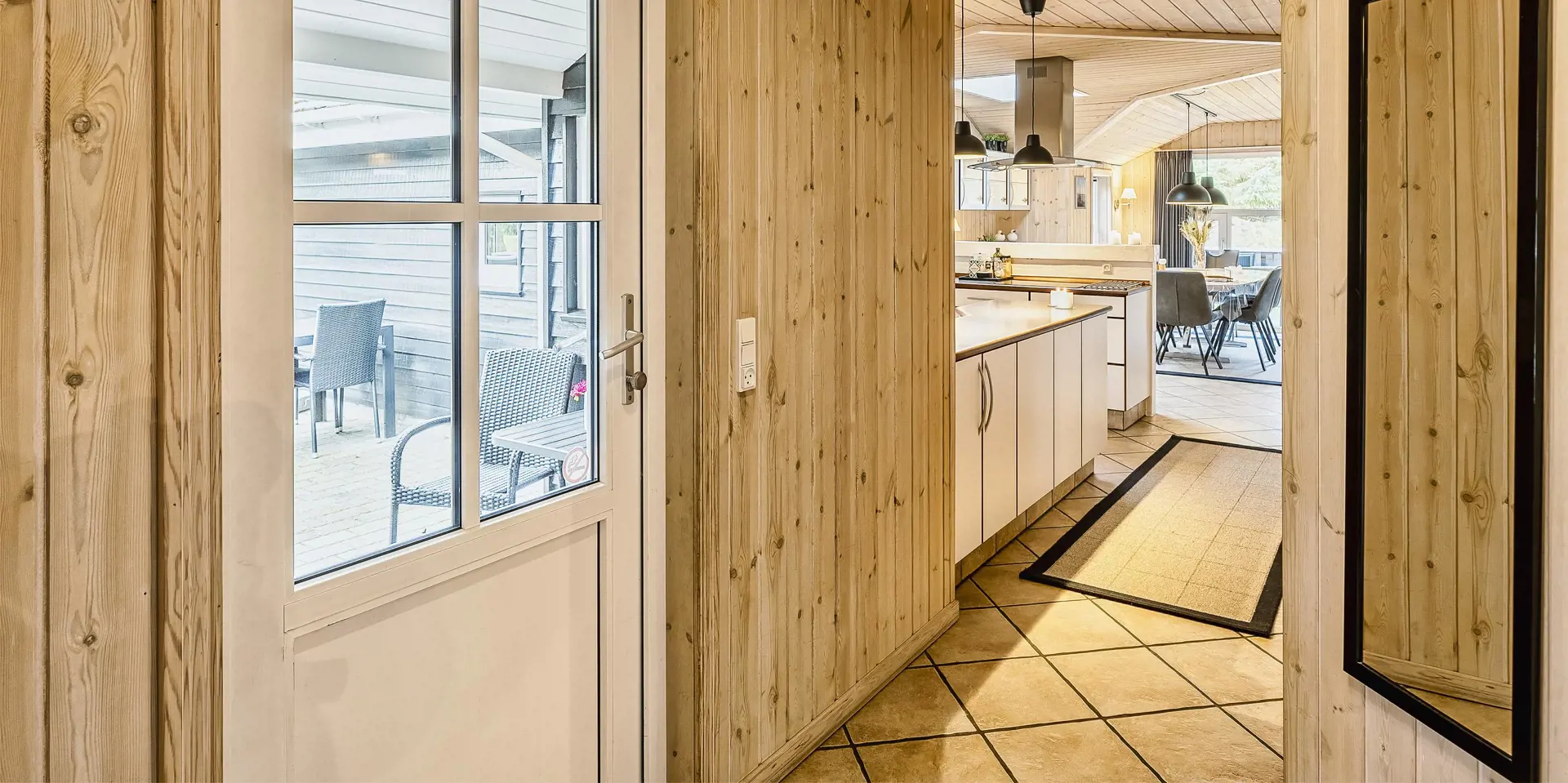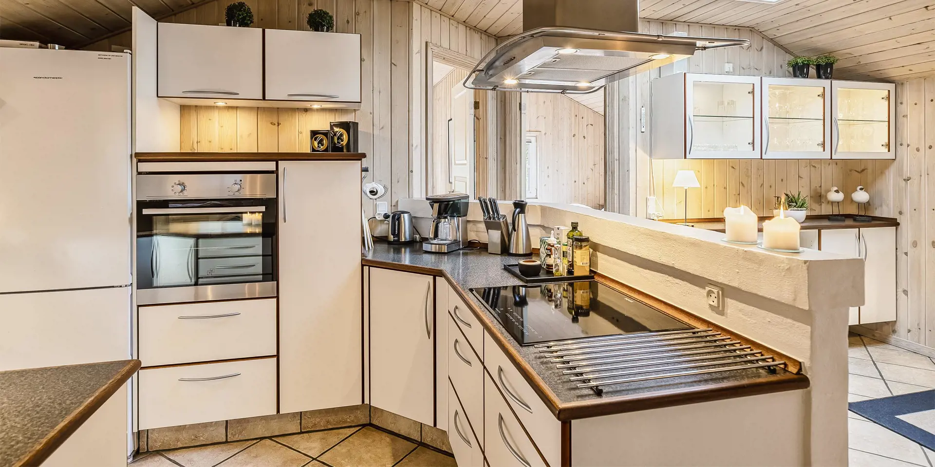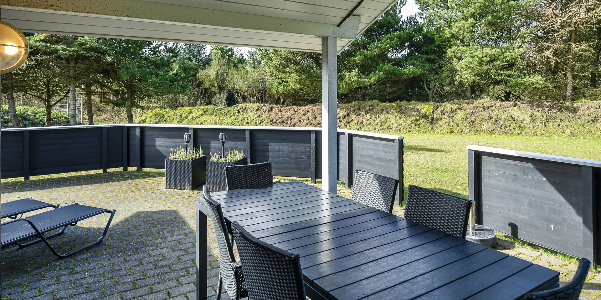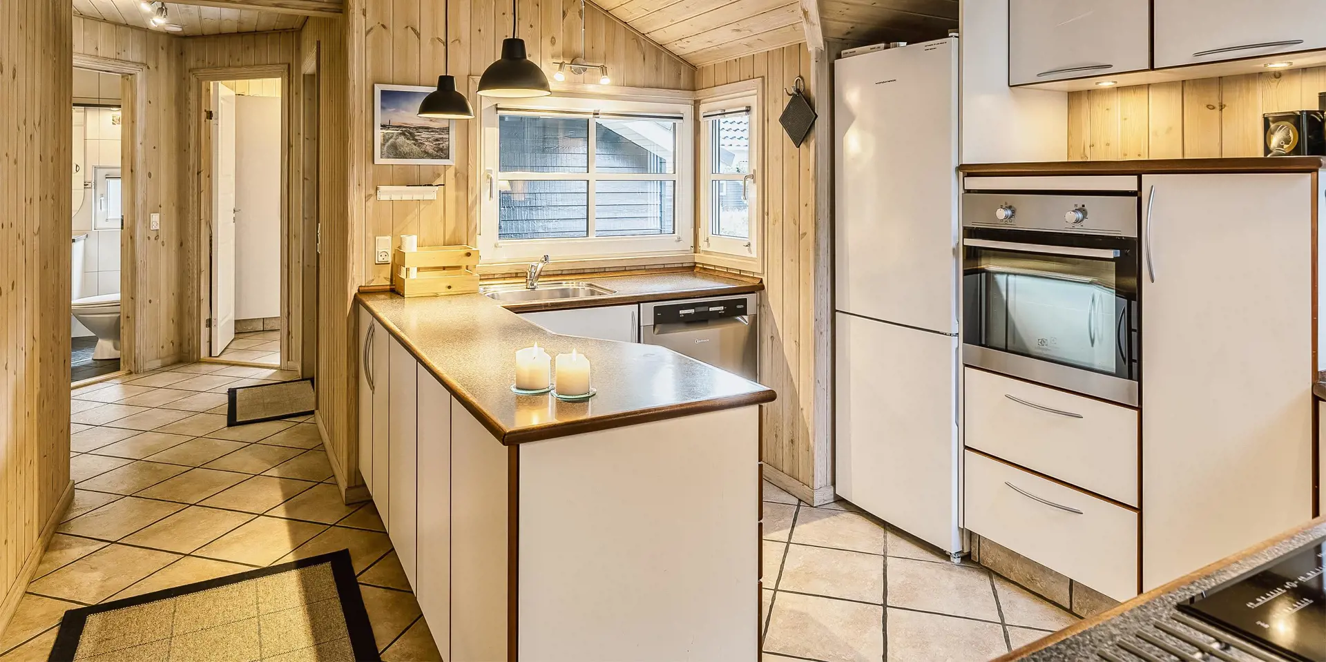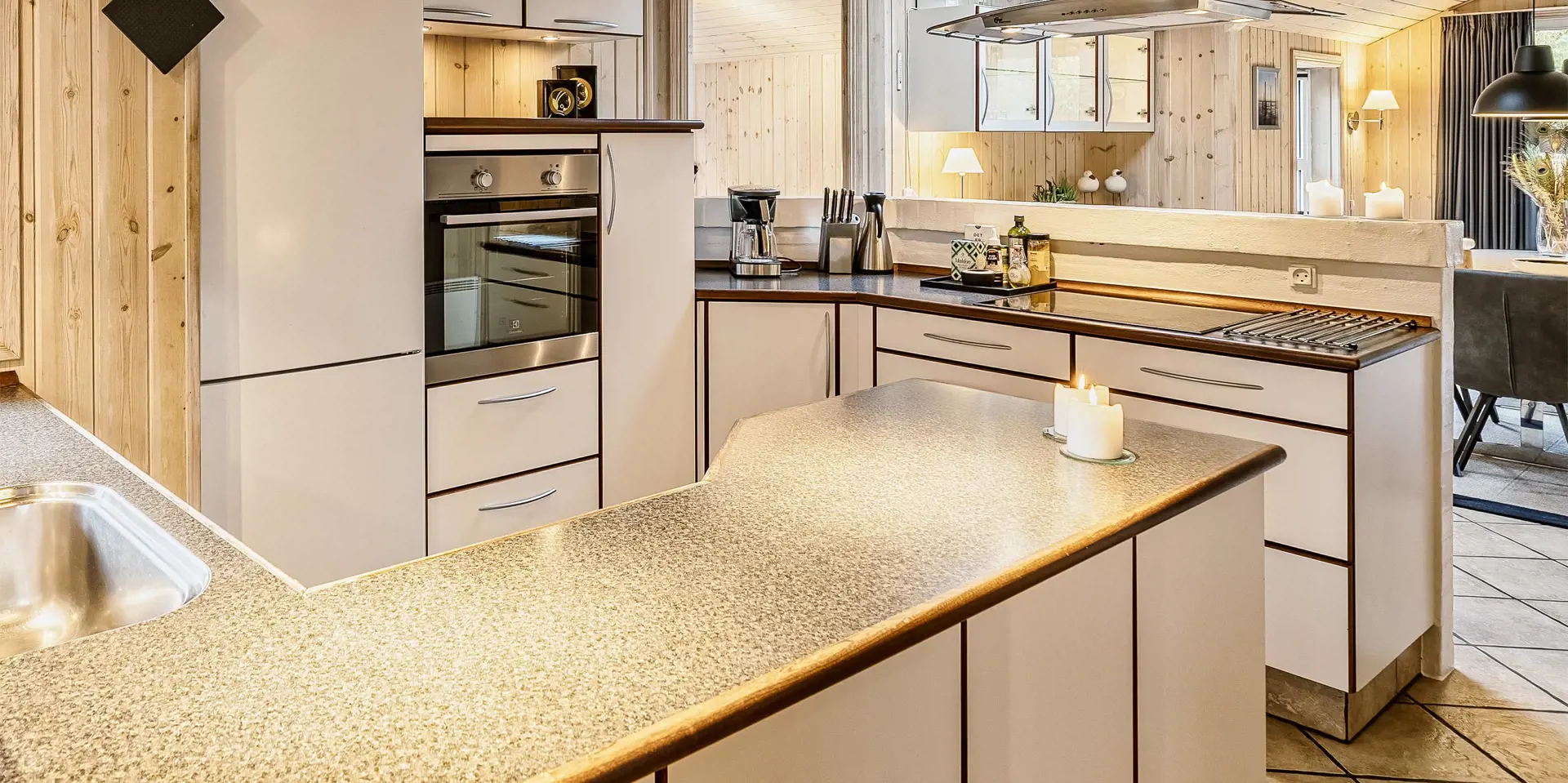 Freundliches und hell ausgestattetes Ferienhaus auf einem großen Grundstück für 8 Personen und von Bäumen umgeben. Der Strand ist rund 1 Km vom Haus entfernt. Die Terrasse ist grosszügig ums Haus verlegt und im vorderen Bereich geht es bis zum Carport ran. Auf den Grundstück befindet sich ein Schelter (Übernachtungshütte) für "hygge" oder Übernachtung. Das Carport ist ebenfalls mit einer Fliese verlegt. So haben Sie die Möglichkeit trockenen Fusses (ohne Matsch an den Schuhen) ins Ferienhaus zu gelangen. Ein kleiner Teil der Terrasse ist sogar überdacht. Das Wohnzimmer verfügt über einen Kaminofen, den Sie gut von der Rundsitzecke aus beobachten können. Das deutsche Fernsehprogramm empfangen Sie über Stofa, daher sind es nur 5-8 Kanäle die Sie empfangen können. Der Wohnbereich ist offen zur Küche. Die Küche verfügt über einen Herd mit Cerankochfeld, einem Backofen in Arbeitshöhe, einer Geschirrspülmaschine und einer Mikrowelle. Es gibt insgesamt 4 Schlafzimmer im Hause: DB + DB + DB + 2B. Das große Badezimmer hat ein WC, ein Handwaschbecken (in einer großen Arbeitsfläche eingelassen und bietet daher auch die Möglichkeit für einen Platz als Wickeltisch), eine Dusche, eine Handtuchhaltereizung, eine Sauna und der Whirlpool ist hier auch aufgestellt. Das kleinere Badezimmer hat ein WC, ein Handwaschbecken und eine Dusche. Im Hauswirtschaftsraum ist die Waschmaschine und er Trockner untergebracht. Es befindet sich eine Warmepumpe im Ferienhaus. Mit dieser Warmepumpe haben sie die Möglichkeit die Stromkosten zu senken, denn die Warmepumpe ist energiesparend. Das Ferienhaus verfügt über einen Internetanschluss (W-Lan). Rauchen ist nicht erlaubt. Es sind keine Haustiere erlaubt! Das Ferienhaus ist 2001 erbaut.