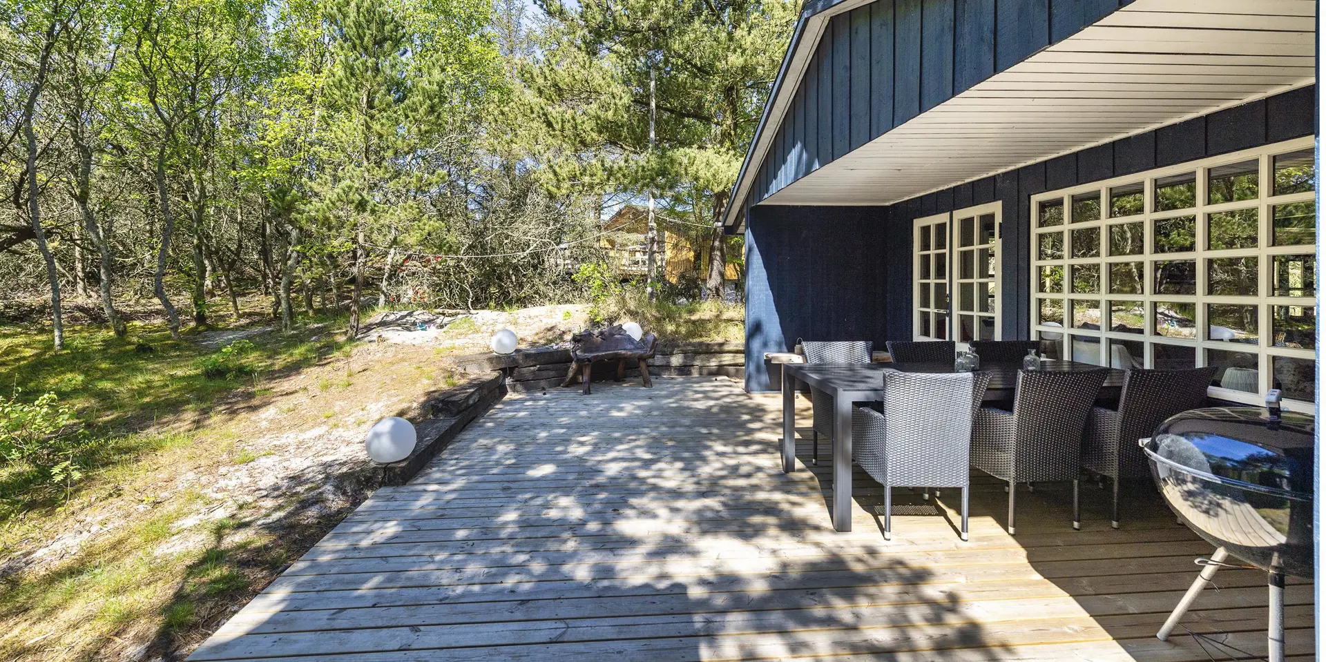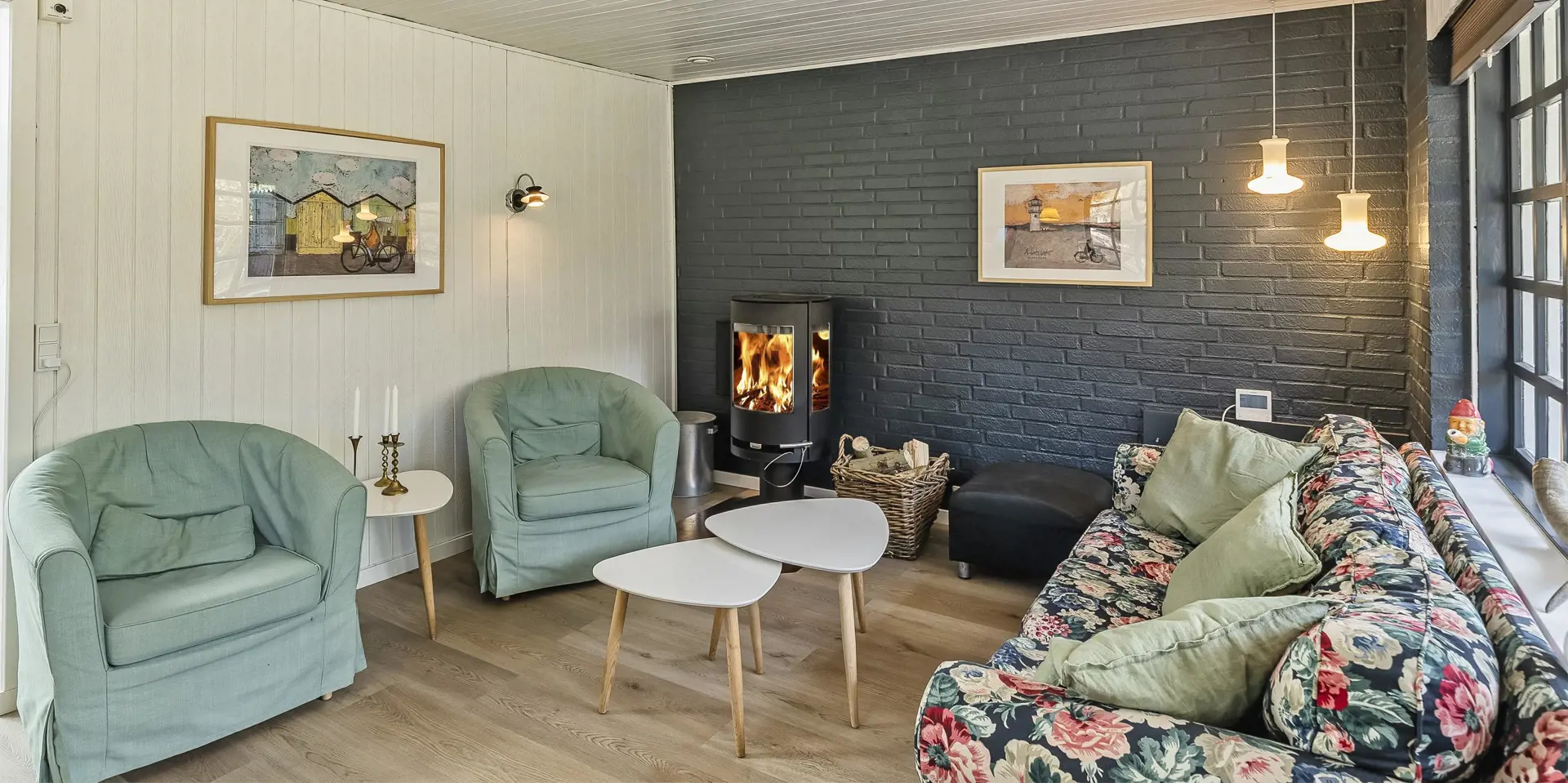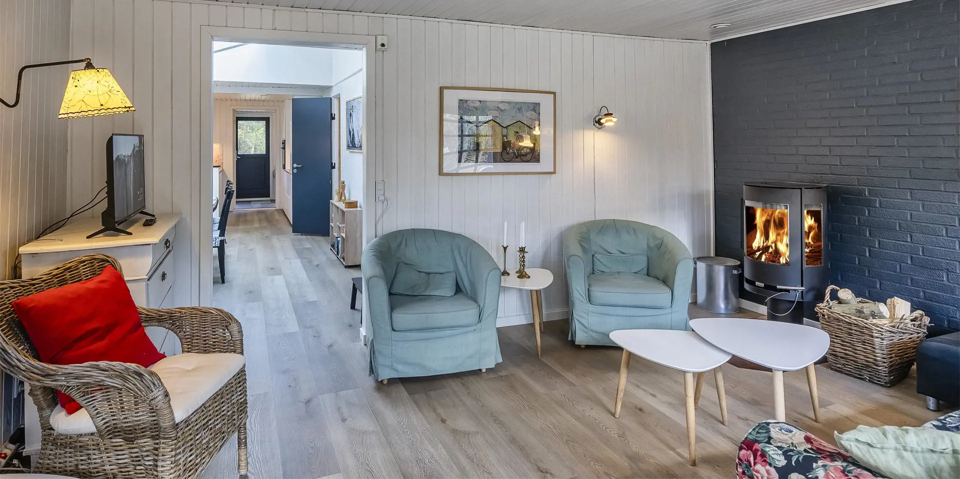 Dieses gemütlich und modern eingerichtete Ferienhaus liegt in Mitten eines Waldes, umgeben von Bäumen und Sträuchern. Das Haus ist für 6 Personen ausgestattet und liegt ca. 900 Meter vom Strand entfernt. Das Wohnzimmer ist mit seinen Möbeln nett eingerichtet und verfügt über einen Kamin. Chromecast. Die Küche ist zum Essbereich hin offen gehalten und verfügt über einen Herd mit Cerankochfelsd, einer Mikrowelle, einem Backofen, einer Geschirrspülmaschine und einem Kühlschrank. Der Essbereich ist hell und freundlich und bietet für alle seine Bewohner genügend Platz. Das Badezimmer ist mit einem WC, einem Handwaschbecken und einer Dusche ausgestattet (wurde renoviert 2020). Die Waschmaschine und ein Trockner sind hier ebenfalls untergebracht. Es gibt insgesamt drei Schlafzimmer: DB + DB + EB. Der freundliche Eingangsbereich ist gefliesst und bietet reichlich Platz für Jacken und Schuhe. Hinten am Ferienhaus ist auch eine kleine Terrasse, wobei auch ein kleiner Teil überdacht ist. Das Ferienhaus verfügt über einen Internetanschluss (W-Lan). Das Rauchen im Ferienhaus ist nicht erlaubt. Es sind keine Haustiere erlaubt, mit Ausnahme ein kleiner Hund mit max. Rückenhöhe von 30 cm. Das Ferienhaus ist in 1963 erbaut worden und laufend renoviert.