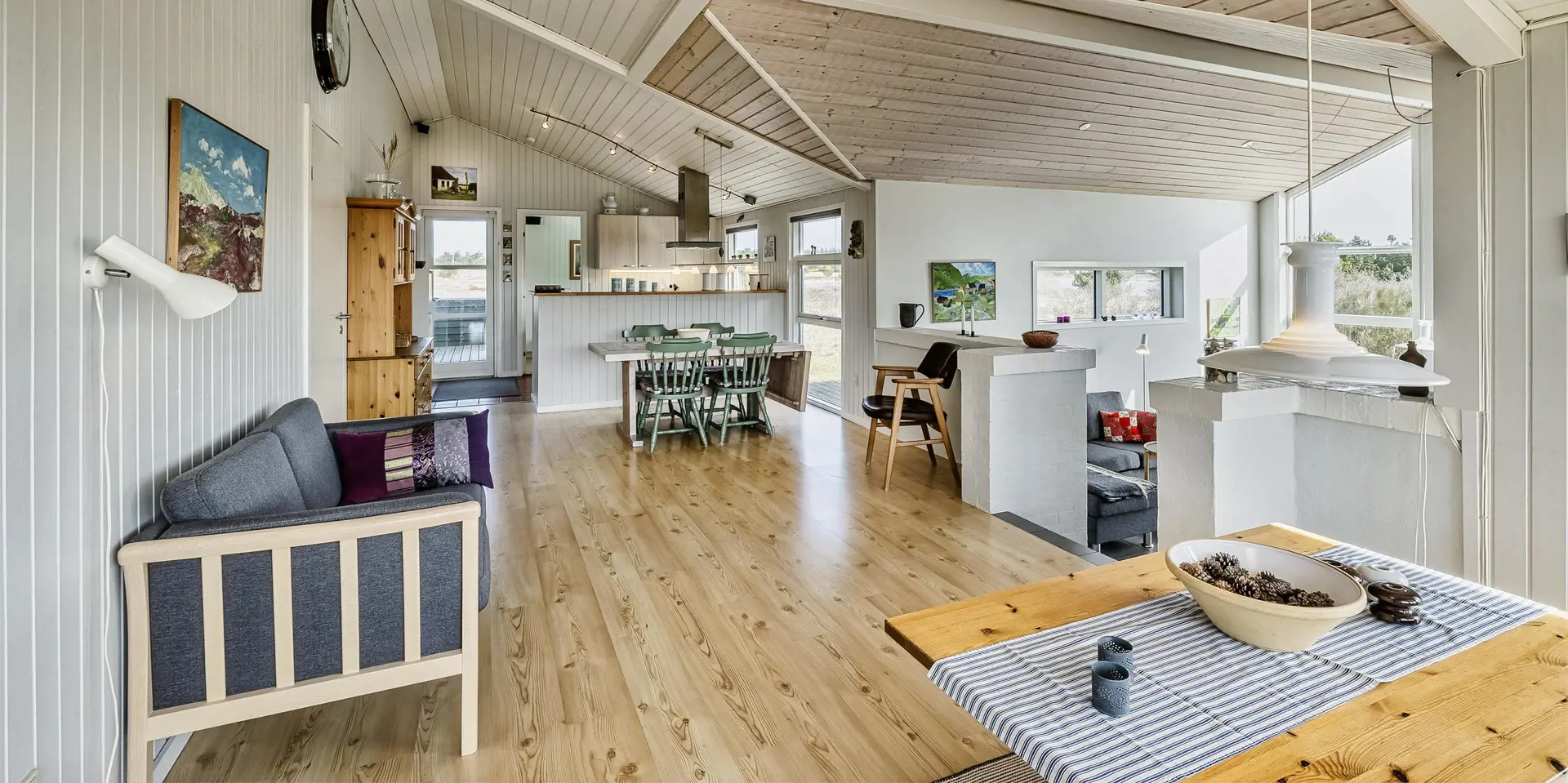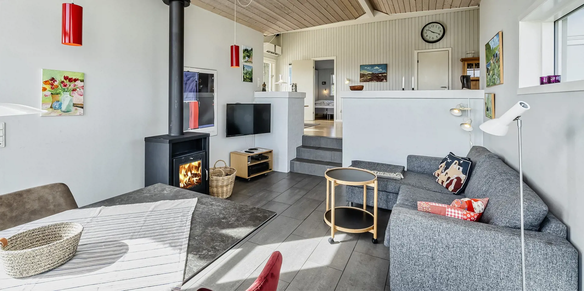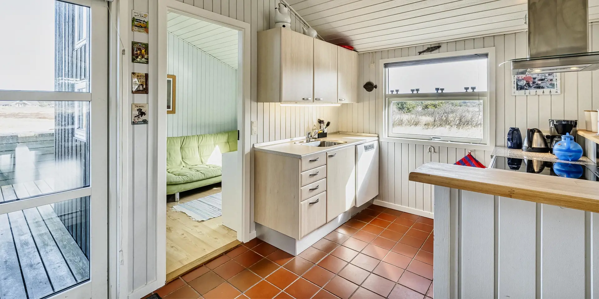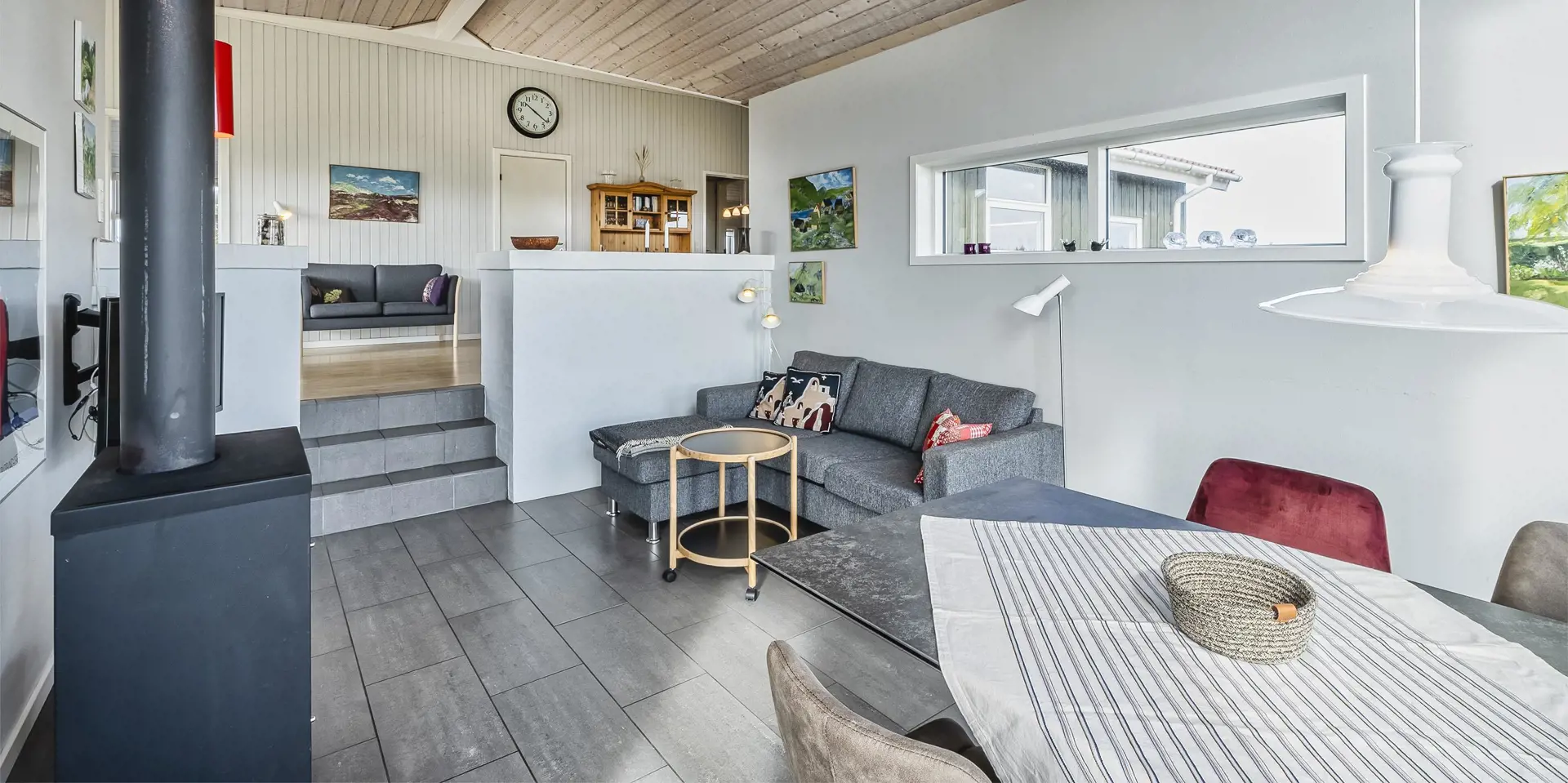 Freundlich ausgestattetes Ferienhaus für bis zu 4 Personen. Dieses Ferienhaus liegt nur 800 Meter vom Strand entfernt. Genießen Sie Ihren Kaffee doch auf der teilweise überdachten Terrasse und lauschen dem Meer zu oder haben einfach nur einen tollen Blick auf den kleinen See im Jafdalvej. Der Wohn- und Essbereich ist in zwei Bereiche aufgeteilt. Die gemütliche Sofaecke mit Blick auf den Kamin erreichen Sie über drei kleine Stufen, die Sie runter gehen. Dieser Bereich ist angebaut und mit einer hübschen Bodenfliese ausgestattet und auch der Kamin befindet sich hier und gibt eine wohlige Wärme ab. Ein weiterer Wohnbereich ist geradezu vom Eingangsbereich und mit Laminat versehen und mit Fussbodenheizung ausgestattet. Es befindet sich eine Warmepumpe im Ferienhaus. Mit dieser Warmepumpe haben sie die Möglichkeit die Stromkosten zu senken, denn die Warmepumpe ist energiesparend. Das deutsche Fernsehprogramm empfangen Sie über eine Parabol-Antenne, aber auch dänische DR programme können empfangen werden. Desweiteren steht Ihnen Google Chrome Cast zur Verfügung. Die offene Küche verfügt über einen Herd mit Cerankochfeld, einem Backofen, einer Mikrowelle,einer Geschirrspülmaschine und einer Kühl- und Gefrierkombination. Das Badezimmer ist mit einem WC, einer Dusche und einem Handwaschbecken ausgestattet. Desweiteren gibt es hier eine Fussbodenheizung. Ebenfalls befindet sich die Sauna und eine Waschmaschine im Badezimmer. Es sind 3 Schlafzimmer vorhanden. 2 Schlafzimmer DB + 2B. In dem dritten Zimmer befindet sich nur ein Schlafsofa. Es befindet sich ein Internetanschluss (W-Lan - 30/30) im Ferienhaus. Das Rauchen ist nicht erlaubt. Es sind keine Haustiere erlaubt. Das Ferienhaus ist 1987 erbaut und in 2009 renoviert.