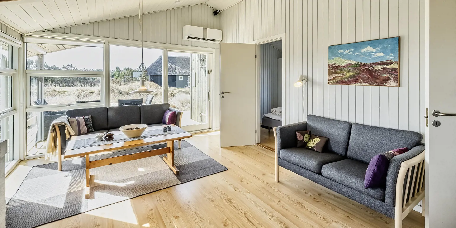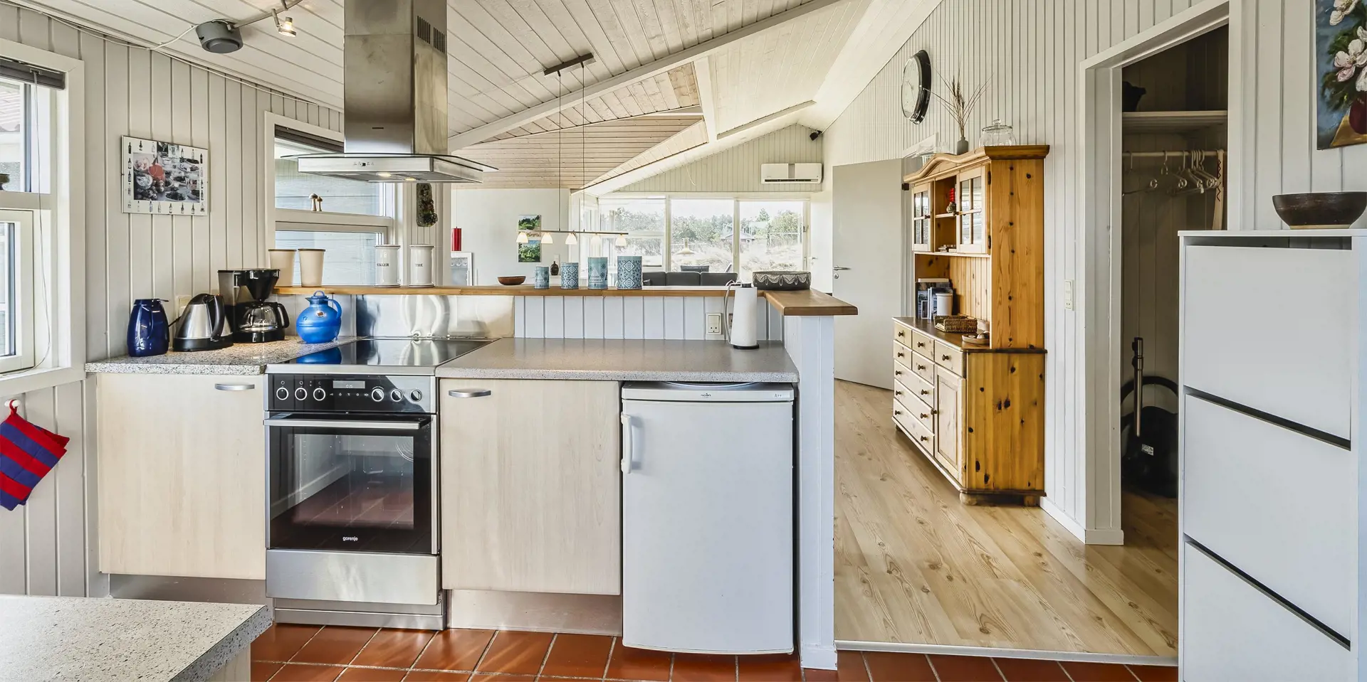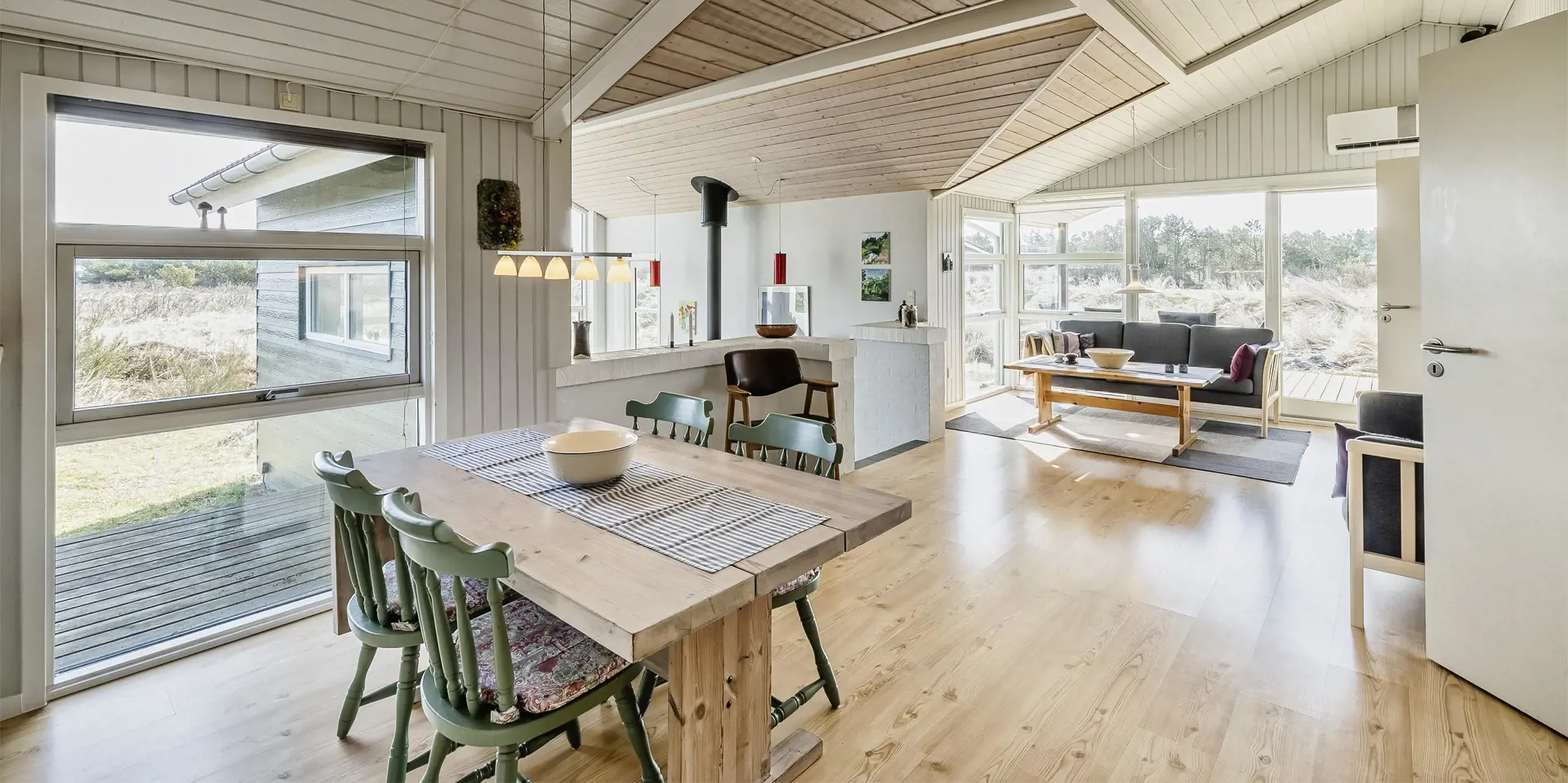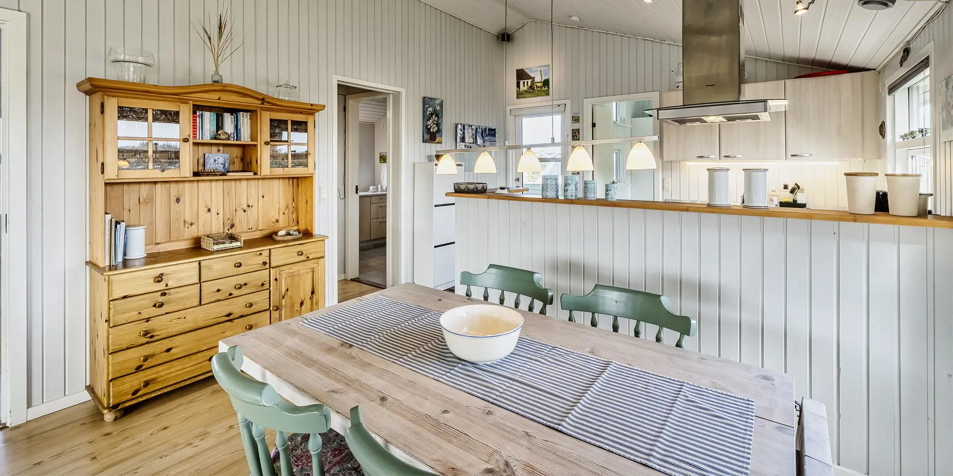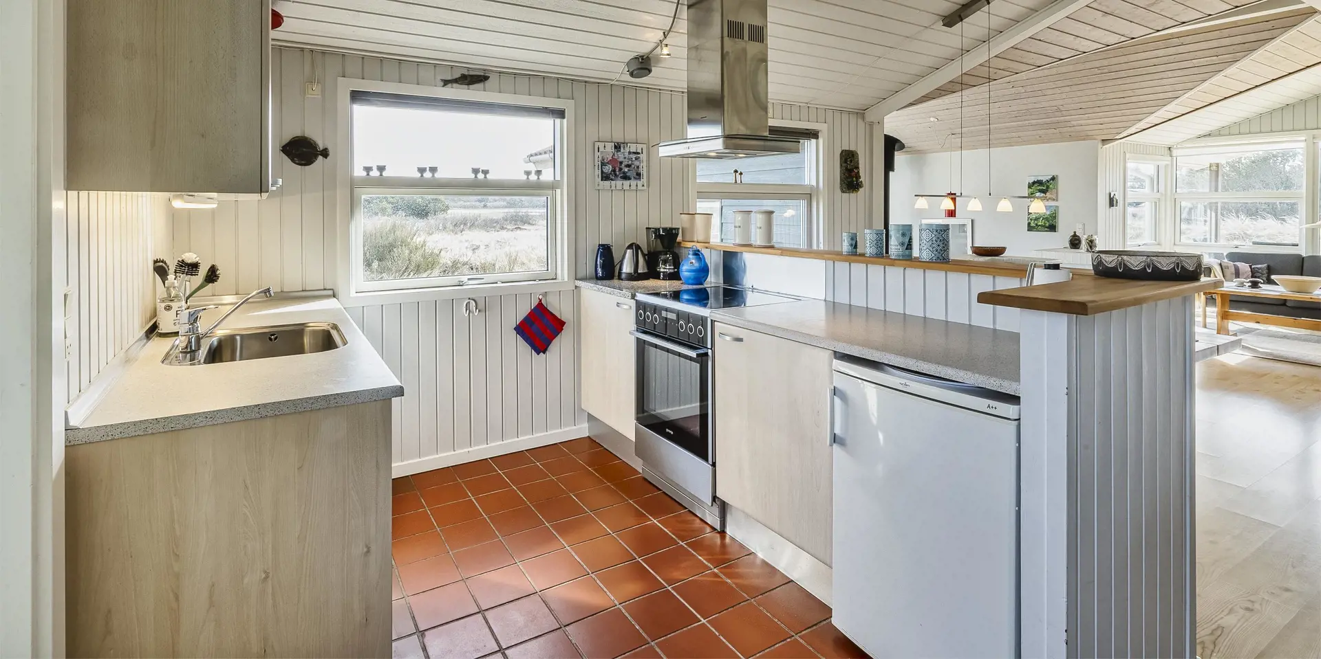 Freundlich ausgestattetes Ferienhaus für bis zu 4 Personen. Dieses Ferienhaus liegt nur 800 Meter vom Strand entfernt. Genießen Sie Ihren Kaffee doch auf der teilweise überdachten Terrasse und lauschen dem Meer zu oder haben einfach nur einen tollen Blick auf den kleinen See im Jafdalvej. Der Wohn- und Essbereich ist in zwei Bereiche aufgeteilt. Die gemütliche Sofaecke mit Blick auf den Kamin erreichen Sie über drei kleine Stufen, die Sie runter gehen. Dieser Bereich ist angebaut und mit einer hübschen Bodenfliese ausgestattet und auch der Kamin befindet sich hier und gibt eine wohlige Wärme ab. Ein weiterer Wohnbereich ist geradezu vom Eingangsbereich und mit Laminat versehen und mit Fussbodenheizung ausgestattet. Es befindet sich eine Warmepumpe im Ferienhaus. Mit dieser Warmepumpe haben sie die Möglichkeit die Stromkosten zu senken, denn die Warmepumpe ist energiesparend. Das deutsche Fernsehprogramm empfangen Sie über eine Parabol-Antenne, aber auch dänische DR programme können empfangen werden. Desweiteren steht Ihnen Google Chrome Cast zur Verfügung. Die offene Küche verfügt über einen Herd mit Cerankochfeld, einem Backofen, einer Mikrowelle,einer Geschirrspülmaschine und einer Kühl- und Gefrierkombination. Das Badezimmer ist mit einem WC, einer Dusche und einem Handwaschbecken ausgestattet. Desweiteren gibt es hier eine Fussbodenheizung. Ebenfalls befindet sich die Sauna und eine Waschmaschine im Badezimmer. Es sind 3 Schlafzimmer vorhanden. 2 Schlafzimmer DB + 2B. In dem dritten Zimmer befindet sich nur ein Schlafsofa. Es befindet sich ein Internetanschluss (W-Lan - 30/30) im Ferienhaus. Das Rauchen ist nicht erlaubt. Es sind keine Haustiere erlaubt. Das Ferienhaus ist 1987 erbaut und in 2009 renoviert.