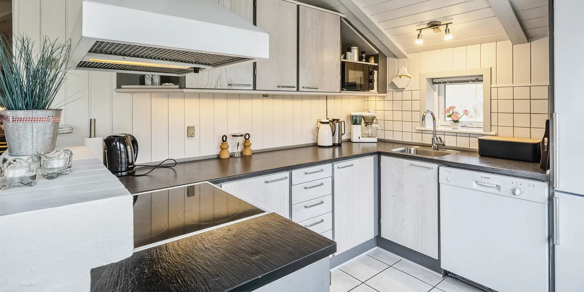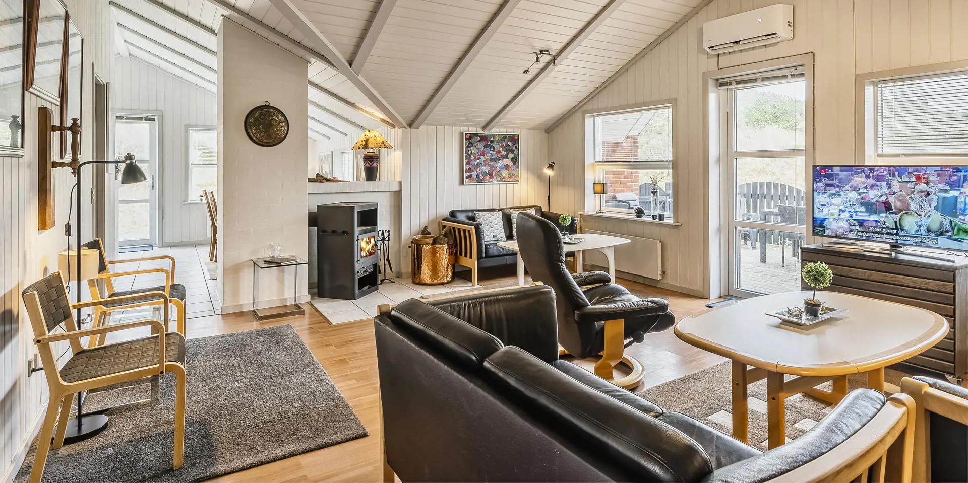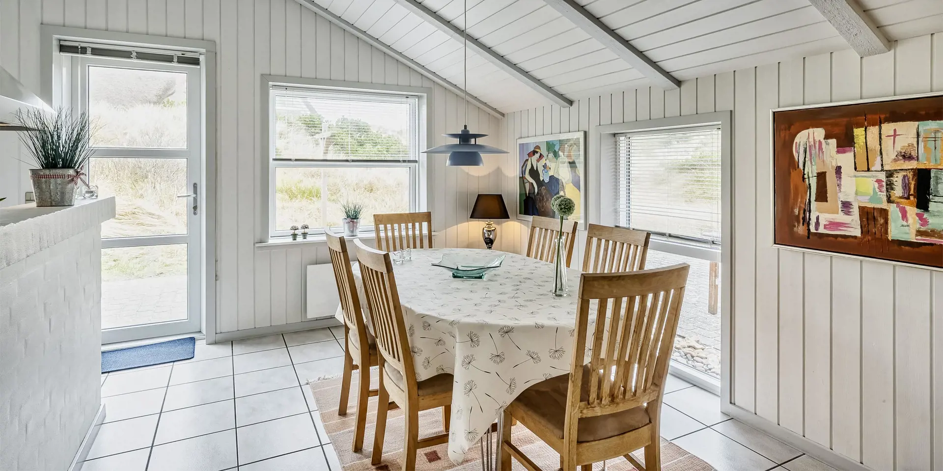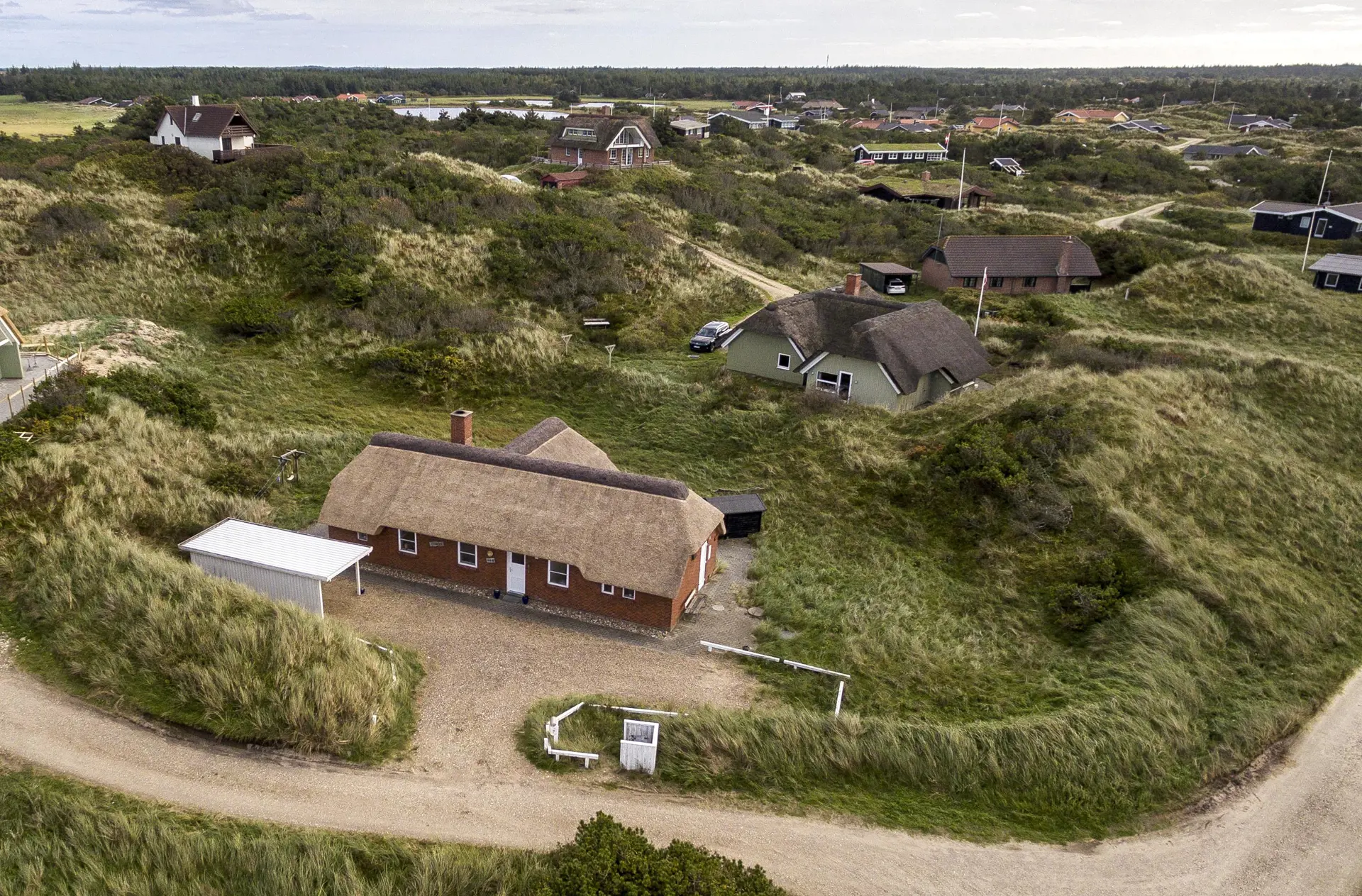 Geschmackvolles Reetdachhaus auf einem Naturgrundstück in Mitten der Dünenlandschaft gelegen. Das Ferienhaus ist für 6-8 Personen ausgestattet und der Strand ist nur 200 Meter vom Ferienhaus entfernt. Das Wohnzimmer ist nett eingerichtet und mit einem Kamin ausgestattet. Das Fernsehprogramm empfangen Sie über Stofa, daher sind nur 5-8 deutsche Kanäle zu empfangen. In dem kleinen Eingangsbereich haben Sie Platz für Jacken und Schuhe. Der Wohnbereich ist zum Ess- und Küchenbereich offen gehalten. Dieser Bereich ist gefliest. Die Küche ist mit einem Herd mit Cerankochfeld, einem Backofen, einer Mikrowelle, einer Geschirrspülmaschine und einer Kühl- und Gefrierkombination ausgestattet. Das große Badezimmer ist mit einem WC, einem Handwaschbecken, einer Dusche und einer Sauna ausgestattet. Desweiteren befindet sich eine Badewanne hier im Bad. Genügend Ablagefläche für Ihre Badeutensilien ist hier vorhanden. Eine fest installierte Holzsitzbank für Ihre Handtuch und Ihre Wäsche ist hier aufgestellt. Eine Waschmaschine und ein Trockner steht zur Benutzung bereit. Es gibt insgesamt drei Schlafzimmer im Ferienhaus: DB + DB + 4B. Die Etagenbetten sind eher für Kinder als für Erwachsene gedacht. Es befindet sich eine Warmepumpe im Ferienhaus. Mit dieser Warmepumpe haben sie die Möglichkeit die Stromkosten zu senken, denn die Warmepumpe ist energiesparend. Es steht eine großzügiger Terrassenbereich zur Verfügung und eine großer Teil ist sogar eingezäunt und davon sogar auch teilweise überdacht. Das Ferienhaus verfügt über einen Internetanschluss (W-Lan). Für Ihr Fahrzeug, steht das Carport auf dem Grundstück zur Verfügung. Für die Kleinen Gäste ist ein kleines Spielhaus vorhanden. Es ist max. ein Haustier erlaubt. Das Rauchen ist nicht gestattet. Das Ferienhaus ist 1991 erbaut worden.
