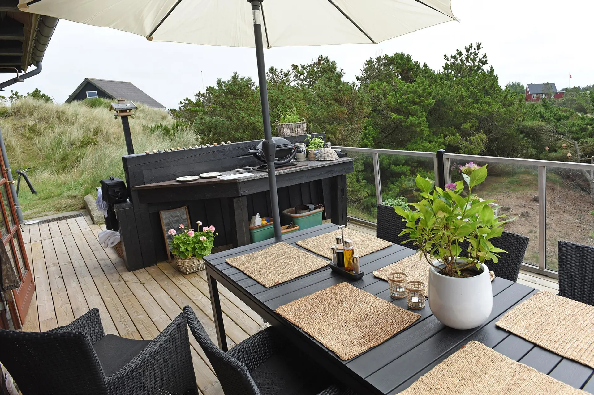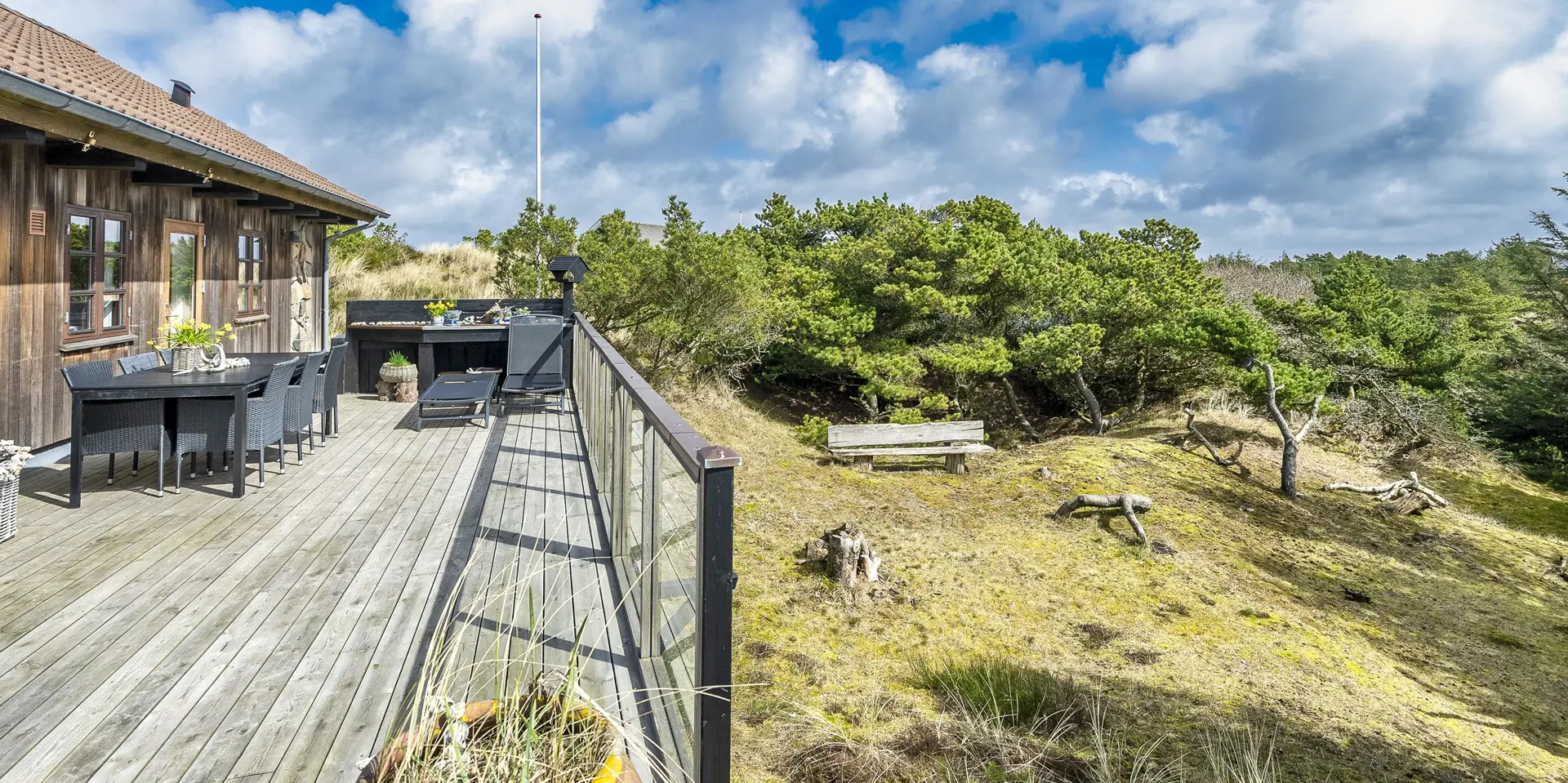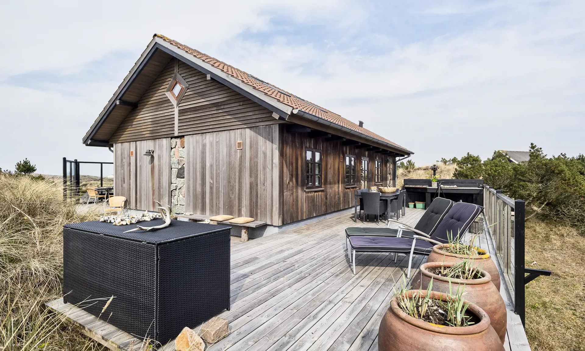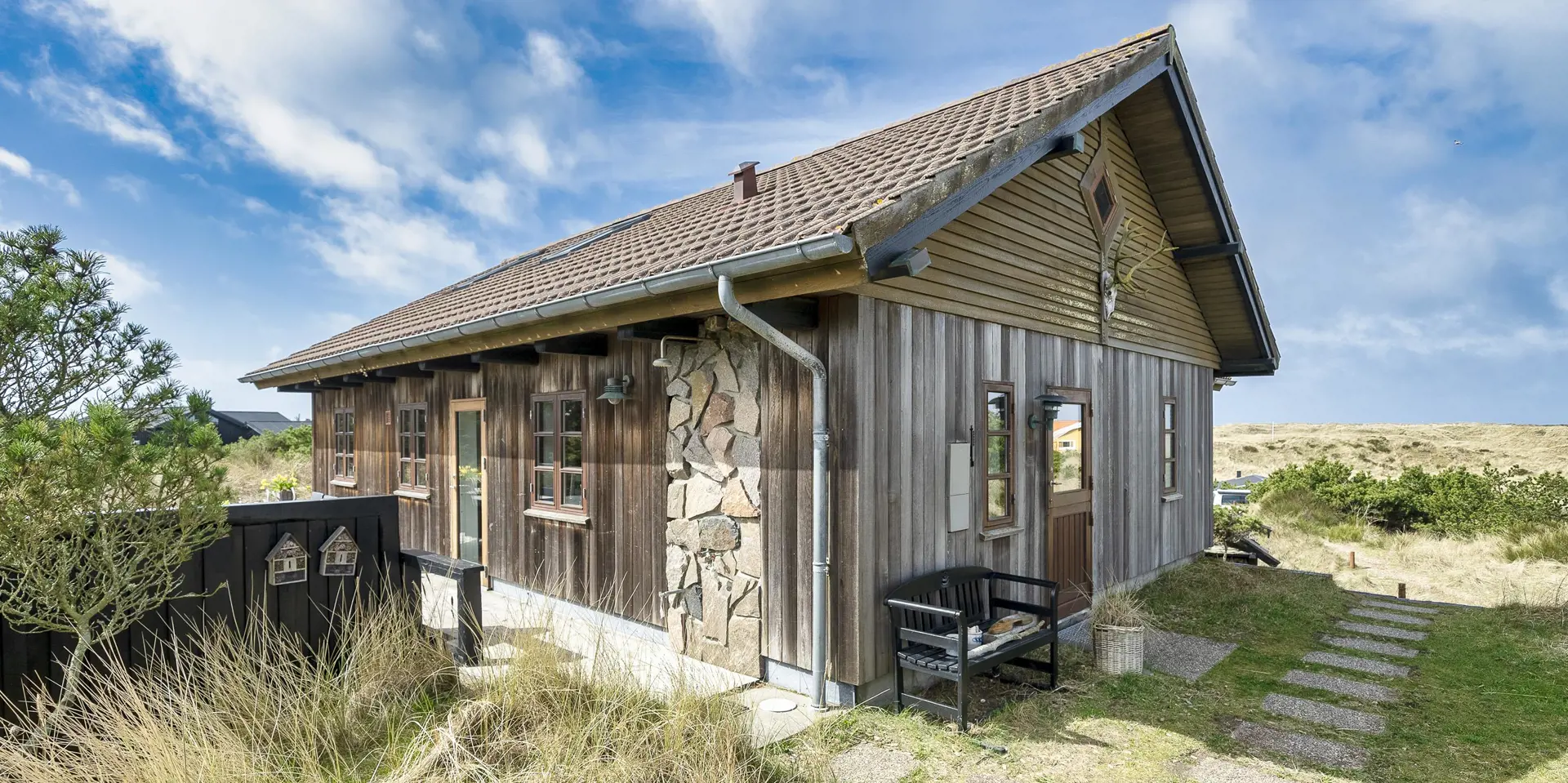 Dieses vom Eigentümer selbst instand gesetzte Holzhaus liegt oben auf einer großen Düne und hat einen wunderbaren Blick über das Feriengebiet. Das Auto kann nicht bis an das Haus gefahren werden, denn zum Ferienhaus gelangen Sie nur über den längeren Aufstieg. Das Ferienhaus ist für 4 Personen ausgestattet. Dieses Ferienhaus verzaubert jeden Bewohner, und gibt ihm ein wohliges Gefühl. Zum Strand ist es nur rund 200 Meter. Der Eingangsbereich mit Bad und Küche sind mit einer mediterranen Bodenfliese verlegt worden und strahlen eine angenehme Wärme aus. Dazu kommt, das einige Wände mit der gleichen Farbe an Klinker gemauert sind. Der Wohn- und Essbereich ist mit Laminat verlegt. Die großzügige Rundecke lädt zum Kuscheln und relaxen ein; dazu der eingebaute Kamin an und der Abend kann mit einem Gläschen Wein genossen werden. In einer Ecke neben dem Kamin befindet sich eine kleine Nische, ein Alkoven. Hier ist es urgemütlich um ein kleines Nickerchen zu halten. Das Fernsehprogramm empfangen Sie über Yousee, daher sind nur 3-4 deutsche Kanäle zu empfangen. Es ist auch möglich Netflix zu sehen. Die im Wohnbereich offenen Balken bringen den besonderen Charme ins Ferienhaus. Eine offene Treppe führt in ein oberes Geschoss, das den Bewohnern allerdings nicht zur Verfügung steht. Dies ist Privat, ebenso der Balkon, den Sie auch nur vom oberen Geschoss begehen können. Die Essecke ist mit hübschen, teilweise antiken Möbeln ausgestattet. Die Küche im Landhaus-Stil hat einen Zugang zur Terrasse und lädt unwillkürlich zum Kochen ein. Die Ausstattung ist mit einem Gasherd (4 Kochstellen), einem Backofen in Arbeitshöhe, einer Geschirrspülmaschine und einer Kühl- und Gefrierkombination ausgestattet. Vom Eingangsbereich geht das Badezimmer ab, das beinhaltet ein WC, eine Dusche und ein Handwaschbecken, das in einer hübschen Arbeitsplatte eingefasst ist. Auch hier finden Sie die Waschmaschine. Sie haben 2 Schlafzimmer: DB + 2B. Ein weiterer Ausgang zur Terrasse ist vom Wohnzimmer. Auf der gesamten Terrassenfläche ist genügend Platz um ein Sonnenbad zu nehmen, in einem schattigen Plätzchen ein Buch zu lesen oder auf um eine kleine Grillparty zu halten. Zusätzlich haben Sie eine Außendusche und ein Internetanschluss (W-Lan) befindet sich auch im Ferienhaus. Das Haus ist für Kleinkinder nicht geeignet. Es sind keine Haustiere erlaubt, mit Ausnahme ein kleiner Hund mit max. Rückenhöhe von 30 cm. Das Rauchen ist nicht gestattet. Das Ferienhaus ist 1999 erbaut. Das Ferienhaus verfügt über ein Gas Weber Grill. Bitte beachten Sie: Sie müssen selber für Gas für den Grill sorgen, und der Grill muss nach Gebrauch wieder gereinigt zurück gestellt werden.