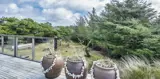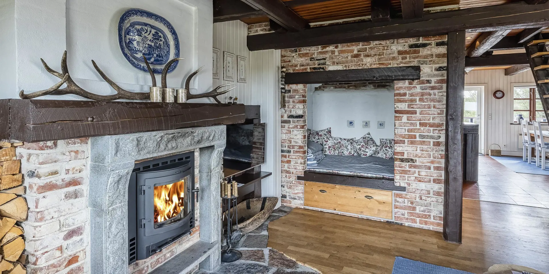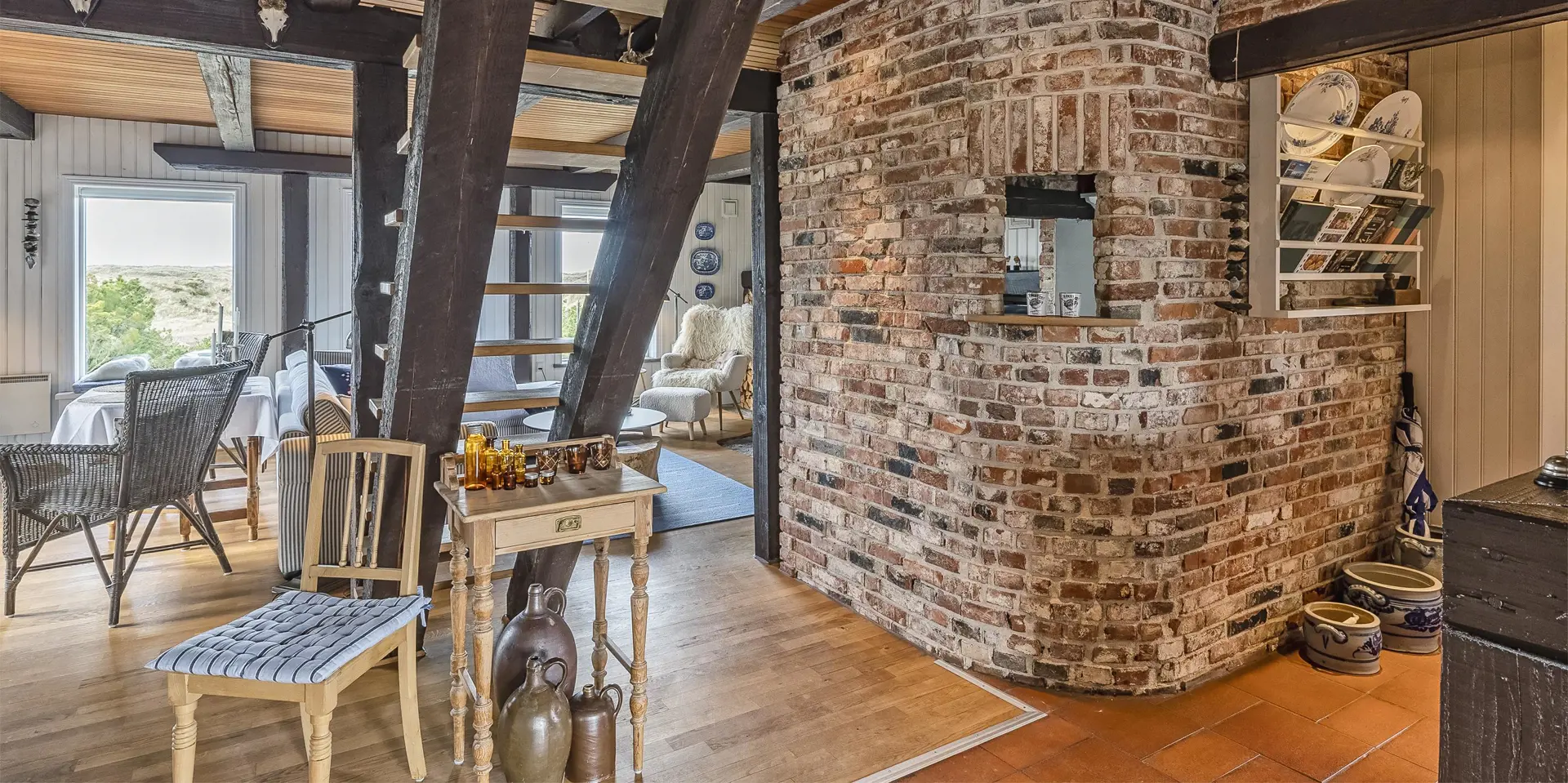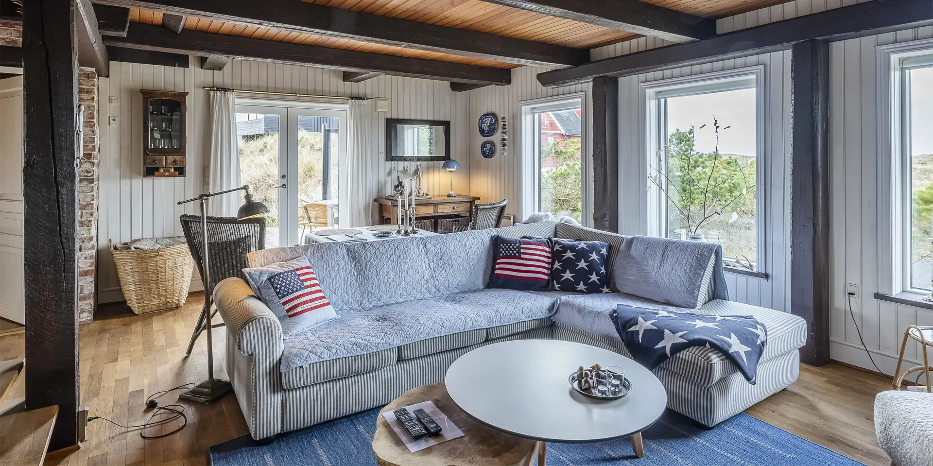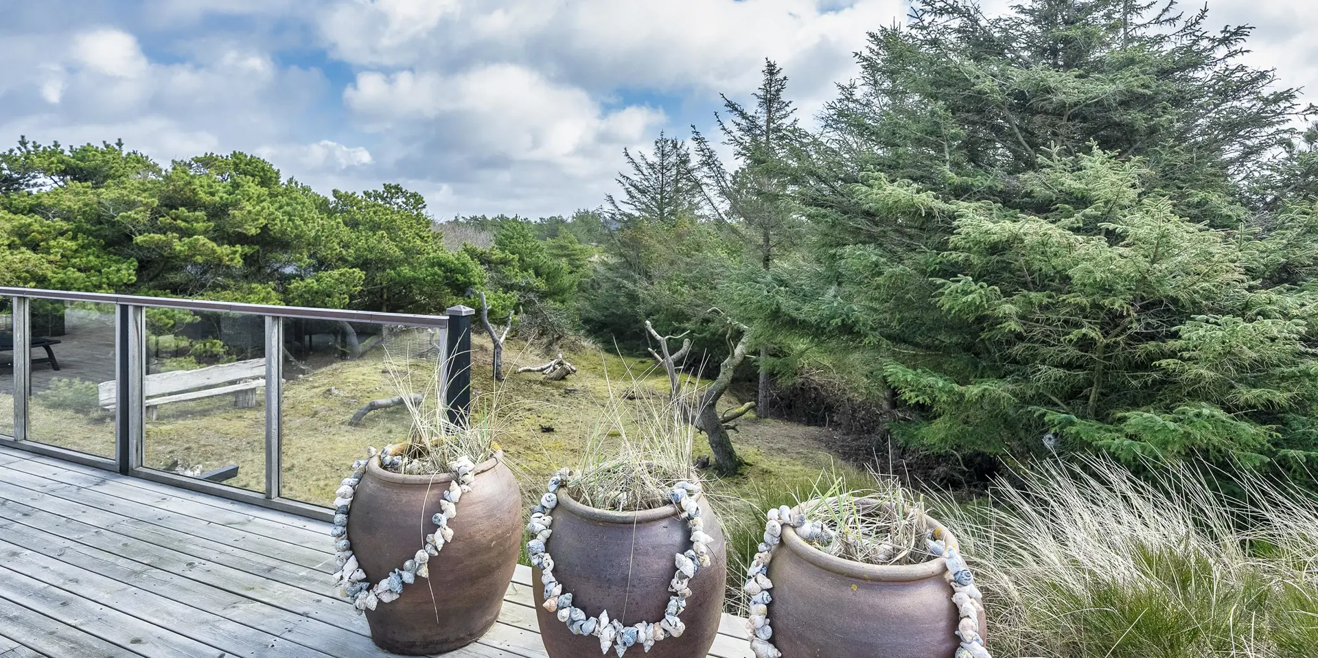 Dieses vom Eigentümer selbst instand gesetzte Holzhaus liegt oben auf einer großen Düne und hat einen wunderbaren Blick über das Feriengebiet. Das Auto kann nicht bis an das Haus gefahren werden, denn zum Ferienhaus gelangen Sie nur über den längeren Aufstieg. Das Ferienhaus ist für 4 Personen ausgestattet. Dieses Ferienhaus verzaubert jeden Bewohner, und gibt ihm ein wohliges Gefühl. Zum Strand ist es nur rund 200 Meter. Der Eingangsbereich mit Bad und Küche sind mit einer mediterranen Bodenfliese verlegt worden und strahlen eine angenehme Wärme aus. Dazu kommt, das einige Wände mit der gleichen Farbe an Klinker gemauert sind. Der Wohn- und Essbereich ist mit Laminat verlegt. Die großzügige Rundecke lädt zum Kuscheln und relaxen ein; dazu der eingebaute Kamin an und der Abend kann mit einem Gläschen Wein genossen werden. In einer Ecke neben dem Kamin befindet sich eine kleine Nische, ein Alkoven. Hier ist es urgemütlich um ein kleines Nickerchen zu halten. Das Fernsehprogramm empfangen Sie über Yousee, daher sind nur 3-4 deutsche Kanäle zu empfangen. Es ist auch möglich Netflix zu sehen. Die im Wohnbereich offenen Balken bringen den besonderen Charme ins Ferienhaus. Eine offene Treppe führt in ein oberes Geschoss, das den Bewohnern allerdings nicht zur Verfügung steht. Dies ist Privat, ebenso der Balkon, den Sie auch nur vom oberen Geschoss begehen können. Die Essecke ist mit hübschen, teilweise antiken Möbeln ausgestattet. Die Küche im Landhaus-Stil hat einen Zugang zur Terrasse und lädt unwillkürlich zum Kochen ein. Die Ausstattung ist mit einem Gasherd (4 Kochstellen), einem Backofen in Arbeitshöhe, einer Geschirrspülmaschine und einer Kühl- und Gefrierkombination ausgestattet. Vom Eingangsbereich geht das Badezimmer ab, das beinhaltet ein WC, eine Dusche und ein Handwaschbecken, das in einer hübschen Arbeitsplatte eingefasst ist. Auch hier finden Sie die Waschmaschine. Sie haben 2 Schlafzimmer: DB + 2B. Ein weiterer Ausgang zur Terrasse ist vom Wohnzimmer. Auf der gesamten Terrassenfläche ist genügend Platz um ein Sonnenbad zu nehmen, in einem schattigen Plätzchen ein Buch zu lesen oder auf um eine kleine Grillparty zu halten. Zusätzlich haben Sie eine Außendusche und ein Internetanschluss (W-Lan) befindet sich auch im Ferienhaus. Das Haus ist für Kleinkinder nicht geeignet. Es sind keine Haustiere erlaubt, mit Ausnahme ein kleiner Hund mit max. Rückenhöhe von 30 cm. Das Rauchen ist nicht gestattet. Das Ferienhaus ist 1999 erbaut. Das Ferienhaus verfügt über ein Gas Weber Grill. Bitte beachten Sie: Sie müssen selber für Gas für den Grill sorgen, und der Grill muss nach Gebrauch wieder gereinigt zurück gestellt werden.