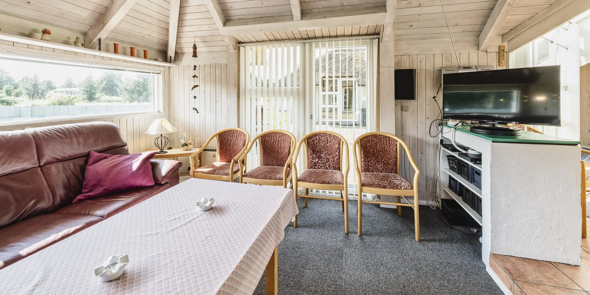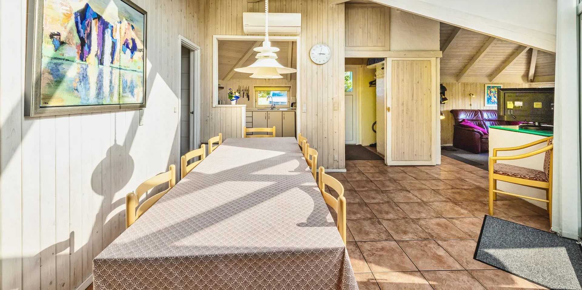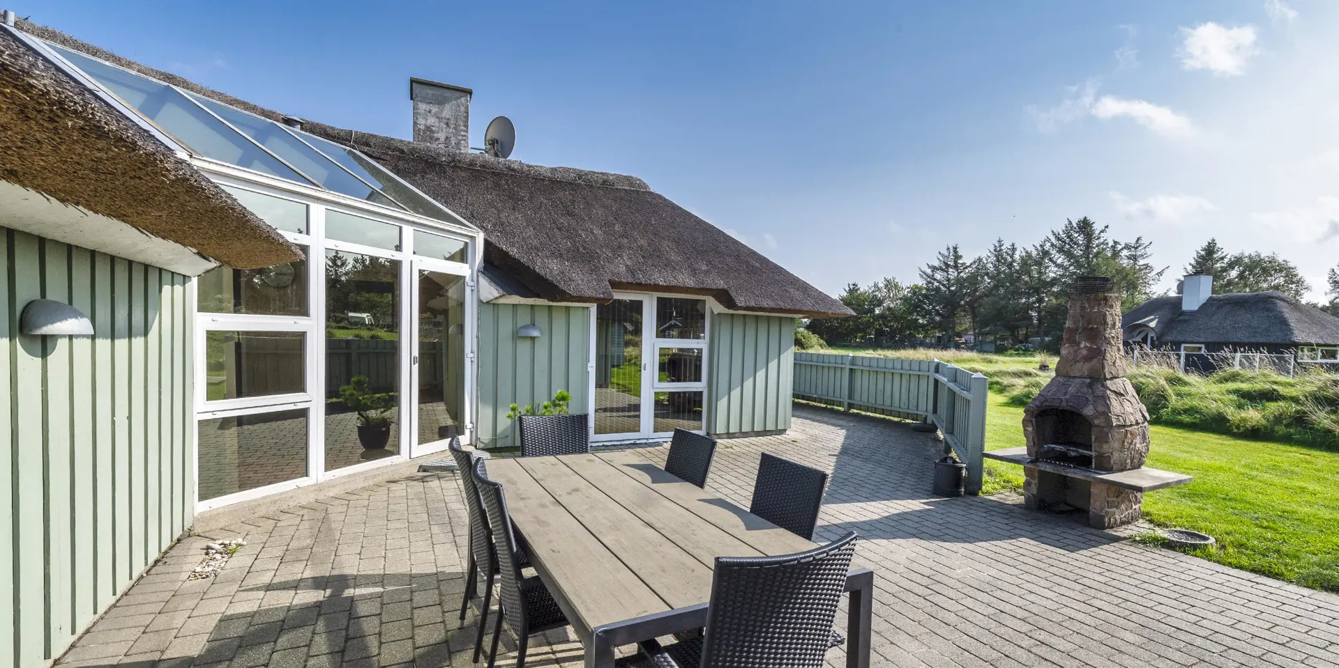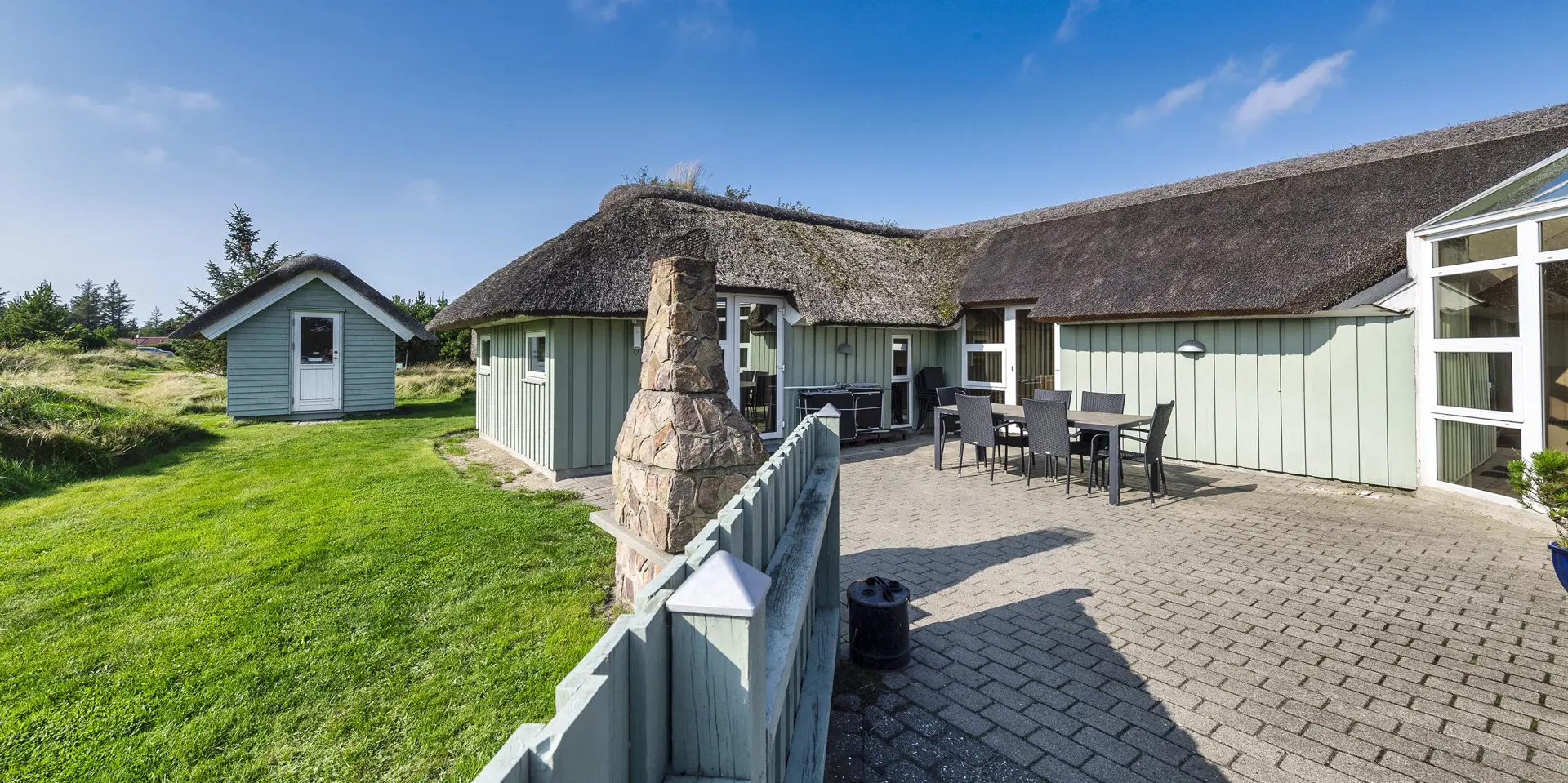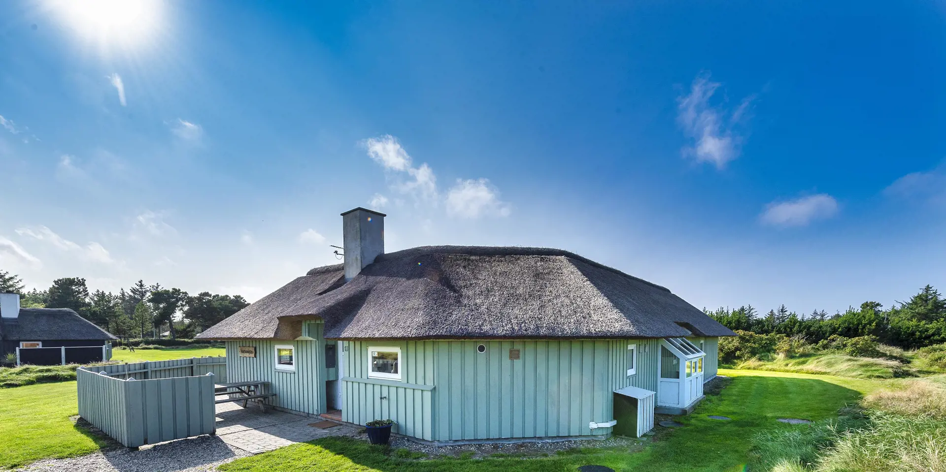 Reetgedecktes Ferienhaus auf einem grossen naturbelassenem Rasengrundstück gelegen mit Namen ”Vesterhavshytten”. Das Ferienhaus bietet Platz für 10 Personen und ist ca. 2 Km vom Strand entfernt. Auf der grossen Rundsitzecke in dem Wohnbereich ist genügend Platz für alle. Dort befindet sich auch der eingebaute Kamin. Kamin zum abend angezündet und ein Glässchen Wein, dann kann man es richtig geniessen. Das Ferienhaus ist mit einer Warmepumpe ausgestattet. Mit dieser Warmepumpe haben Sie die Möglichkeit die Stromkosten zu senken, denn die Warmepumpe ist energiesparend. Das deutsche Fernsehprogramm empfangen Sie über eine Parabolantenne oder Chrome Cast. DVD-Player. Die Küche ist separat und verfügt über einen Herd mit Cerankochfeld, einem Backofen, einer Geschirrspülmaschine, einer Mikrowelle und einer Kühl- und Gefrierkombination. Der Essbereich ist vor der Küche plaziert. Durch die grosse Fensterfront und den Oberlichtern strahlt viel Helligkeit in diesen Bereich. Für alle Bewohner des Hauses stehen insgesamt zwei Bäder zur Verfügung. Beide haben ein WC, ein Handwaschbecken und eine Dusche. Und in dem anderen grösserem Badezimmer befindet sich ein Whirlpool und die Waschmaschine und der Trockner sind hier ebenfalls untergebracht. Über dem Whirlpool gibt es Oberlichter, die mit Rollo´s zugezogen werden können. Ein schönes Bad am Abend zur Entspannung, und dann noch den Sternenhimmel beobachten, was will man mehr. Insgesamt stehen den Gästen fünf Schlafzimmer zur Verfügung: DB + DB + 2B + 2B + 2B. Das Ferienhaus verfügt über einen Internetanschluss (W-Lan)(30/30). Rauchen ist nicht erlaubt. Der Terrassenbereich ist gut angelegt, ähnlich wie ein Innenhof und mit einem festen Stein-Grill ausgestattet, dadurch ist dieser Bereich auch gut geschützt. Hier können Sie am Abend auch einfach mal ein paar Holzscheite reinlegen und haben die dänische “hygge” am Aussen-Kamin. Nur ein Hund erlaubt. Das Ferienhaus ist 1988 erbaut worden und in 2006 renoviert. Gratis Eintritt für das Badeland Oksbøl in 2025.
