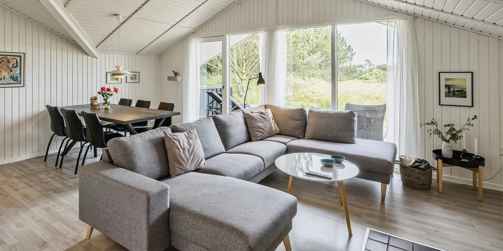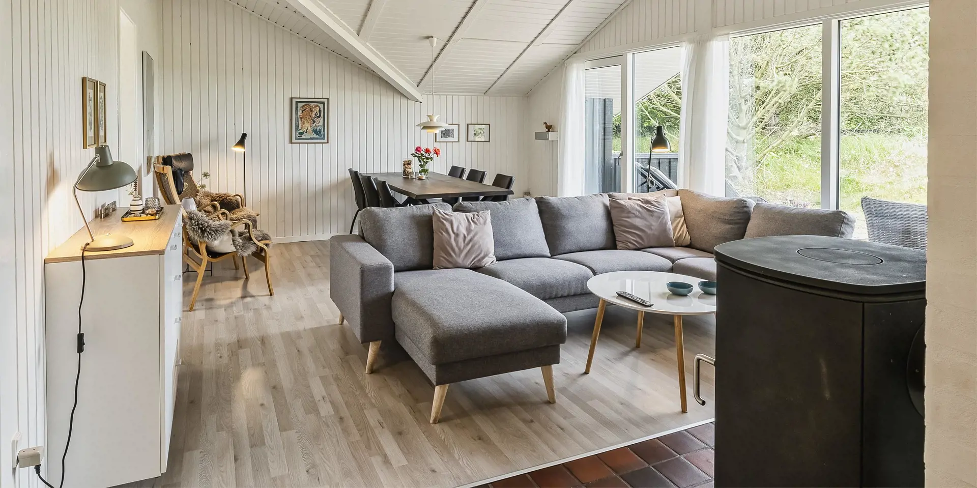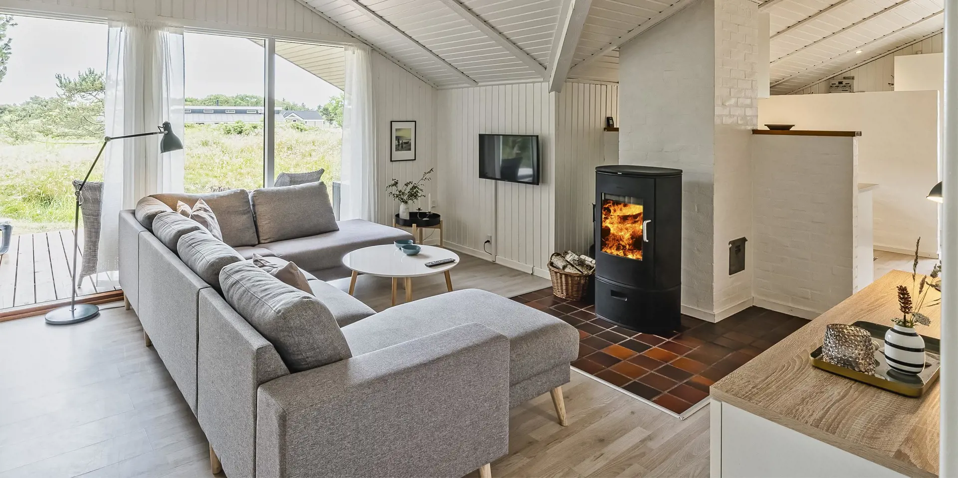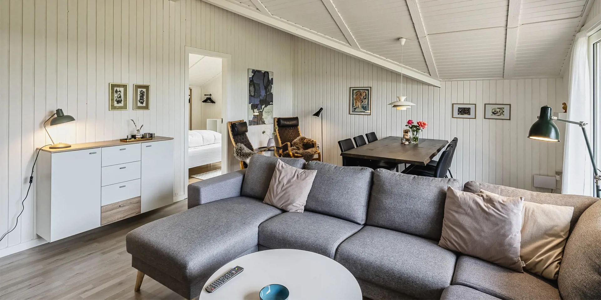 Das Wohnzimmer verfügt über einen Holzofen, einen Smart-TV mit dänischen Kanälen im gesamten Wohnzimmer und eine Satellitenschüssel mit ausländischen Kanälen. Es gibt WLAN zur Nutzung und eine Wärmepumpe. Das Wohnzimmer bietet außerdem einen Essbereich am Ende des Wohnzimmers. Vom Wohnzimmer aus hat man Zugang zu 3 Schlafzimmern: DS + DS + 2S. Badezimmer mit Dusche/WC, Sauna.