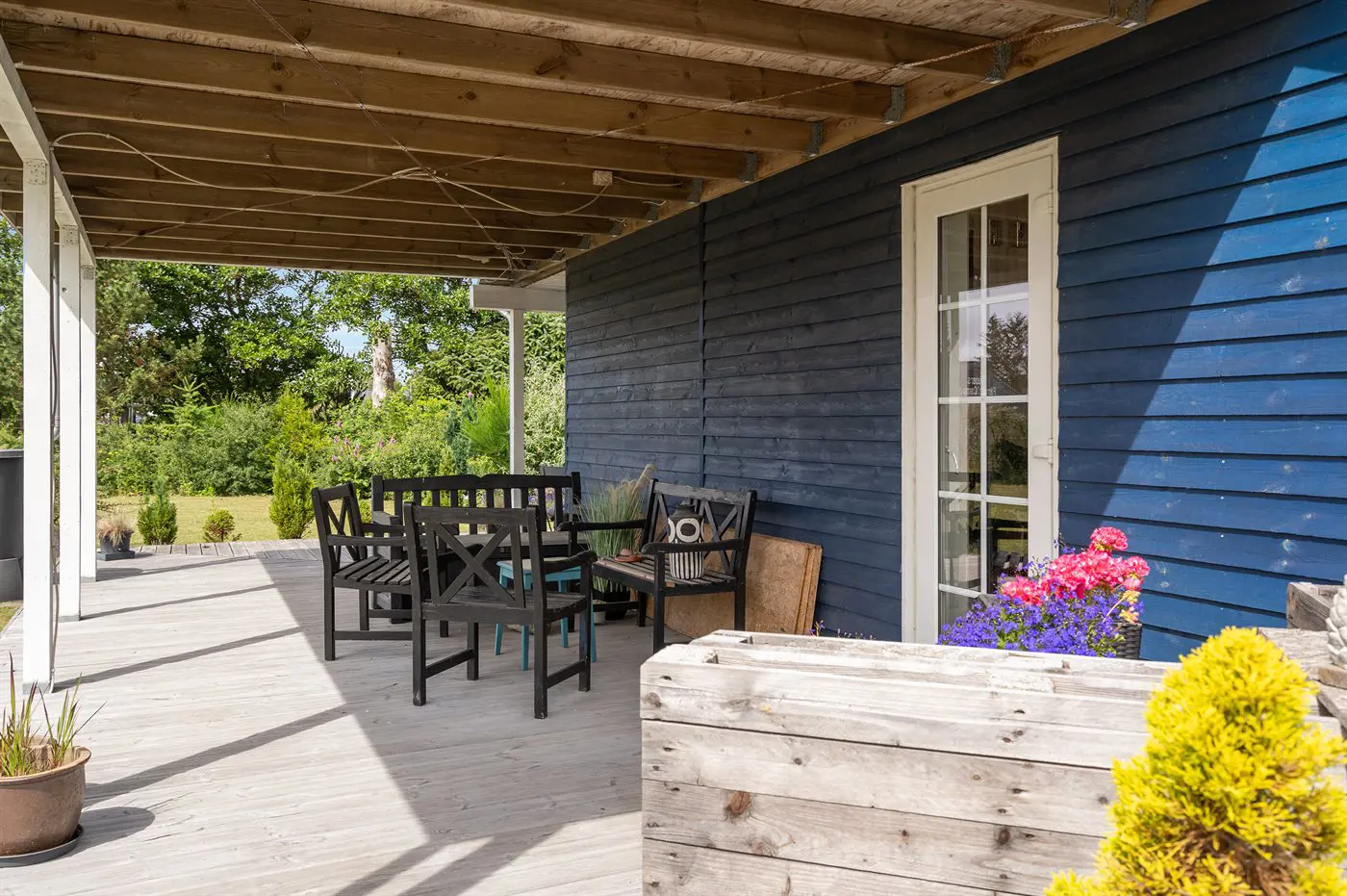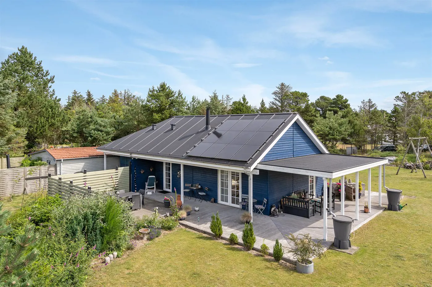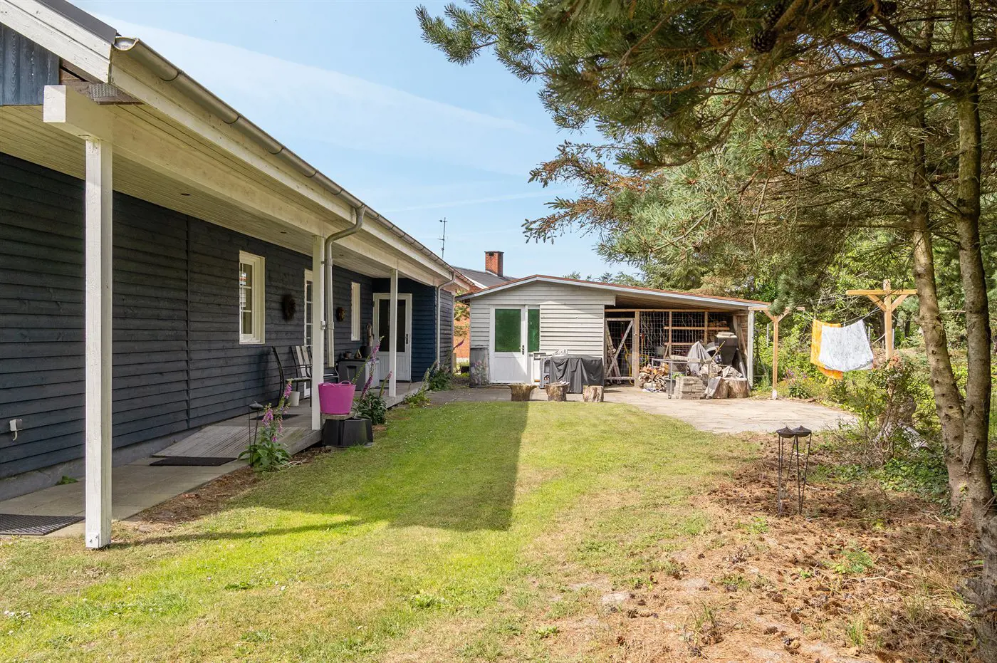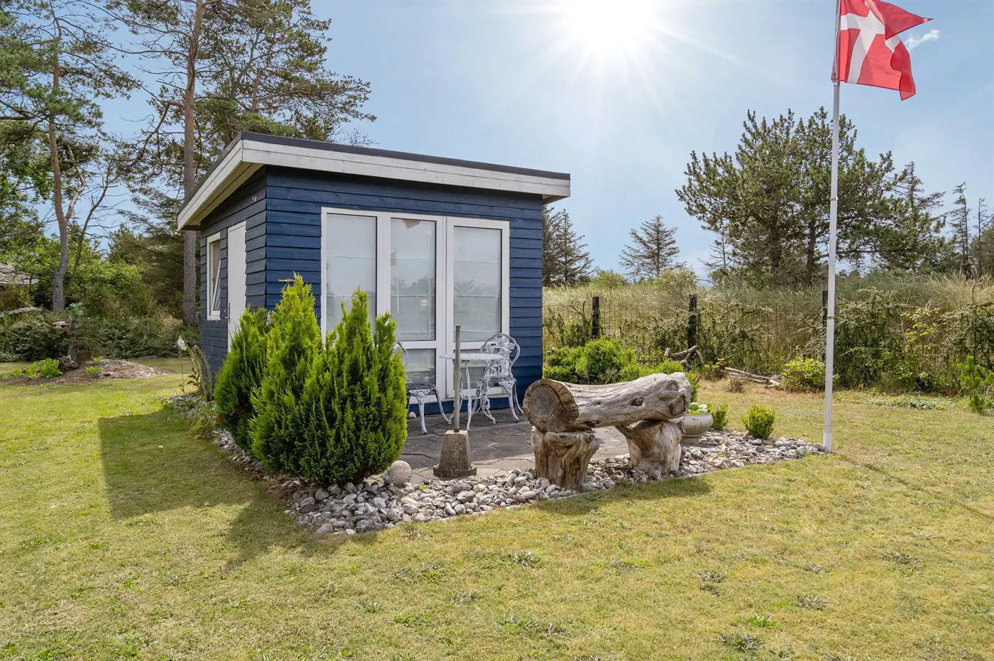 Die Ferienunterkunft liegt auf einem 1680 m² großen Naturgrundstück. Das Grundstück ist eingezäunt. Die Entfernung zum Meer beträgt 1250 m. Die nächste Einkaufsmöglichkeit liegt 300 m entfernt. Es steht ein offenes Terrassenareal zur Verfügung. Sandkasten. Es steht ein Grill zur Verfügung. Parkplatz auf dem Grundstück.