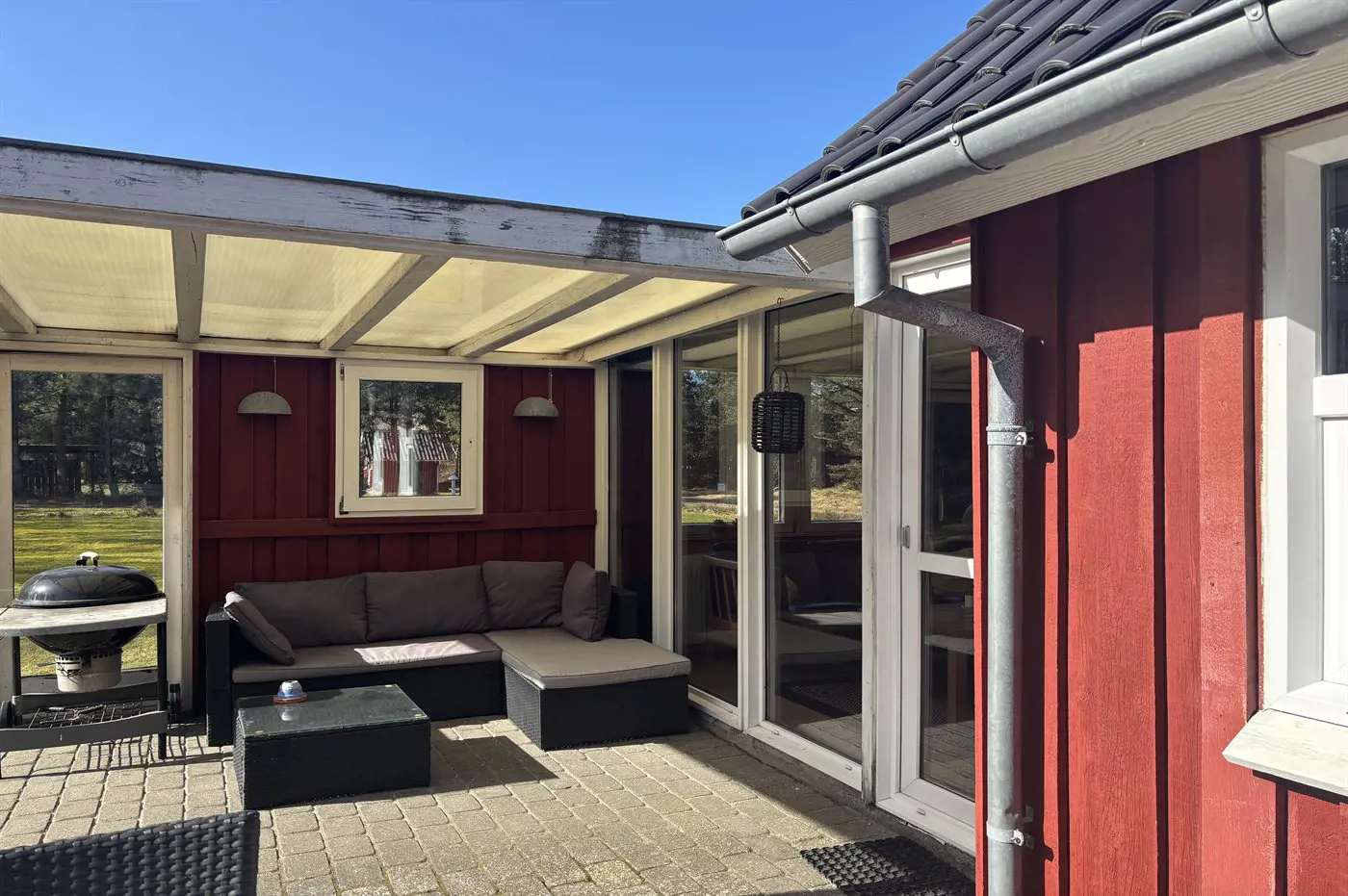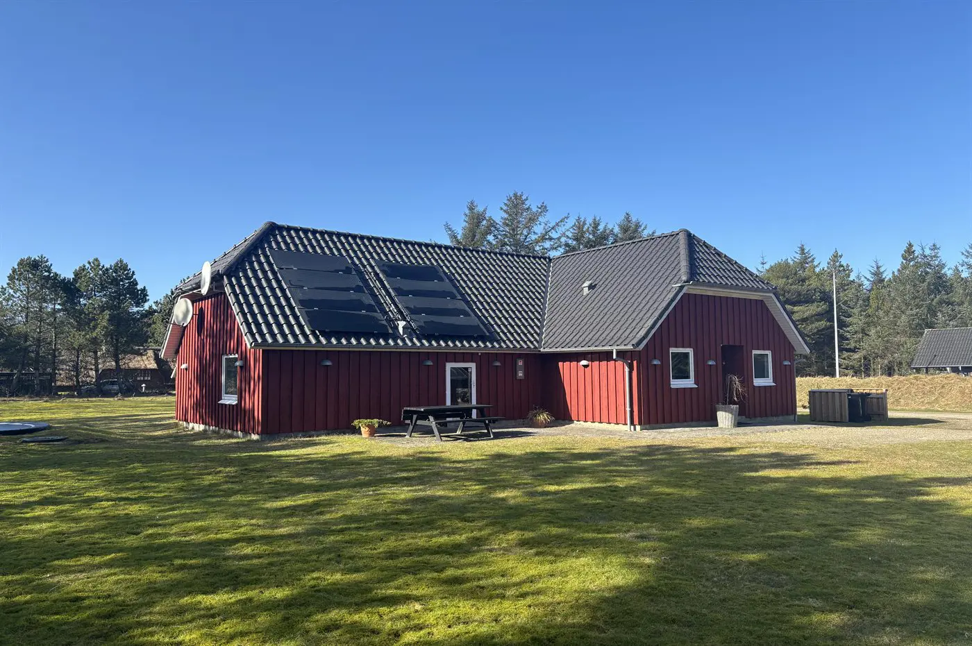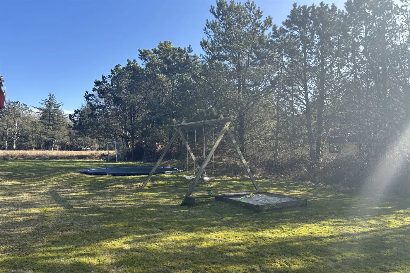 Vom Wohnbereich aus hast du Zugang zu einer teilweise überdachten Terrasse mit Gartenmöbeln und Grill – perfekt, um Mahlzeiten im Freien zu genießen, während die Kinder auf dem großen Grundstück mit Schaukel, Trampolin und Fußballtor spielen. Der Rasen lädt zudem zu Aktivitäten wie Wikinger-Schach oder Krocket ein.