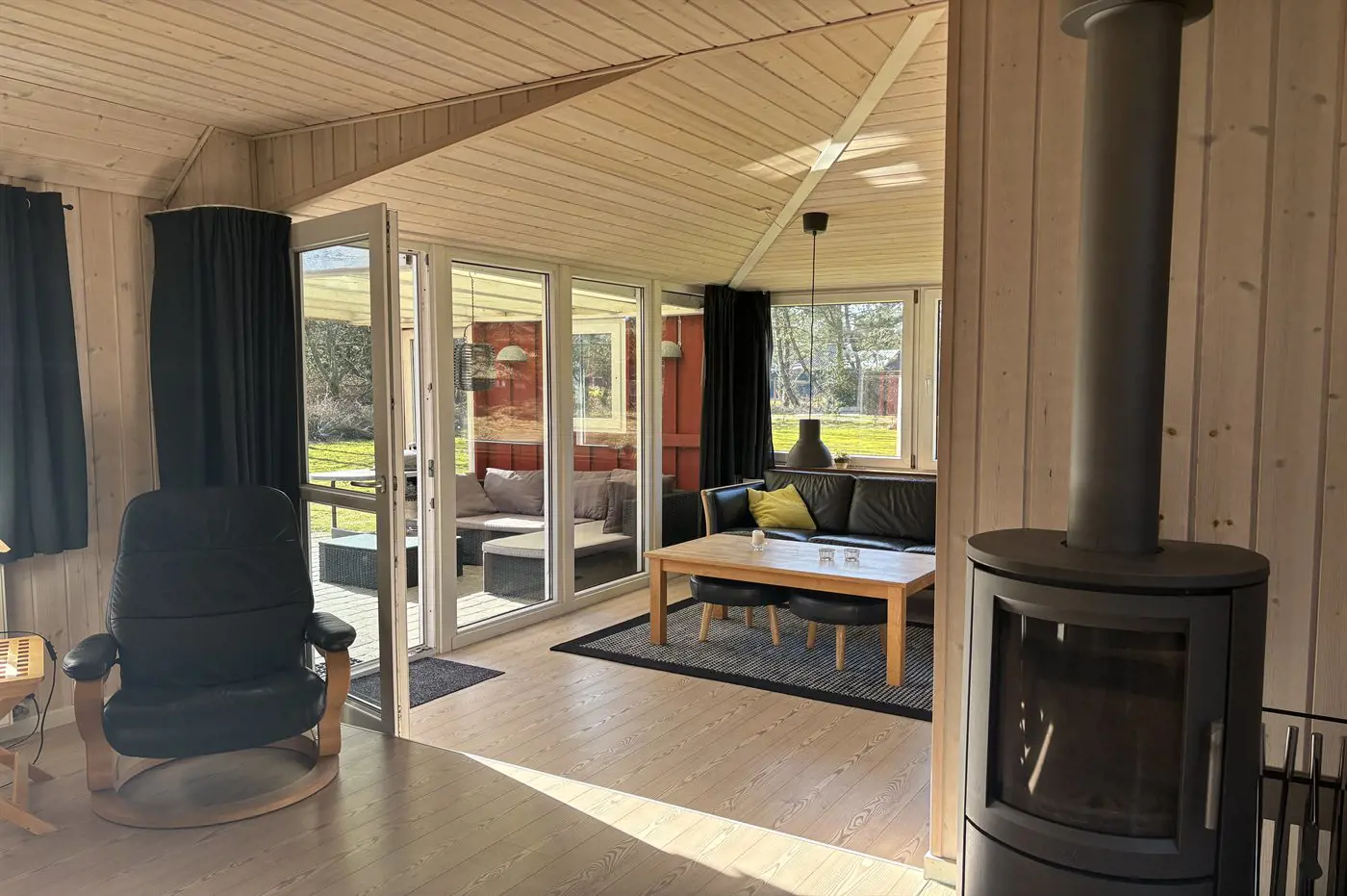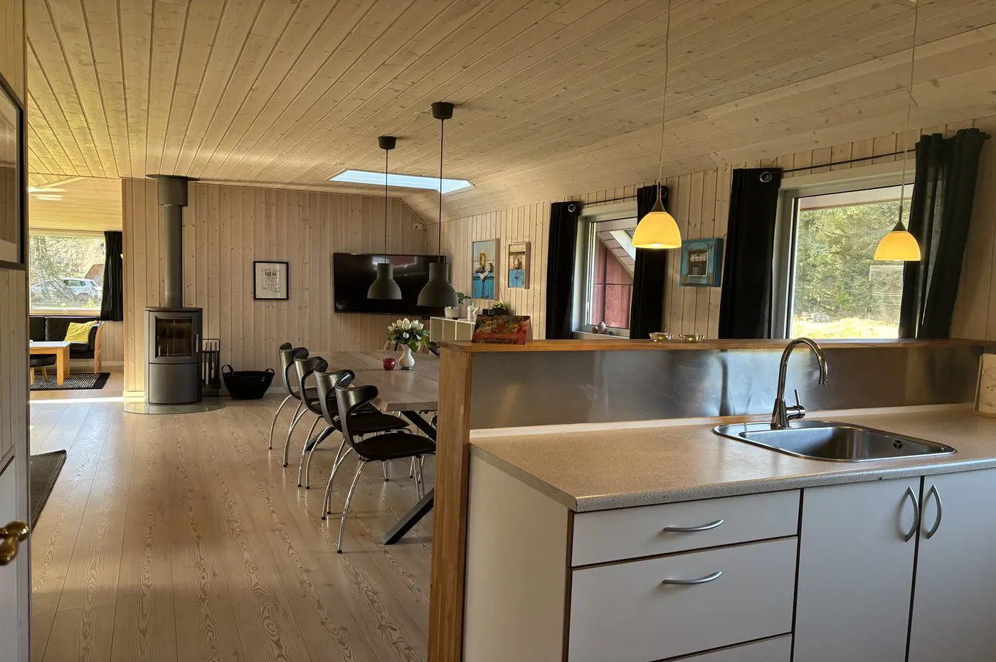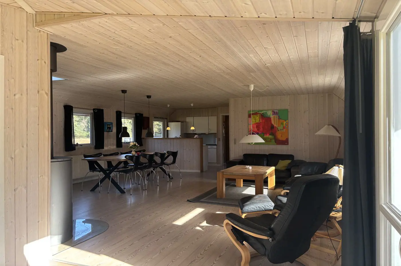 Der natürliche Mittelpunkt des Hauses ist der große Küchen- und Essbereich, der offen mit dem Wohnzimmer verbunden ist und über zwei Sofagruppen verfügt. Hier kannst du es dir in bequemen Möbeln mit einer Tasse Kaffee und einem guten Buch gemütlich machen, während der Kaminofen für Wärme und echte Ferienhausatmosphäre sorgt. Alternativ kannst du dich mit der Familie bei einem Brettspiel und einer Tasse Kakao versammeln. Außerdem gibt es ein großes Flatscreen-TV mit Chromecast sowie deutsche und dänische TV-Sender.