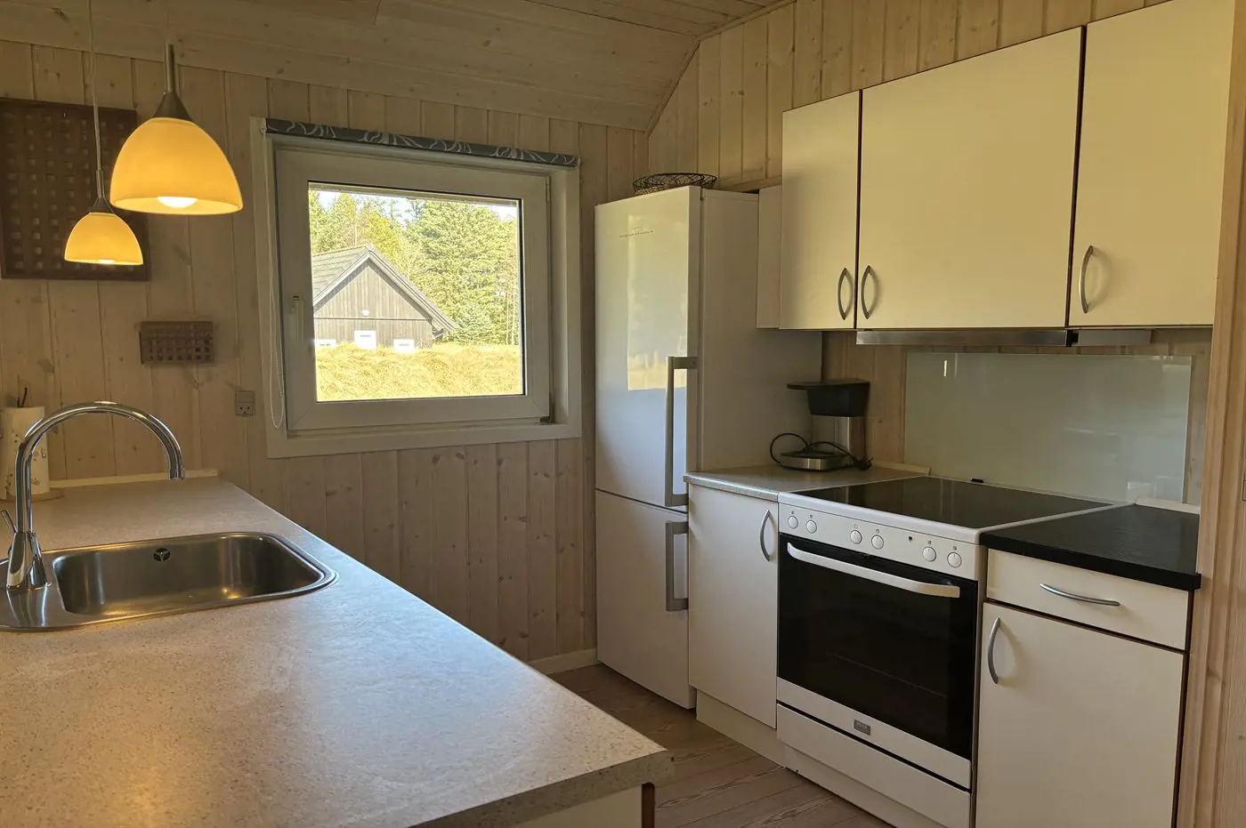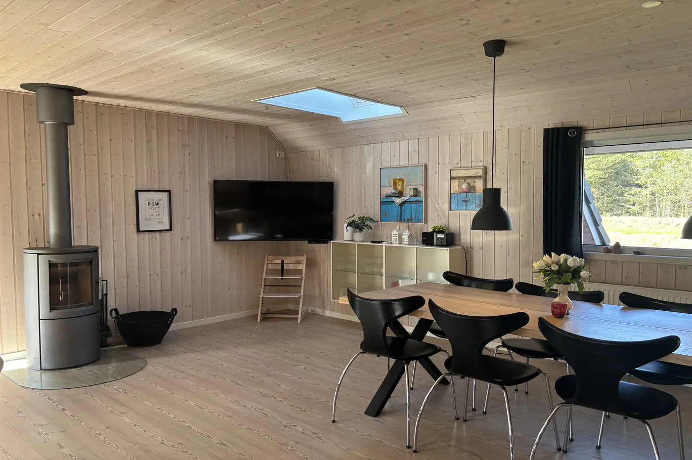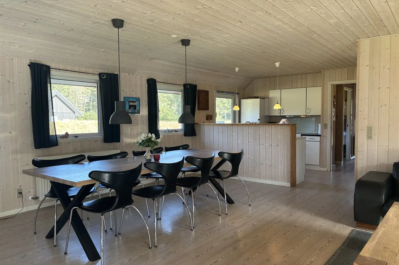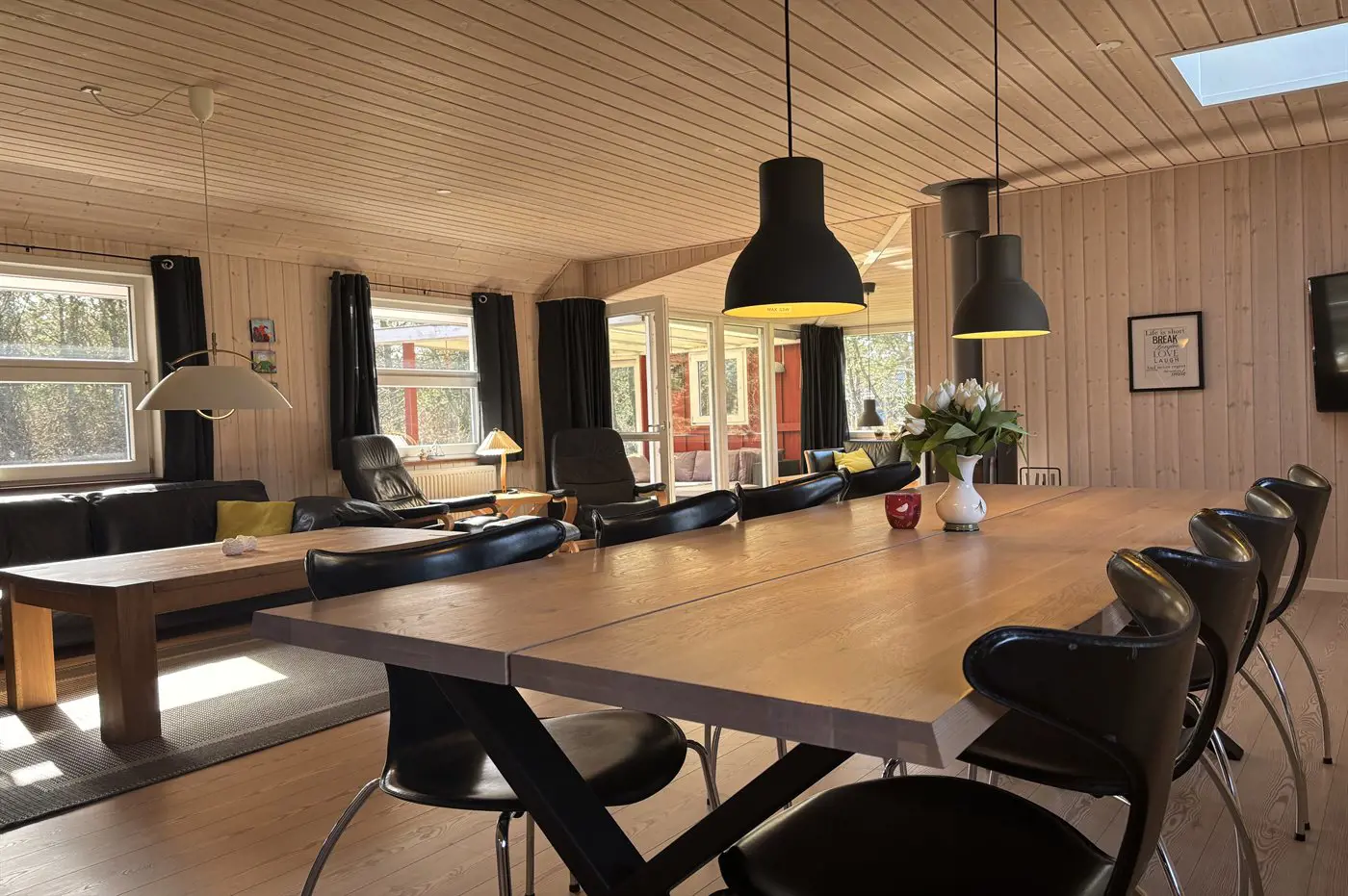 Der natürliche Mittelpunkt des Hauses ist der große Küchen- und Essbereich, der offen mit dem Wohnzimmer verbunden ist und über zwei Sofagruppen verfügt. Hier kannst du es dir in bequemen Möbeln mit einer Tasse Kaffee und einem guten Buch gemütlich machen, während der Kaminofen für Wärme und echte Ferienhausatmosphäre sorgt. Alternativ kannst du dich mit der Familie bei einem Brettspiel und einer Tasse Kakao versammeln. Außerdem gibt es ein großes Flatscreen-TV mit Chromecast sowie deutsche und dänische TV-Sender.