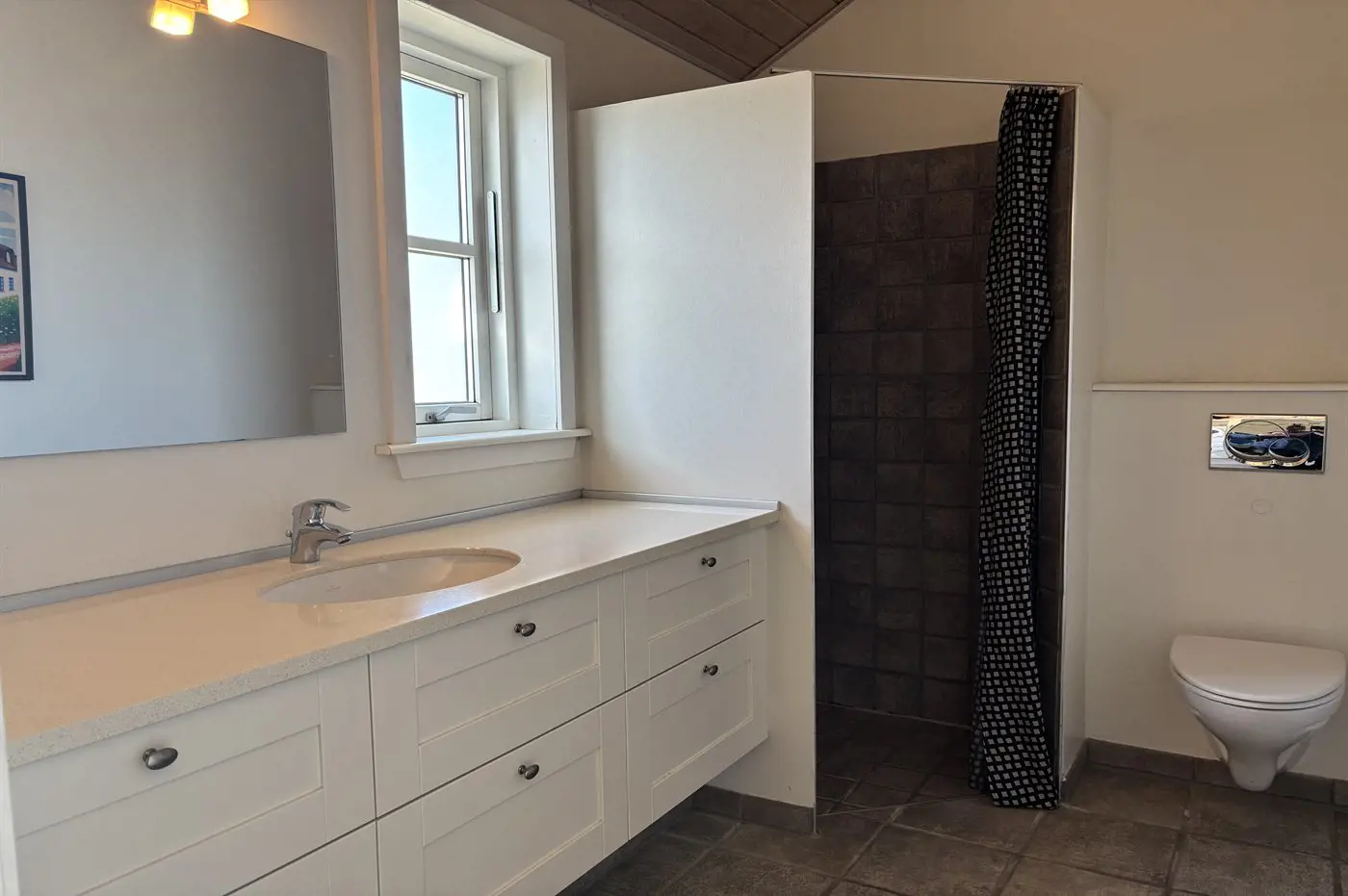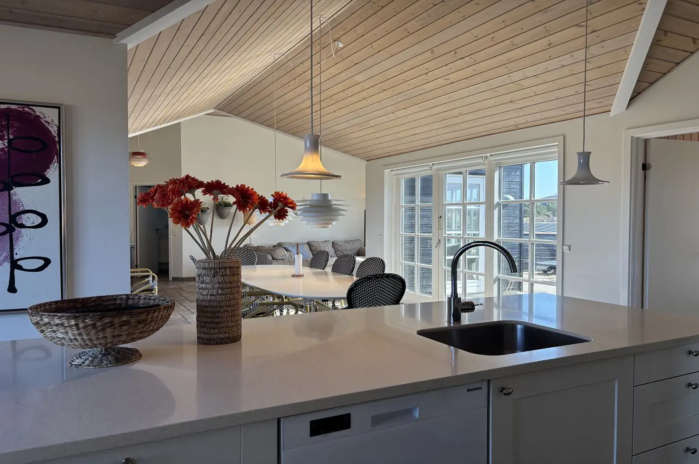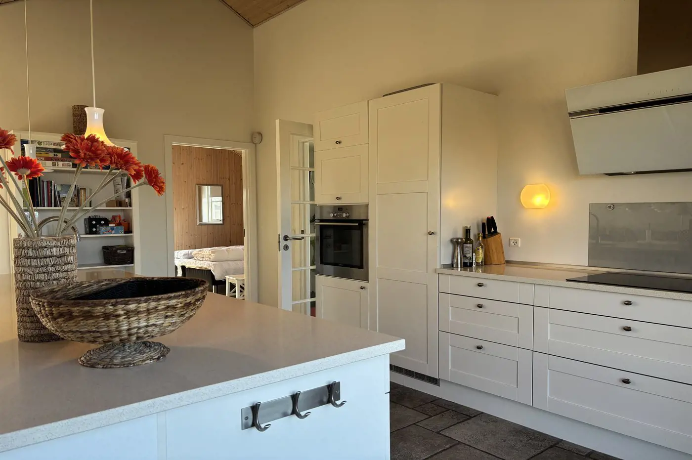 Das Haus bietet einen großen und einladenden Wohnküchenbereich mit Essplatz und großen Fensterfronten, durch die das Licht und der Blick auf die Dünen den Raum erfüllen. Die breiten Glasfronten im Wohnbereich lassen sich vollständig öffnen, sodass Innen- und Außenbereich an warmen Tagen miteinander verschmelzen. Es gibt insgesamt drei geschlossene Terrassen, sodass du jederzeit Sonne und Windschutz findest.