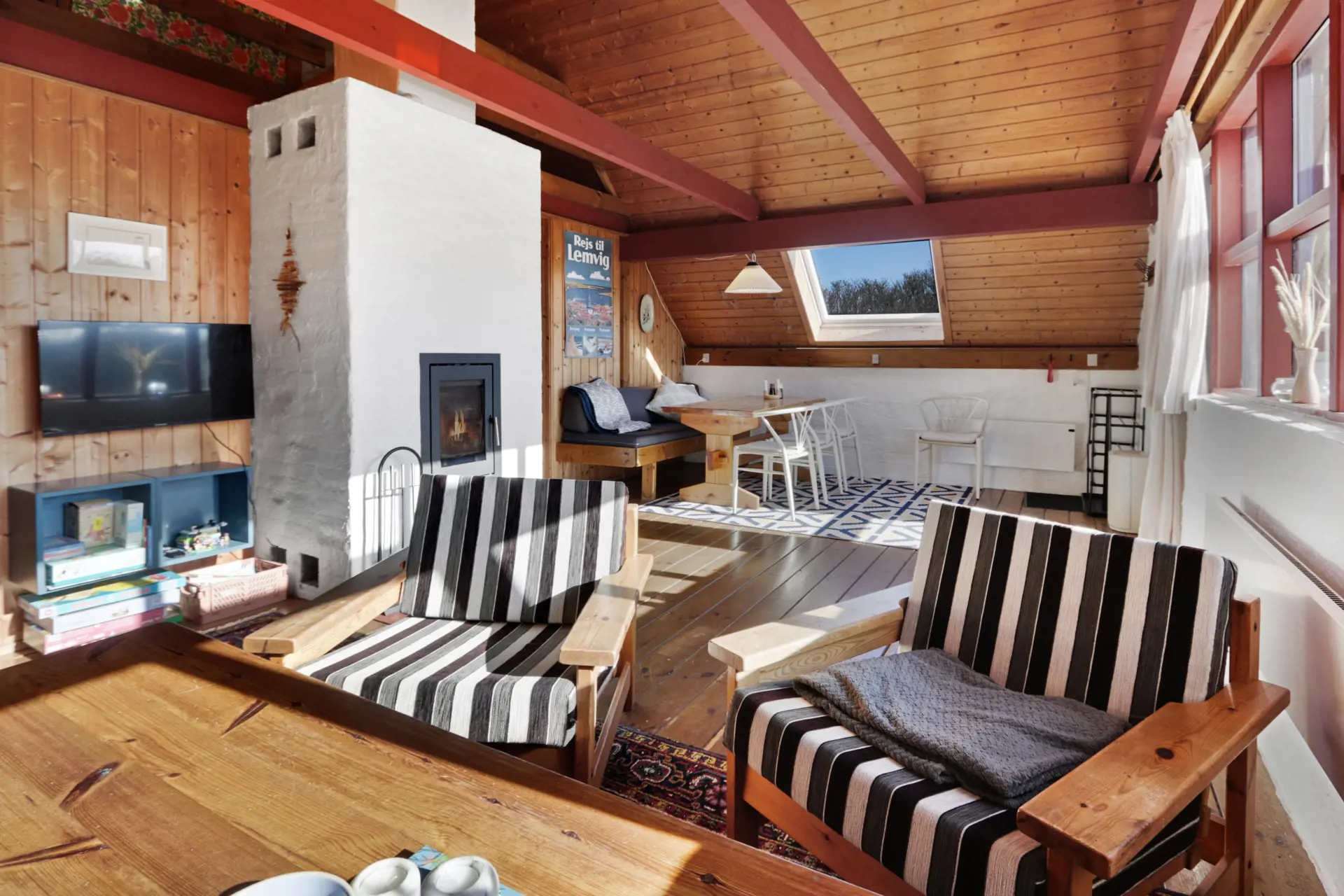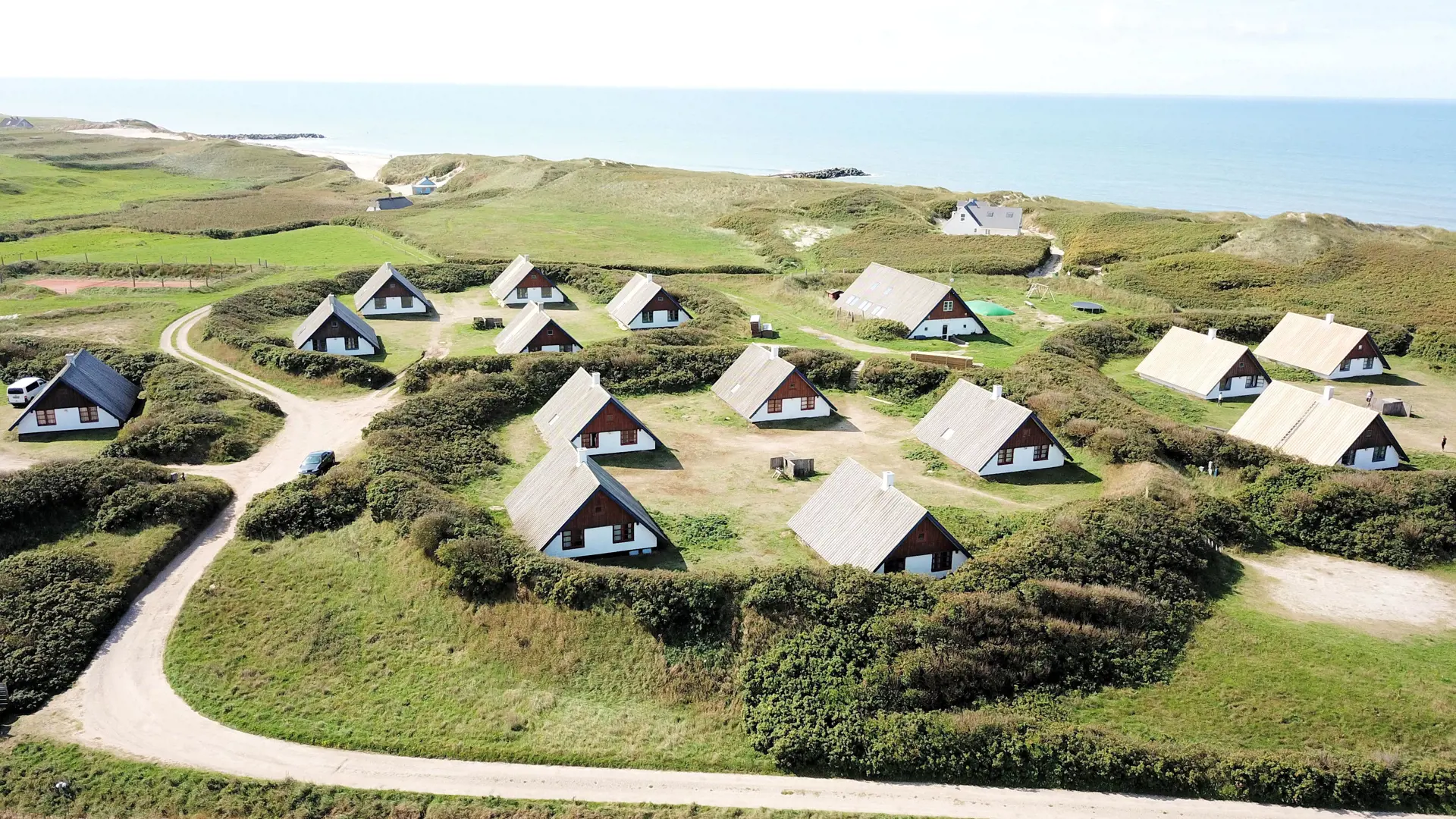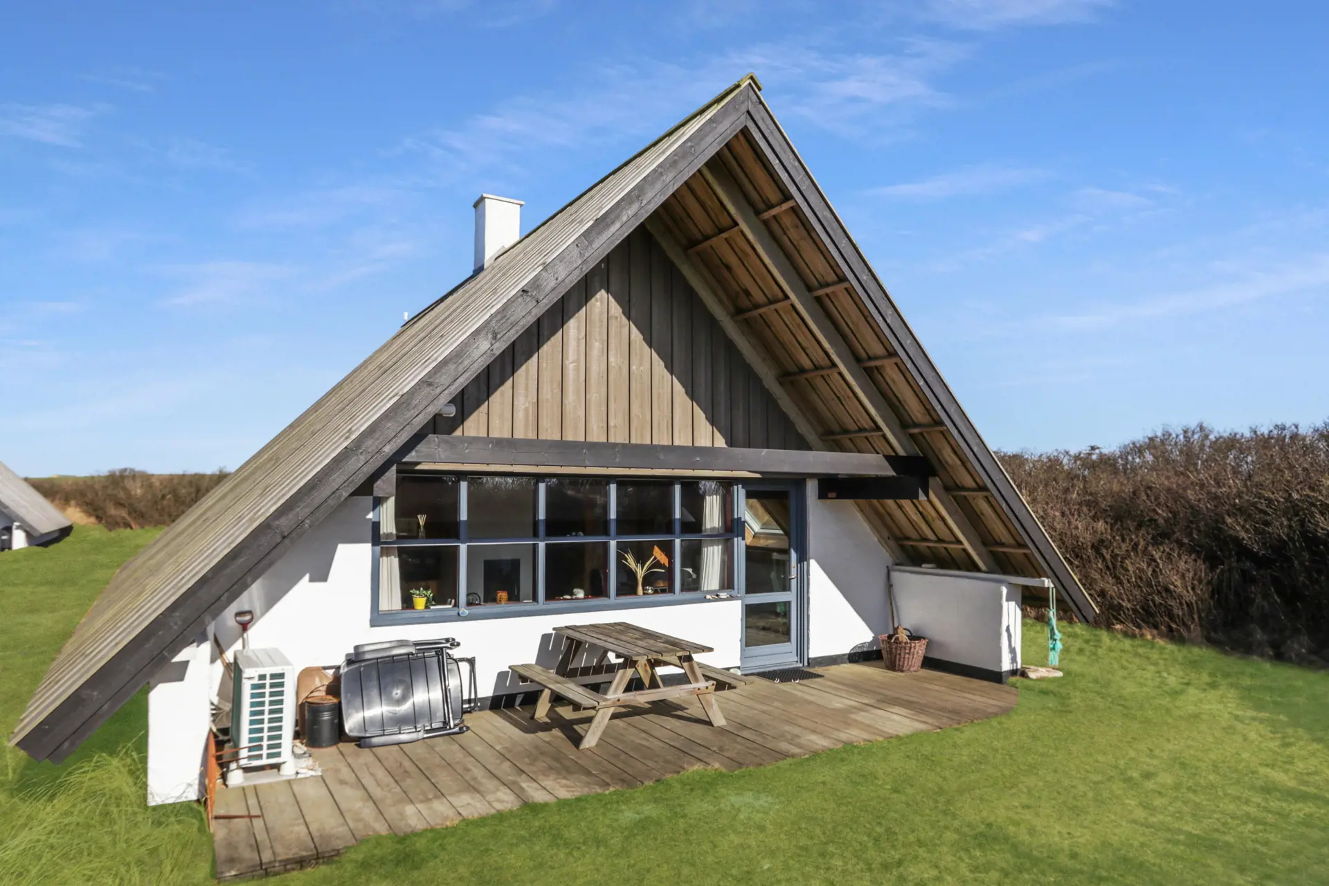 Vom Wohnraum ist ein Ausgang zur kleinen überdachten Terrasse mit Gartenmöbeln, 2 Sonnenliegen und einem Grill. Das Haus ist ein Teil von Fjaltring Ferieby , welches aus 25 ungefähr gleichen A-Häusern, die in 5 Zirkeln aufgeteilt sind. Die ganze Feriensiedlung liegt in einem schönen “Topf” im geschützen Dünenbereich, nur etwa 200 m von der Nordsee entfernt. Geniessen Sie einen ökonomischen Urlaub in einem ganz einfachen Haus in einer einmaligen Lage. Parken Sie das Auto und Sie können den Urlaub geniessen. Den Strand erreichen Sie unter 5 Minuten zu Fuss. Erleben Sie die tosende Nordsee, die jeden Tag ganz neue Erlebnisse anbietet. Laufen Sie am Strand entlang , oder erkunden Sie die vielen anderen Möglichkeiten der Gegend.