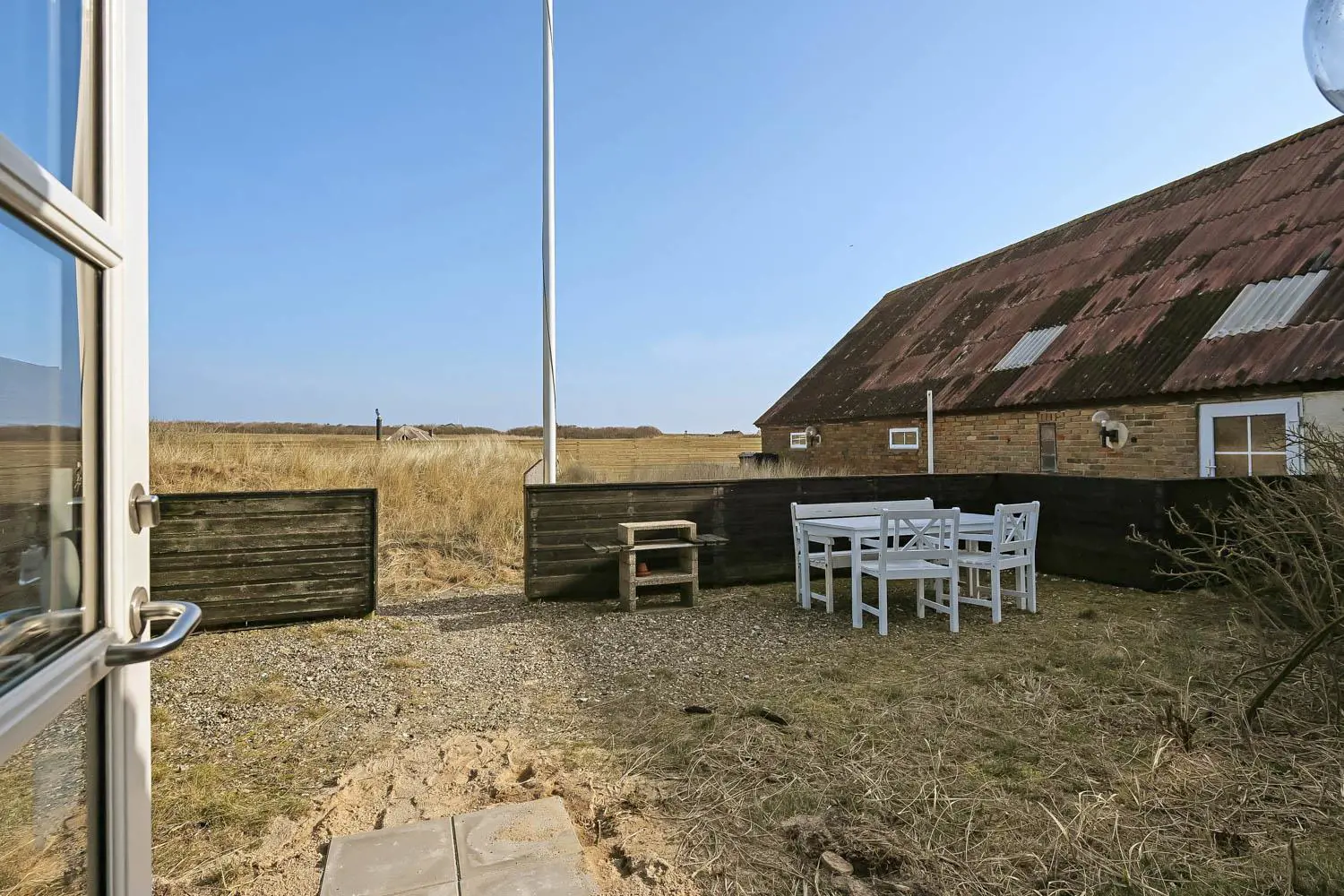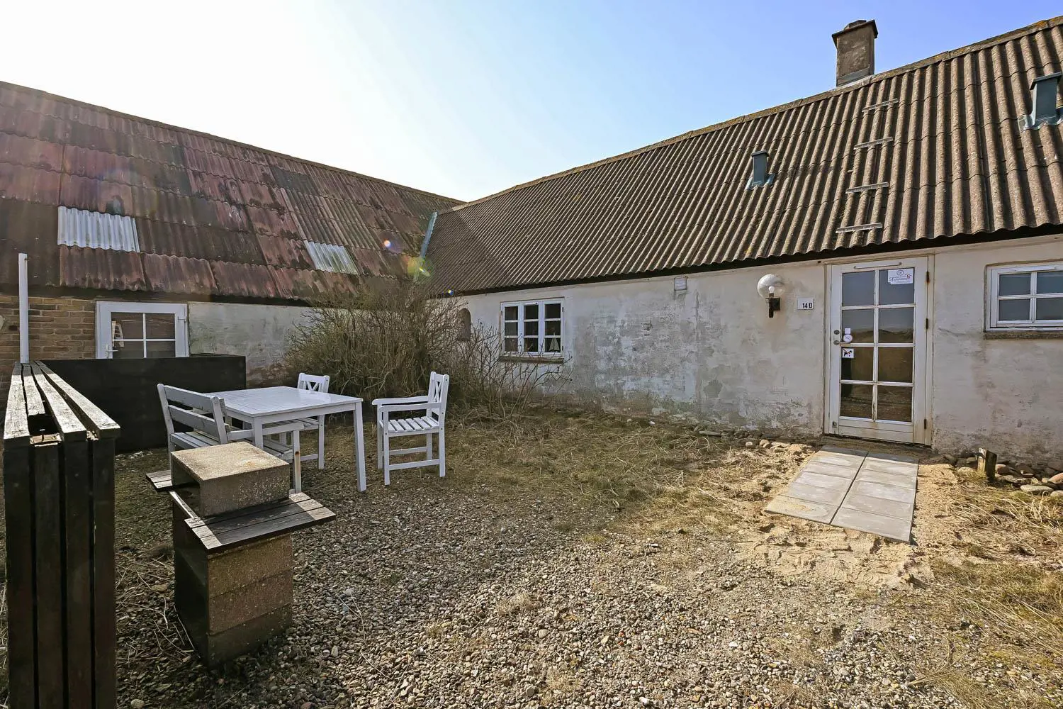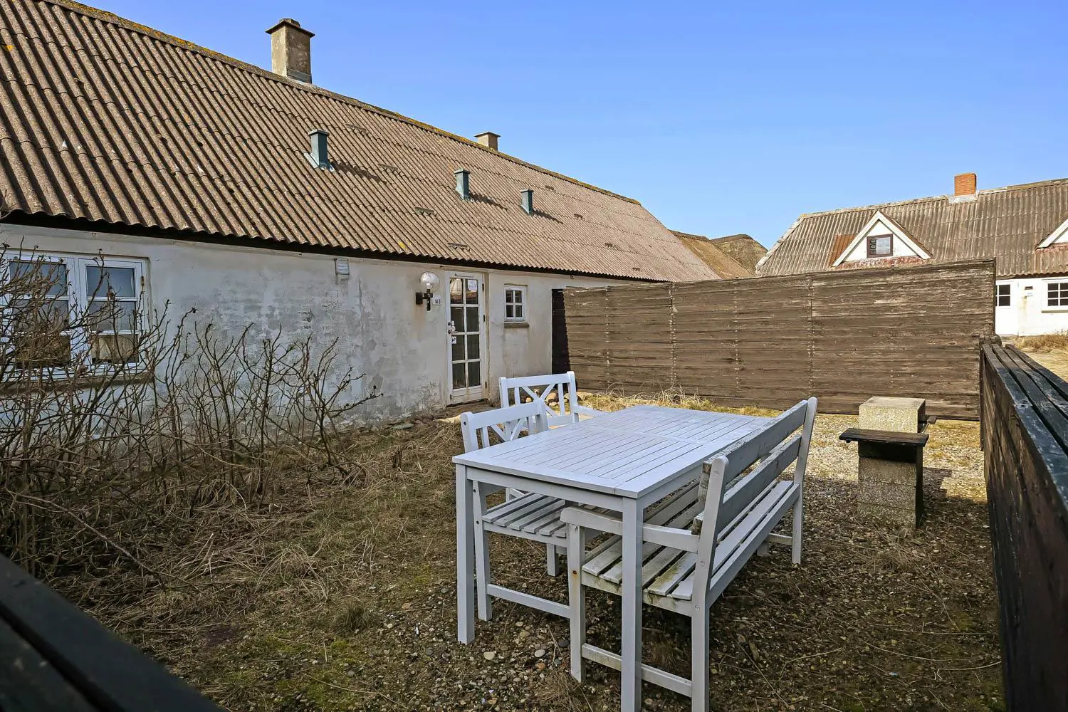 Der liebevoll gestaltete Innenhof ist von kleinen Dünen mit Strandhafer umgeben und führt direkt zur ca. 50 m² großen, teilweise geschlossenen Terrasse mit Gartenmöbeln und Grill. Ein wunderbarer Ort für gemeinsame Mahlzeiten im Freien oder gemütliche Abende in geschützter Umgebung.
