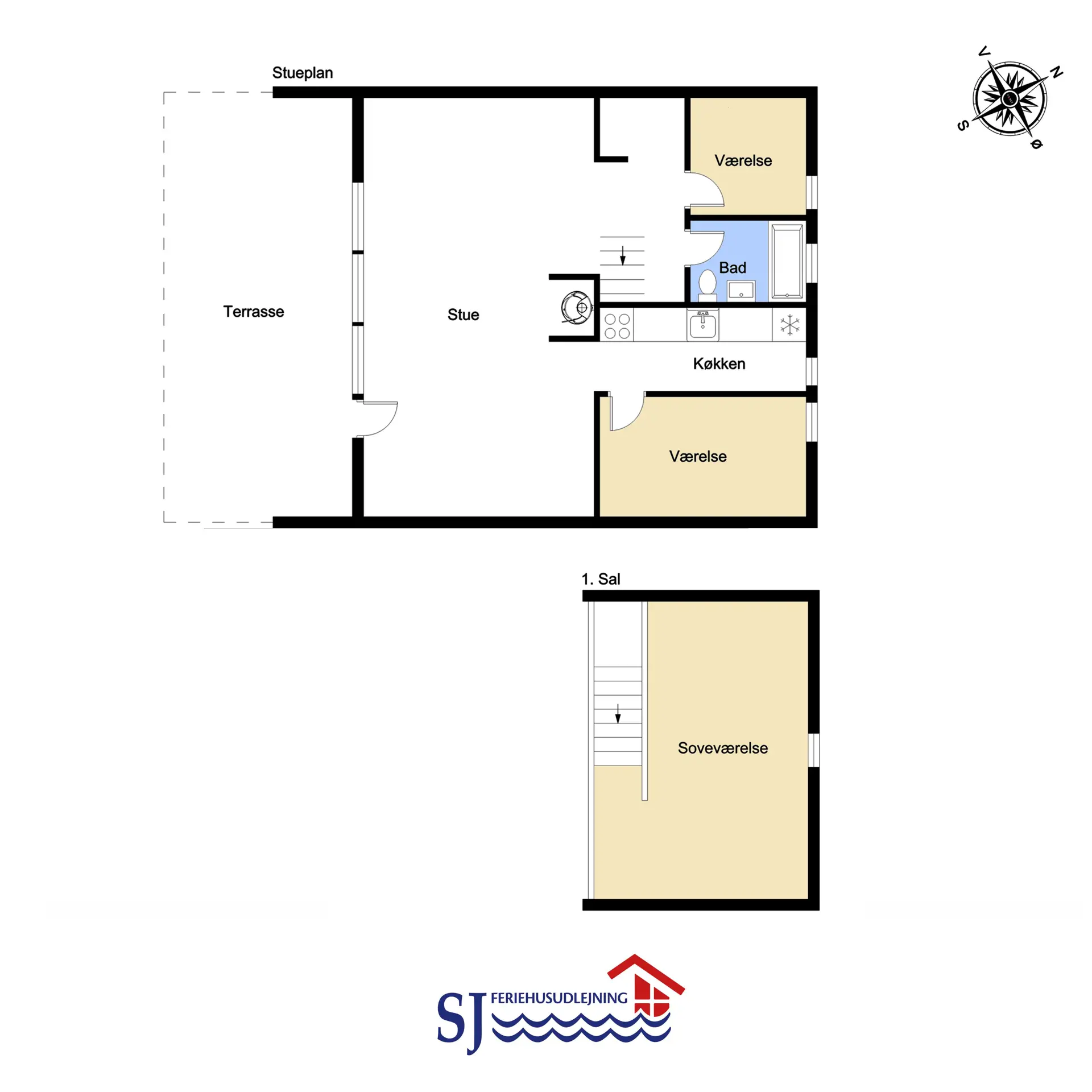 Im Erdgeschoss befinden sich zwei Schlafzimmer mit insgesamt drei Schlafplätzen. Außerdem gibt es einen Hems mit zwei großen Einzelbetten, die zu einem Doppelbett zusammengestellt werden können.
