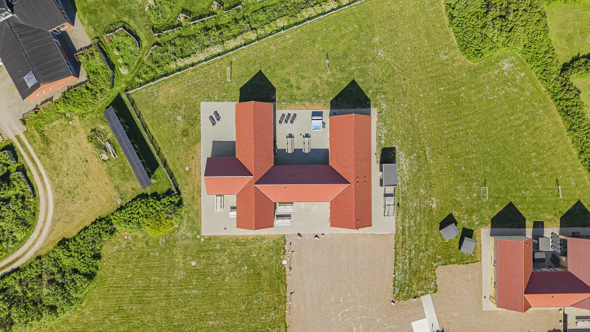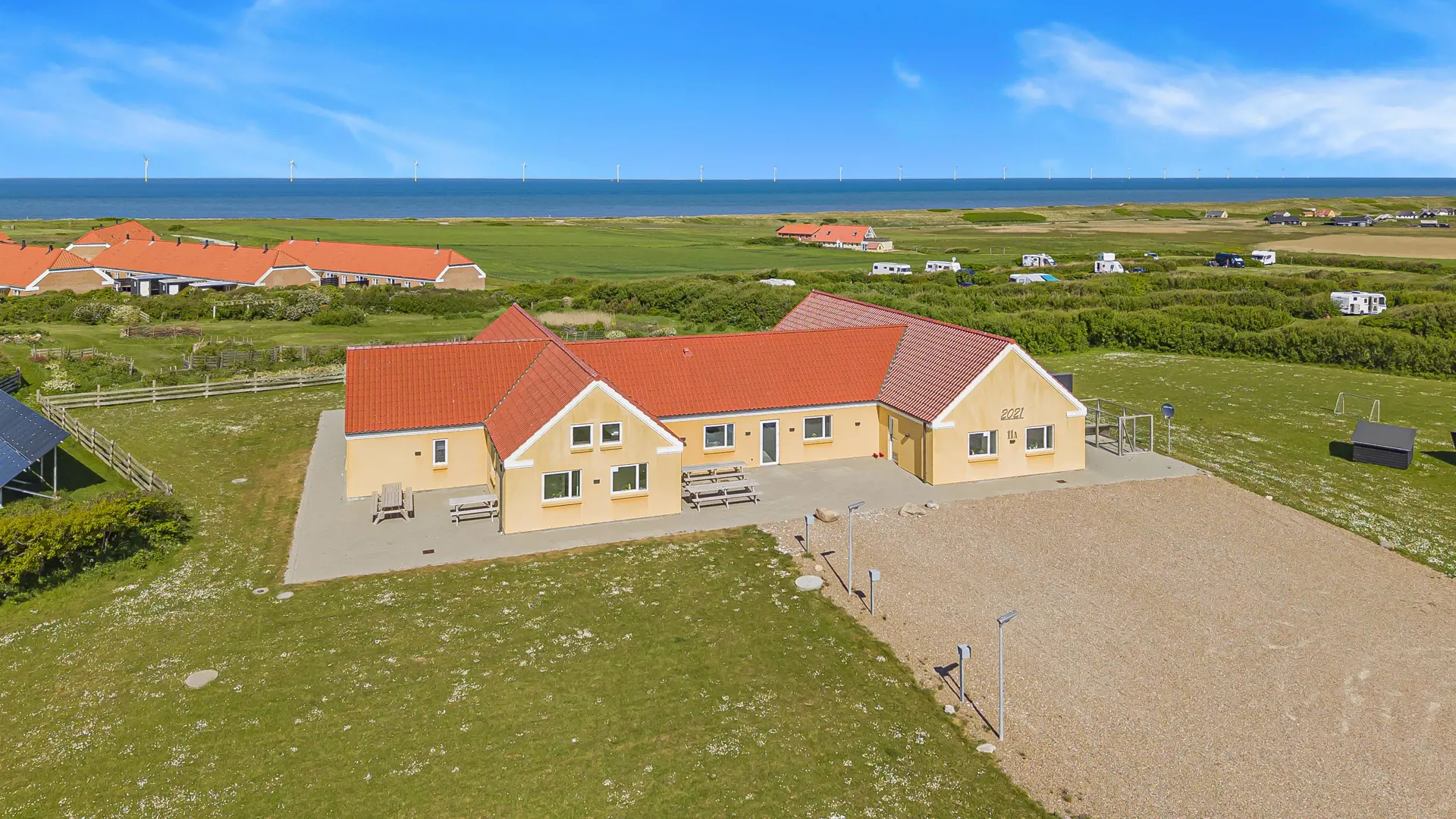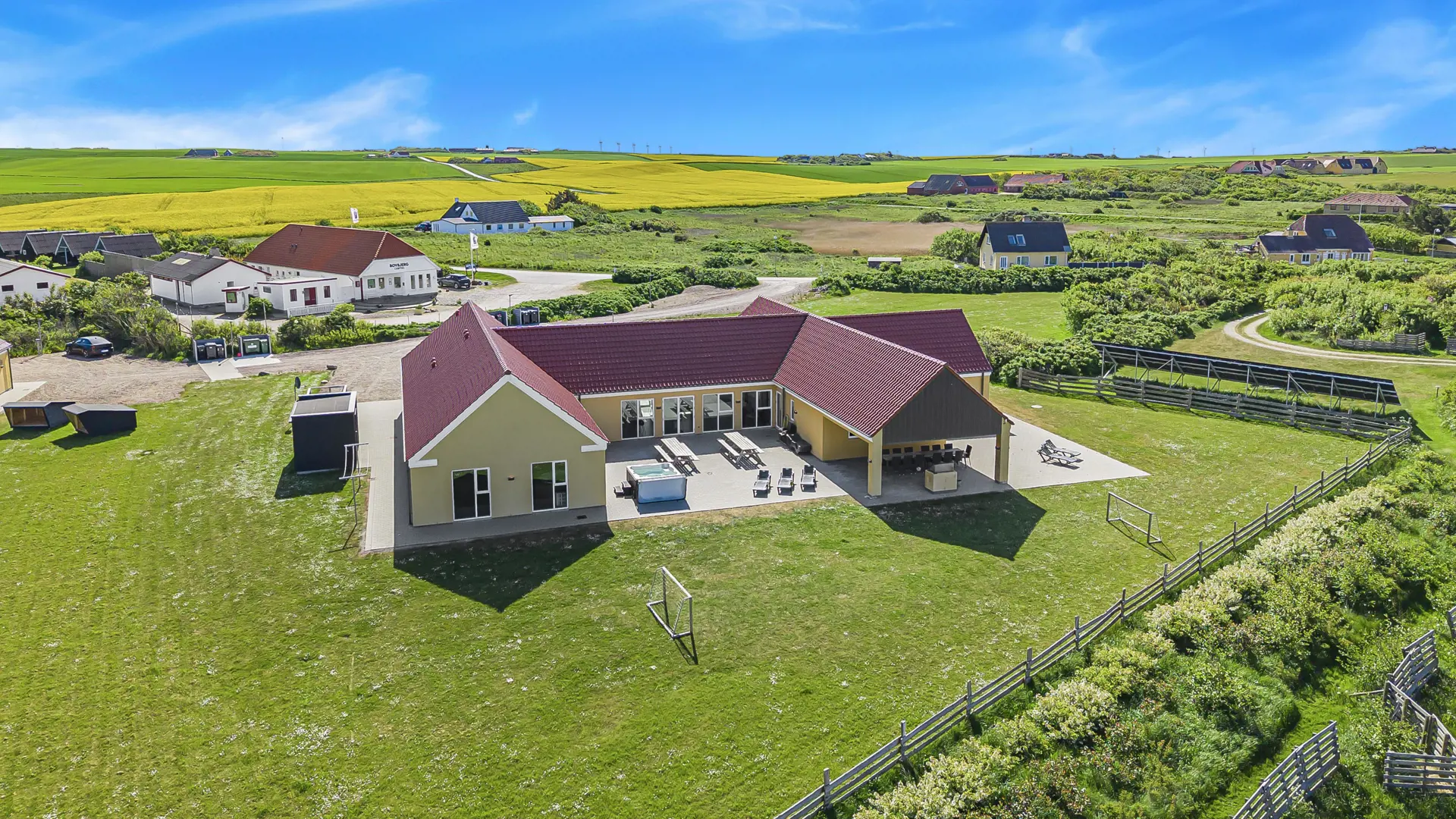 Auf dem 8.600 m2 großen Grundstück ist viel Platz und auf der herrlichen Terrassenanlage gibt es viele Möglichkeiten für einen Platz in der Sonne oder vielleicht auch im Schatten, da die Anlage u.a. 38 m2 Terrasse enthält, die überdacht ist. Auch hier ist die Aussicht einmalig und an vieles gedacht. Großer fester Grill, viele Gartenmöbel und Sonnenliegen und auch an die Vierbeiner, die eine eigene Hundehütte haben, wird gedacht. Wie wäre es mit einem Fußball auf dem eigenen Fußballplatz neben dem Haus. Die Nutzung des Outdoor-Spa in der Ecke der Terrasse macht das Erlebnis an den dunklen Abenden mit dem klaren Sternenhimmel einzigartig und besonders. Ein einzigartiges Erlebnis, die pure Therapie für Geist und Körper . Das Haus liegt in der Nähe des Jens Søndergårds Museums und nicht weit vom Leuchtturm Bovbjerg. Genießen Sie einen fantastischen Spaziergang oder laufen Sie auf dem Weg, der direkt am Rande des Bovbjerg Klint mit einem einzigartigen Blick auf die Nordsee angelegt ist. Erleben Sie, dass die Nordsee jeden Tag eine neue Geschichte erzählt. Besuchen Sie die vielen Attraktionen und Erlebnisse, die innerhalb von max. 30 Minuten zu erreichen sind, oder besuchen Sie das Fischerstädtchen Thyborøn oder das schöne Handelsstädtchen Lemvig mit vielen Fachgeschäften. In den Sommermonaten können Sie auf Bovbjerg Camping die nötigsten Einkäufe tätigen. Das perfekte geräumige Haus für 32 Personen in einer einzigartigen Moränenlandschaft, die viele Hügel, Möglichkeiten und Romantik bietet.