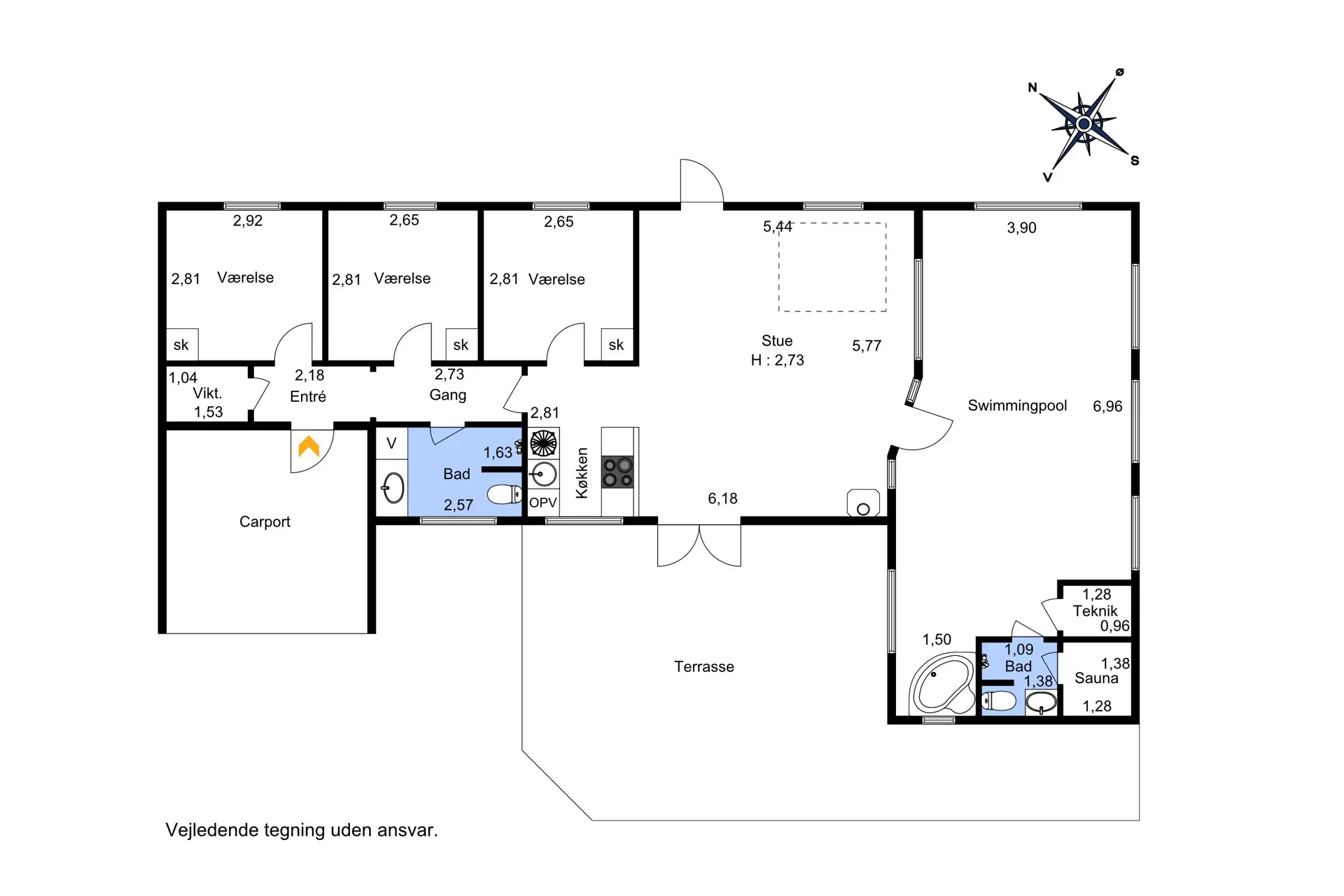 Gut ausgenutztes Haus mit Pool auf 110 m2 und mit 3 Schlafräumen: 1DB + 1DB + 1DB. Küche mit Herd mit Cerankochfeld, Abzugshaube, Kühlschrank mit Gefrierfach, Mikrowelle und Geschirrspüler. Wohnraum mit Ledermöbeln, TV mit dänischen und deutschen Programmen, Radio/CD/DVD und Esstisch mit viel Platz. Ein schöner Kaminofen helfen dabei die Nebenkosten niedriger zu halten. Schöner Poolraum mit Pool (6,0 x 3,0 x 1,0 m), Whirlpool für 2 Personen, Badezimmer mit Dusche und direktem Zugang zur Saua. Extra Badezimmer mit Toilette, Waschbecken, Dusche, Waschmaschine. Es gibt natürlich Fussbodenheizung im ganzem Poolraum und Badezimmer.Einn gutes Angebot für die Familien, die ein Poolhaus und Sauna in ruhiger Umgebung suchen. 2 Haustiere sind erlaubt. Kaution Wintersaison EUR 600 und Sommersaison EUR 300