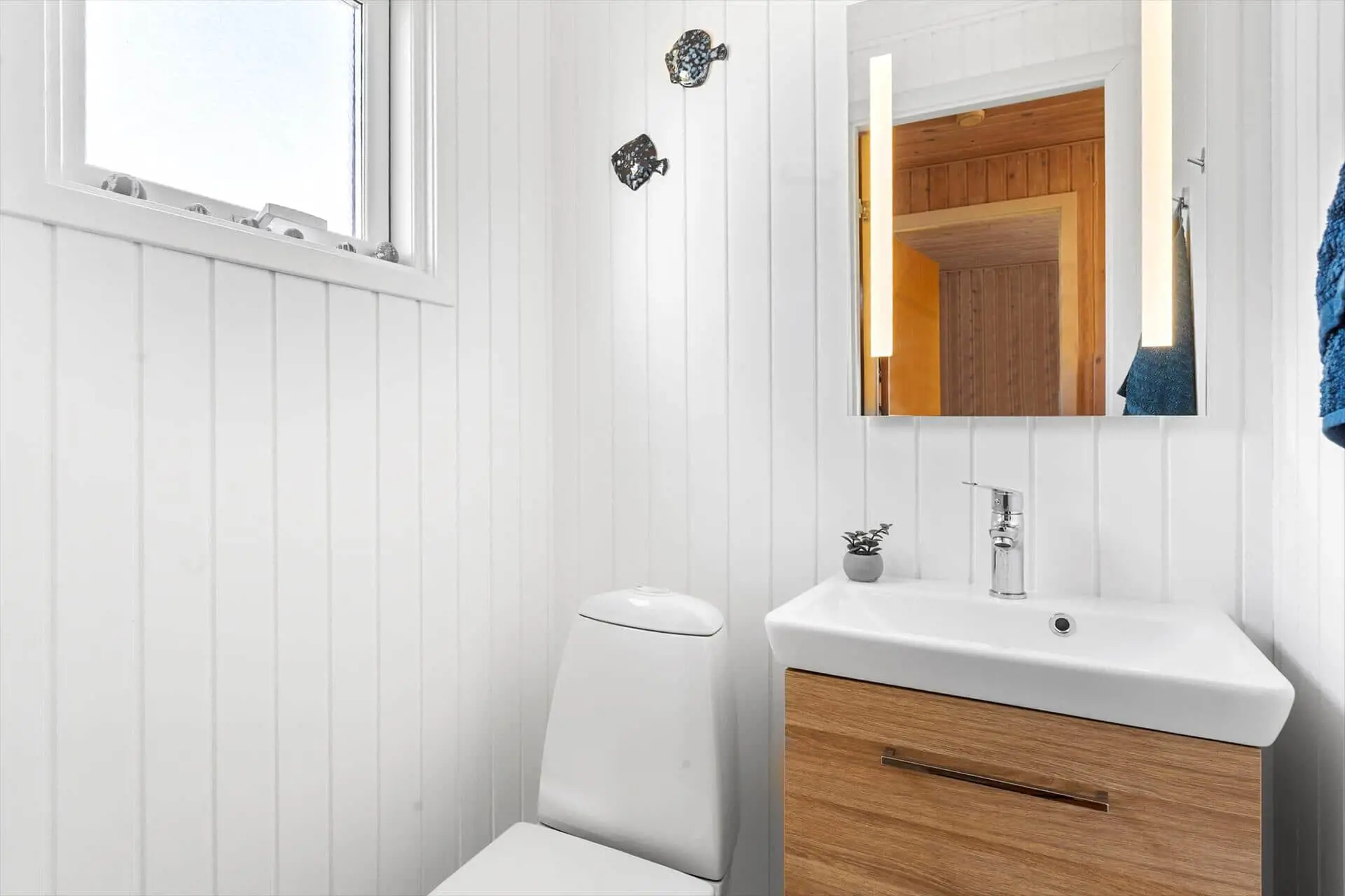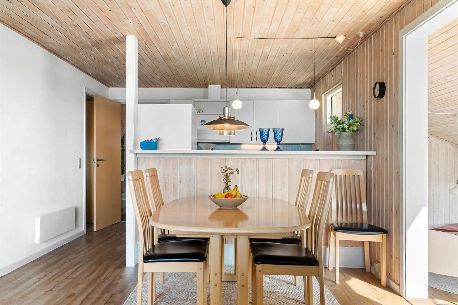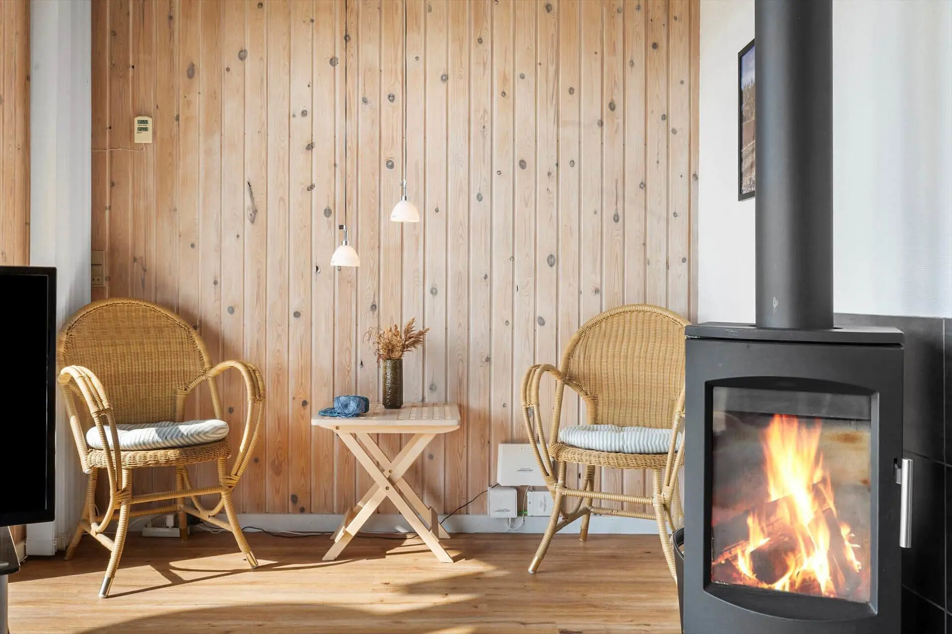 Das Ferienhaus ist hell und freundlich eingerichtet und strahlt echte Urlaubsatmosphäre aus. Küche, Essbereich und Wohnzimmer sind zu einem offenen und großzügigen Aufenthaltsbereich vereint, in dem der Kaminofen für Wärme und Gemütlichkeit sorgt – ideal für einen Abend mit Büchern, Brettspielen oder einem Film auf dem Flachbildfernseher. Große Fensterfronten lassen viel Licht herein und bieten einen herrlichen Ausblick.Das Haus verfügt über drei Schlafzimmer, ein Badezimmer sowie ein zusätzliches Gäste-WC, sodass sich sowohl Kinder als auch Erwachsene rundum wohlfühlen können. Sollte das Wetter einmal nicht mitspielen, steht eine Waschmaschine bereit – so bleibt der Urlaub sorgenfrei.