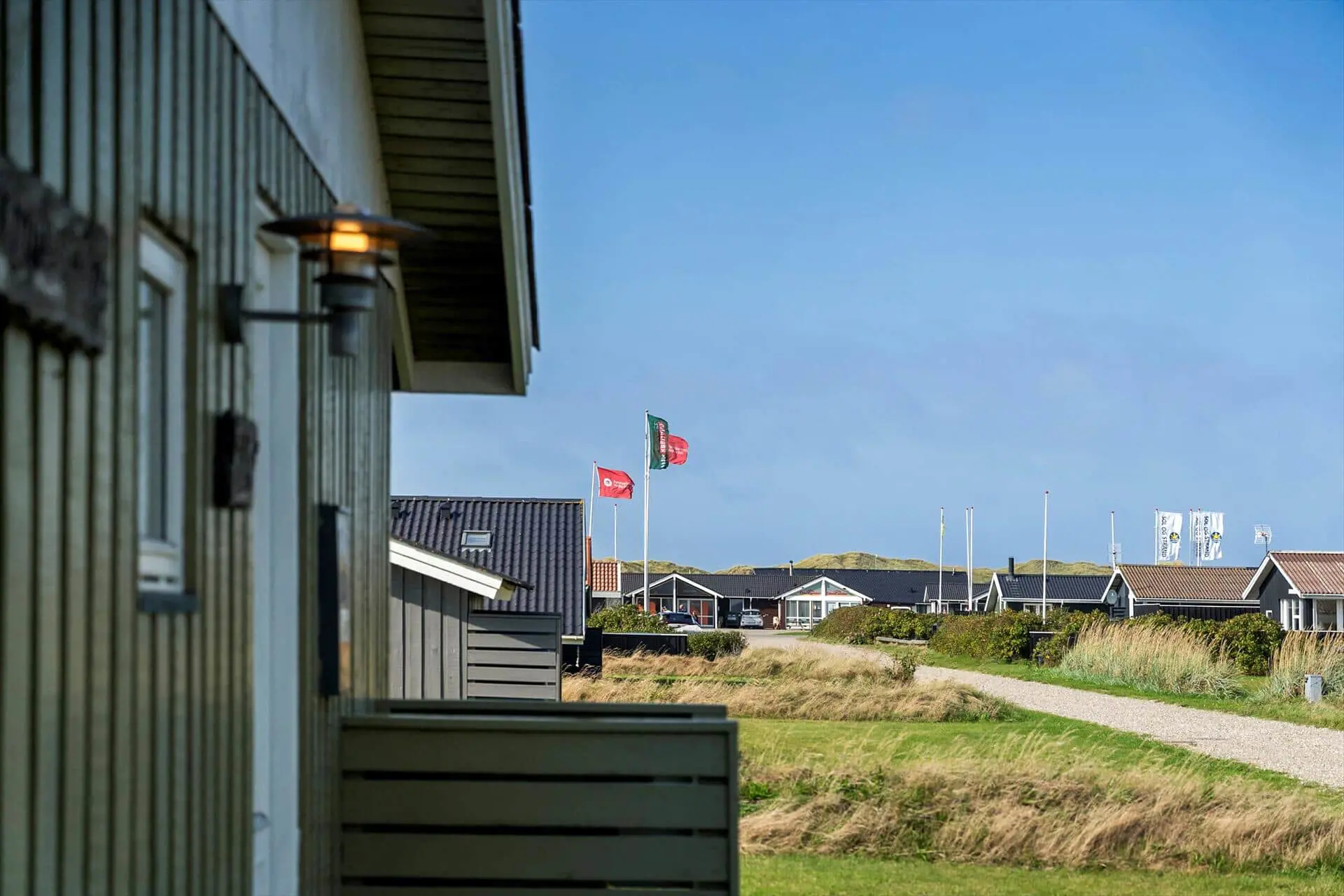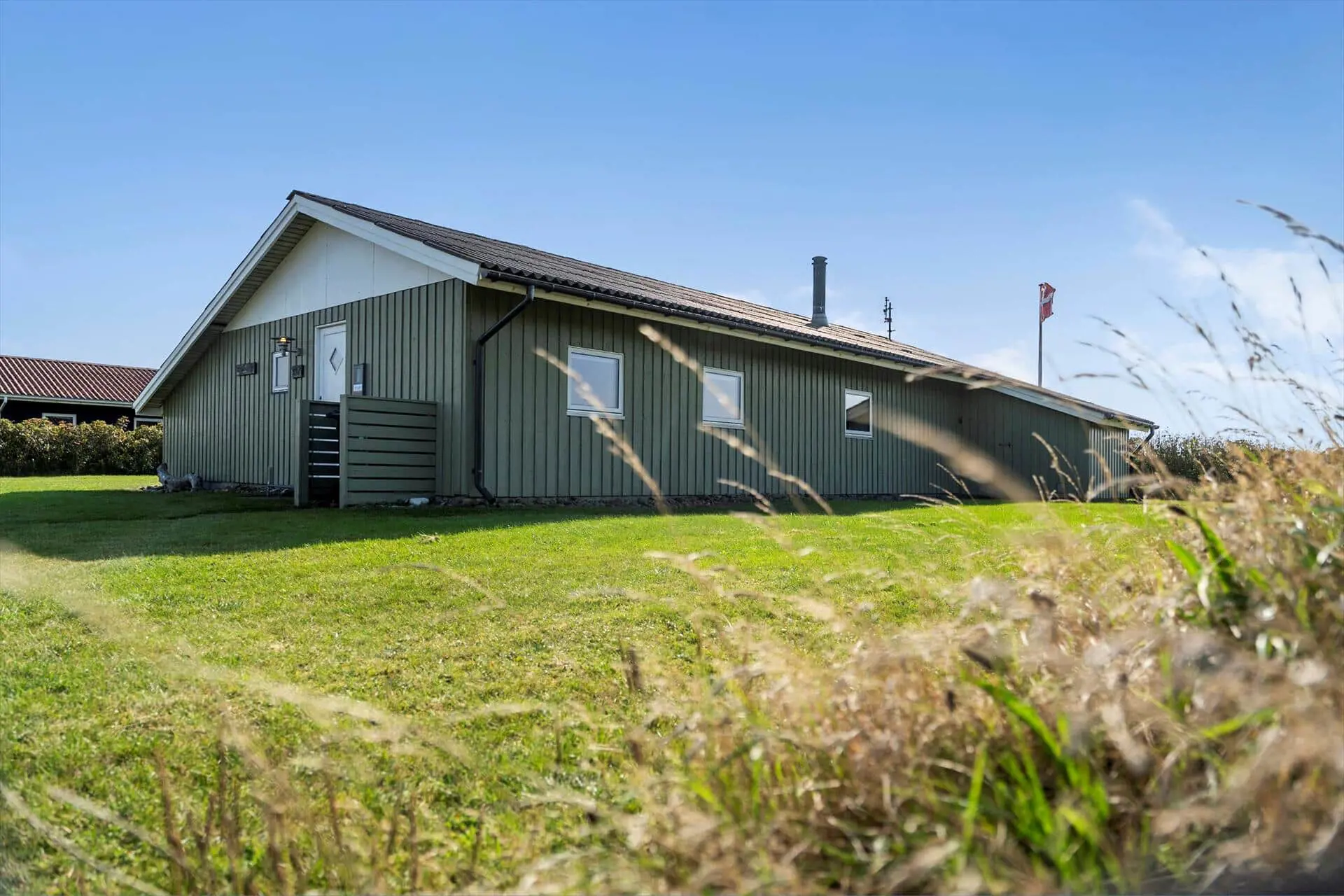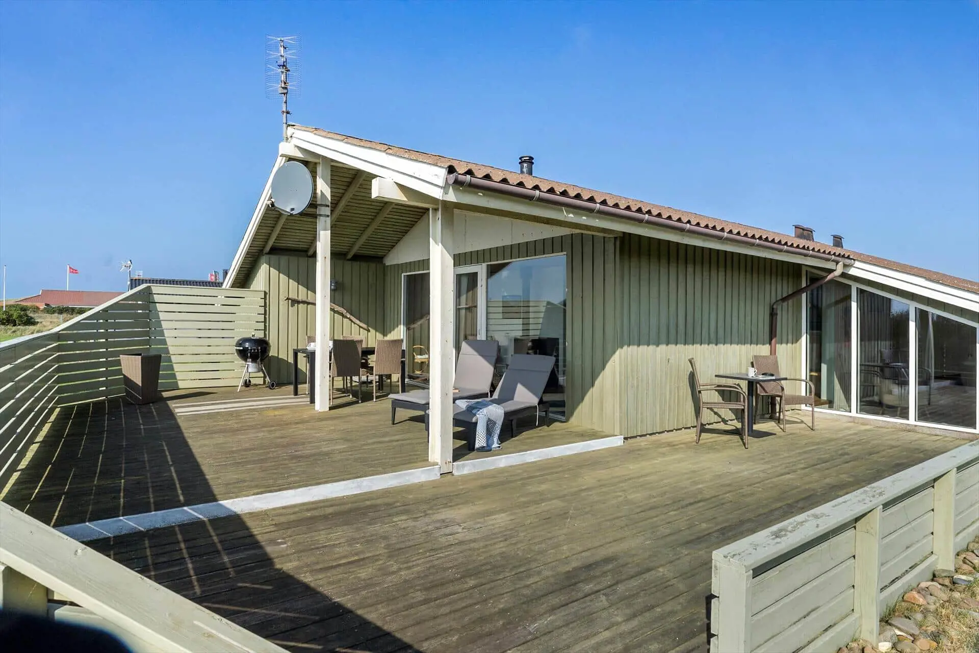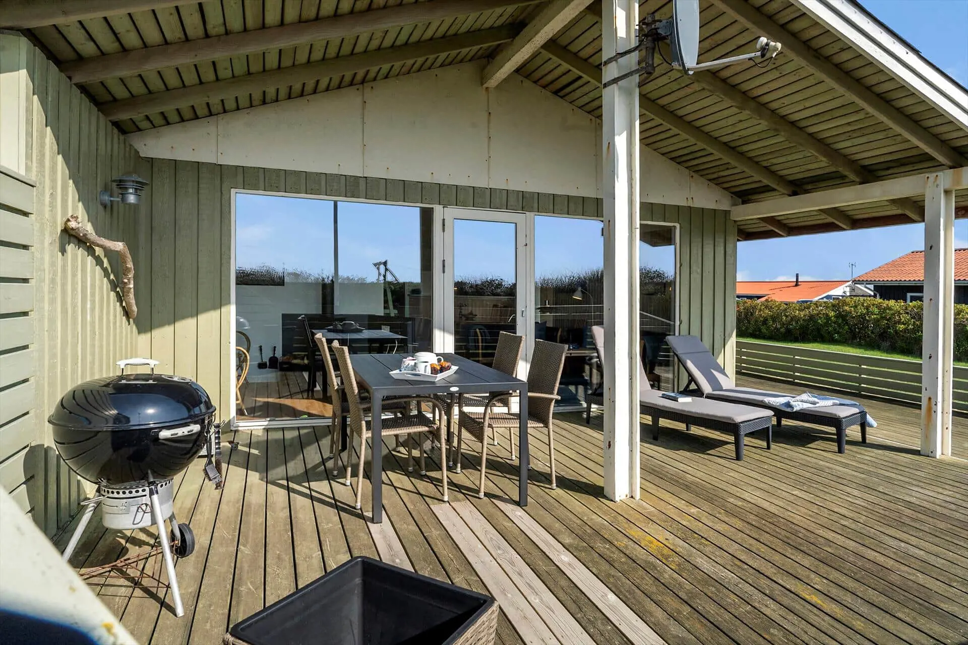 Vom Wohnzimmer aus gelangst du direkt auf eine teilweise überdachte Terrasse – der perfekte Ort, um die erste Tasse Kaffee des Tages in aller Ruhe zu genießen, während die Sonne aufgeht. An warmen Sommertagen kannst du es dir auf den Liegestühlen bequem machen, während die Kinder auf der Rasenfläche spielen. Wenn der Abend hereinbricht, wartet der Grill – vielleicht mit einem frisch gefangenen Fisch.Das Haus ist von Dünen umgeben, die nicht nur Windschutz bieten, sondern auch eine gemütliche und intime Atmosphäre schaffen, in der du vollkommen abschalten kannst.