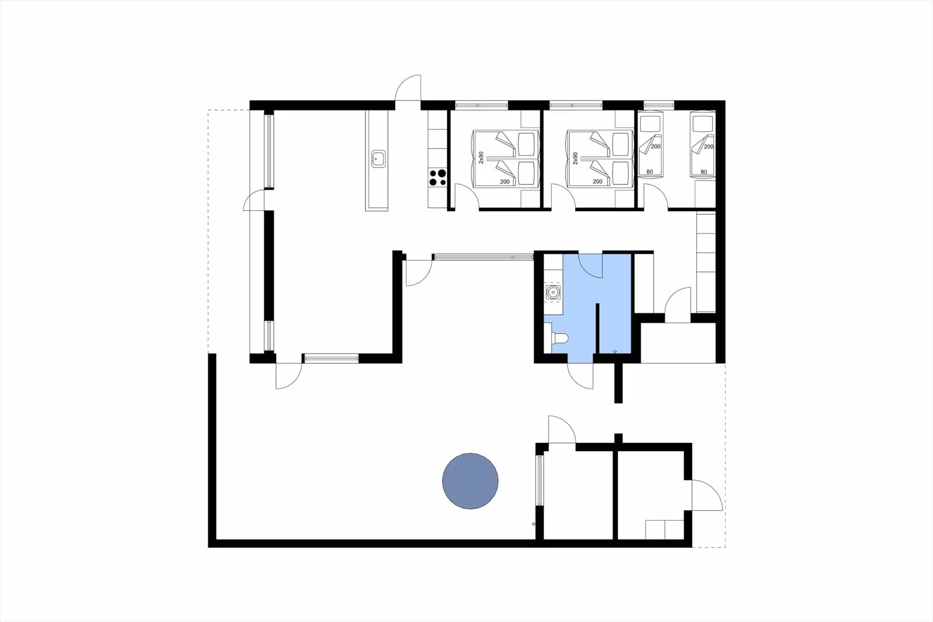 Schon beim Eintreten wirst du von einer hellen und gemütlichen Atmosphäre empfangen. Die Einrichtung ist schlicht und einladend, und große Glasfronten sorgen dafür, dass das Tageslicht ins Wohnzimmer strömt. Die Küche ist offen in den Wohnbereich integriert, sodass es leichtfällt, sich beim Kochen zu versammeln, während der Rest der Familie eine Partie Karten spielt oder gemeinsam einen Film auf dem Sofa genießt. Ein echter Treffpunkt, an dem ihr zur Ruhe kommt und die kleinen Ferienmomente gemeinsam erlebt. Das Ferienhaus bietet genügend Platz, damit sich sowohl Kinder als auch Erwachsene wohlfühlen können.