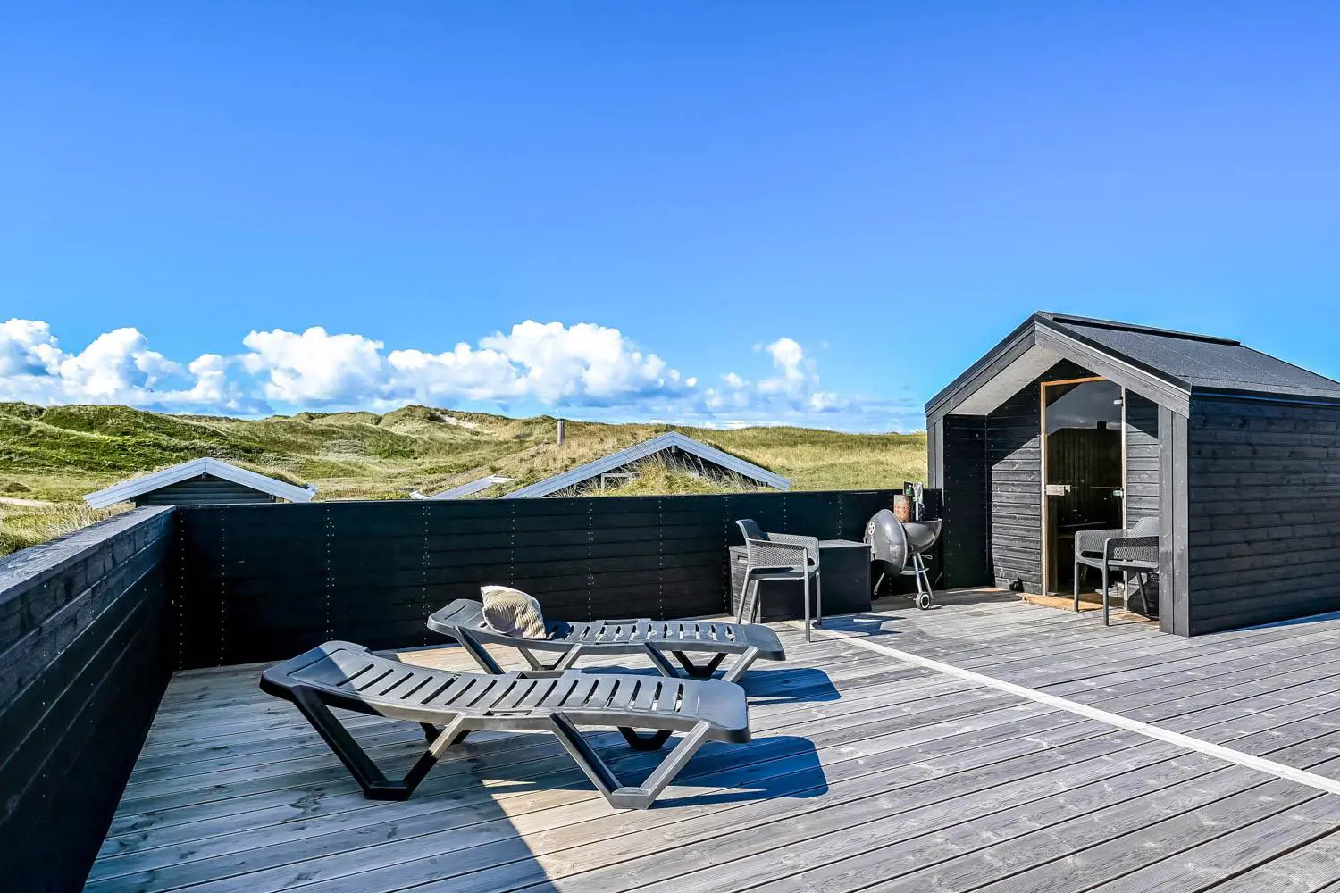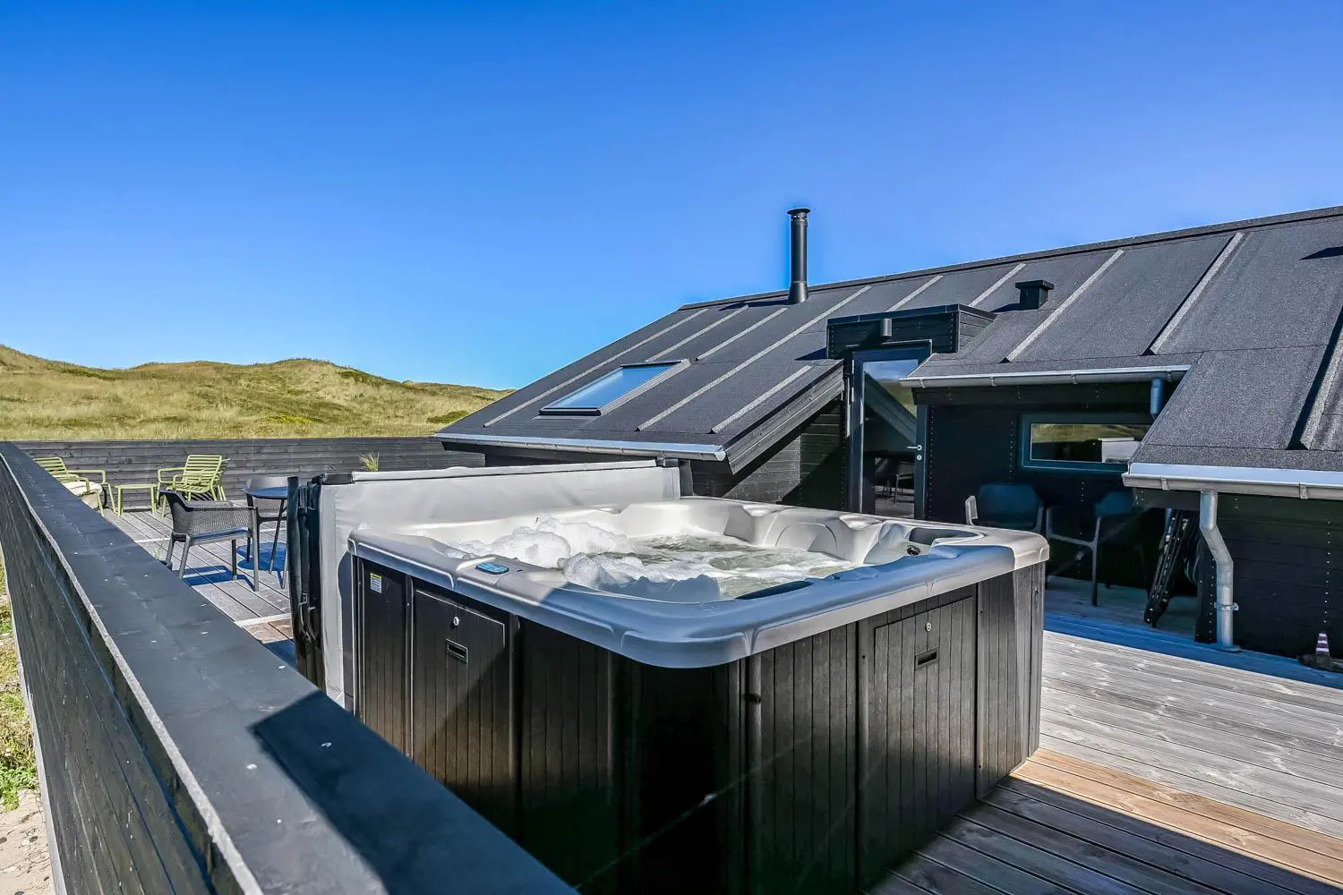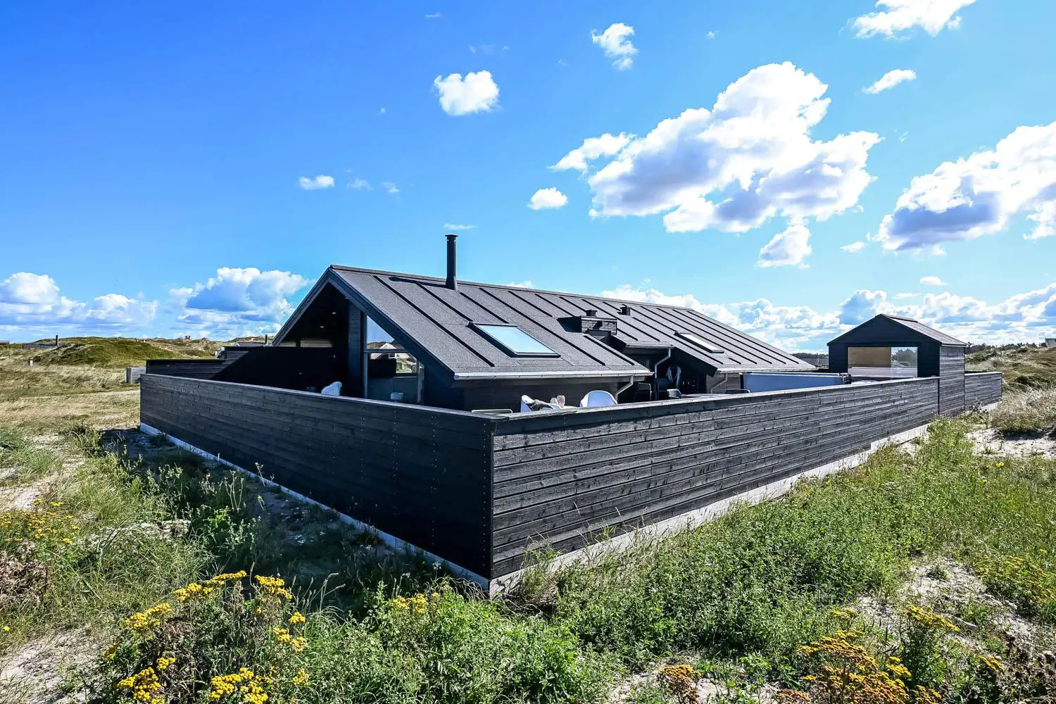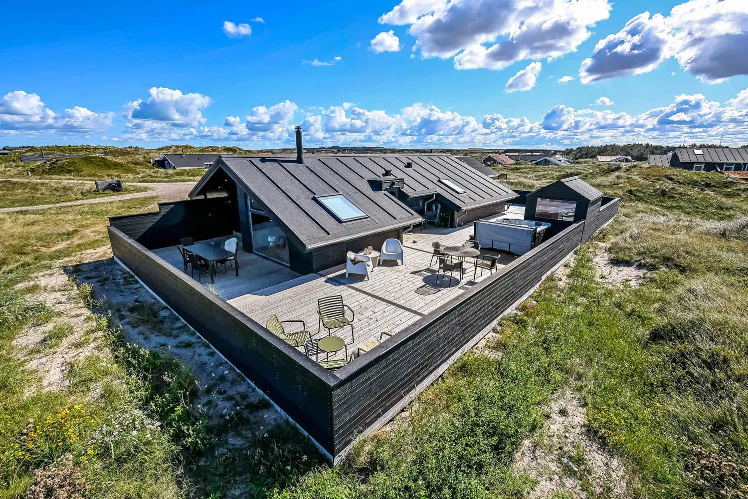 Es gibt viel Platz auf dem 1350 qm großen Dünengrundstück; auf der prachtvollen Terrassen-Anlage gibt es viele Möglichkeiten, einen Platz in der Sonne oder im Schatten zu finden. Auch von hier aus haben Sie ein tollen Blick und es ist an das Meiste gedacht. Grill, Gartenmöbel und Sonnenliegen. Ein Ausflug in den aussen-Whirlpool im Freien macht das Erlebnis an dunklen Abenden mit klarem Sternenhimmel einzigartig und besonders. Ein einzigartiges Erlebnis, das reine Therapie für Körper und Seele ist. Das Haus liegt auf einem der besten Grundstücke in Velby Klit am Ende einer Schotterstraße. Vom Grundstück aus können Sie über einen Weg durch die Dünen bequem direkt über die Dünen zur Nordsee laufen, die nur 75 m vom Haus entfernt ist. So ist es nicht weit zu Strandvergnügen wie Schwimmen, Drachensteigen, Angeln oder Wandern an der frischen Luft, bei denen man manchmal völlig aus dem Häuschen sein kann. Darüber hinaus liegt das Haus in der Nähe einer der schönsten Rad-/Wanderrouten Westjütlands mit der Möglichkeit, See und Meer gleichzeitig zu sehen. Es liegt in der Nähe von Einkaufsmöglichkeiten und Restaurants. Das nächste saisonale Lebensmittelgeschäft befindet sich nur 400 Meter entfernt am Vejlby Torv, wo es auch ein Café/Restaurant gibt. Wir empfehlen auch einen Besuch der Hafenstadt Thyborøn, 15 km nördlich des Sommerhauses, oder der alten Marktstadt Lemvig, 13 km östlich. Dieses Haus bietet eine einzigartige Lage und Aussicht und eignet sich für Paare oder Familien, die nahe am Meer auf einem schönen Dünengrundstück wohnen und ein ganz besonderes Erlebnis erleben möchten, das sie nie vergessen werden.