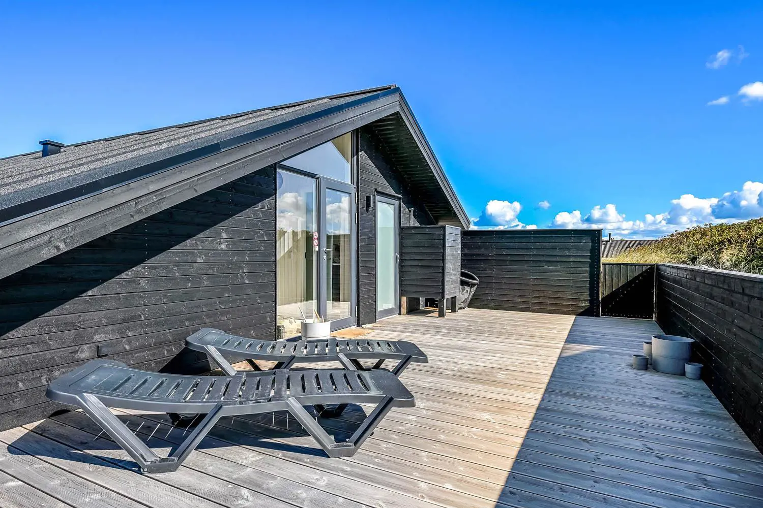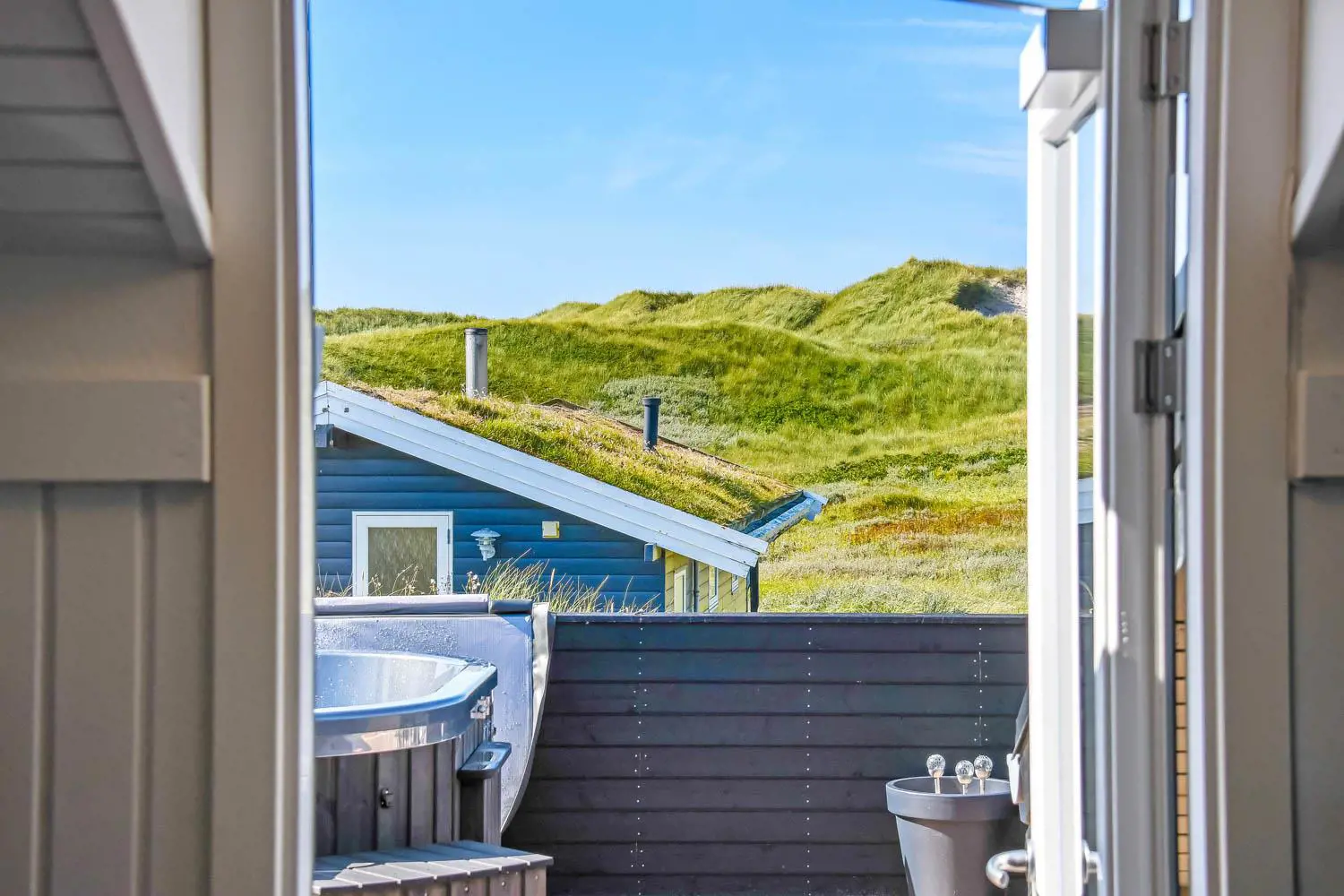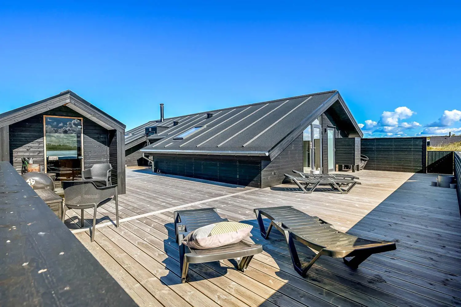 Es gibt viel Platz auf dem 1350 qm großen Dünengrundstück; auf der prachtvollen Terrassen-Anlage gibt es viele Möglichkeiten, einen Platz in der Sonne oder im Schatten zu finden. Auch von hier aus haben Sie ein tollen Blick und es ist an das Meiste gedacht. Grill, Gartenmöbel und Sonnenliegen. Ein Ausflug in den aussen-Whirlpool im Freien macht das Erlebnis an dunklen Abenden mit klarem Sternenhimmel einzigartig und besonders. Ein einzigartiges Erlebnis, das reine Therapie für Körper und Seele ist. Das Haus liegt auf einem der besten Grundstücke in Velby Klit am Ende einer Schotterstraße. Vom Grundstück aus können Sie über einen Weg durch die Dünen bequem direkt über die Dünen zur Nordsee laufen, die nur 75 m vom Haus entfernt ist. So ist es nicht weit zu Strandvergnügen wie Schwimmen, Drachensteigen, Angeln oder Wandern an der frischen Luft, bei denen man manchmal völlig aus dem Häuschen sein kann. Darüber hinaus liegt das Haus in der Nähe einer der schönsten Rad-/Wanderrouten Westjütlands mit der Möglichkeit, See und Meer gleichzeitig zu sehen. Es liegt in der Nähe von Einkaufsmöglichkeiten und Restaurants. Das nächste saisonale Lebensmittelgeschäft befindet sich nur 400 Meter entfernt am Vejlby Torv, wo es auch ein Café/Restaurant gibt. Wir empfehlen auch einen Besuch der Hafenstadt Thyborøn, 15 km nördlich des Sommerhauses, oder der alten Marktstadt Lemvig, 13 km östlich. Dieses Haus bietet eine einzigartige Lage und Aussicht und eignet sich für Paare oder Familien, die nahe am Meer auf einem schönen Dünengrundstück wohnen und ein ganz besonderes Erlebnis erleben möchten, das sie nie vergessen werden.