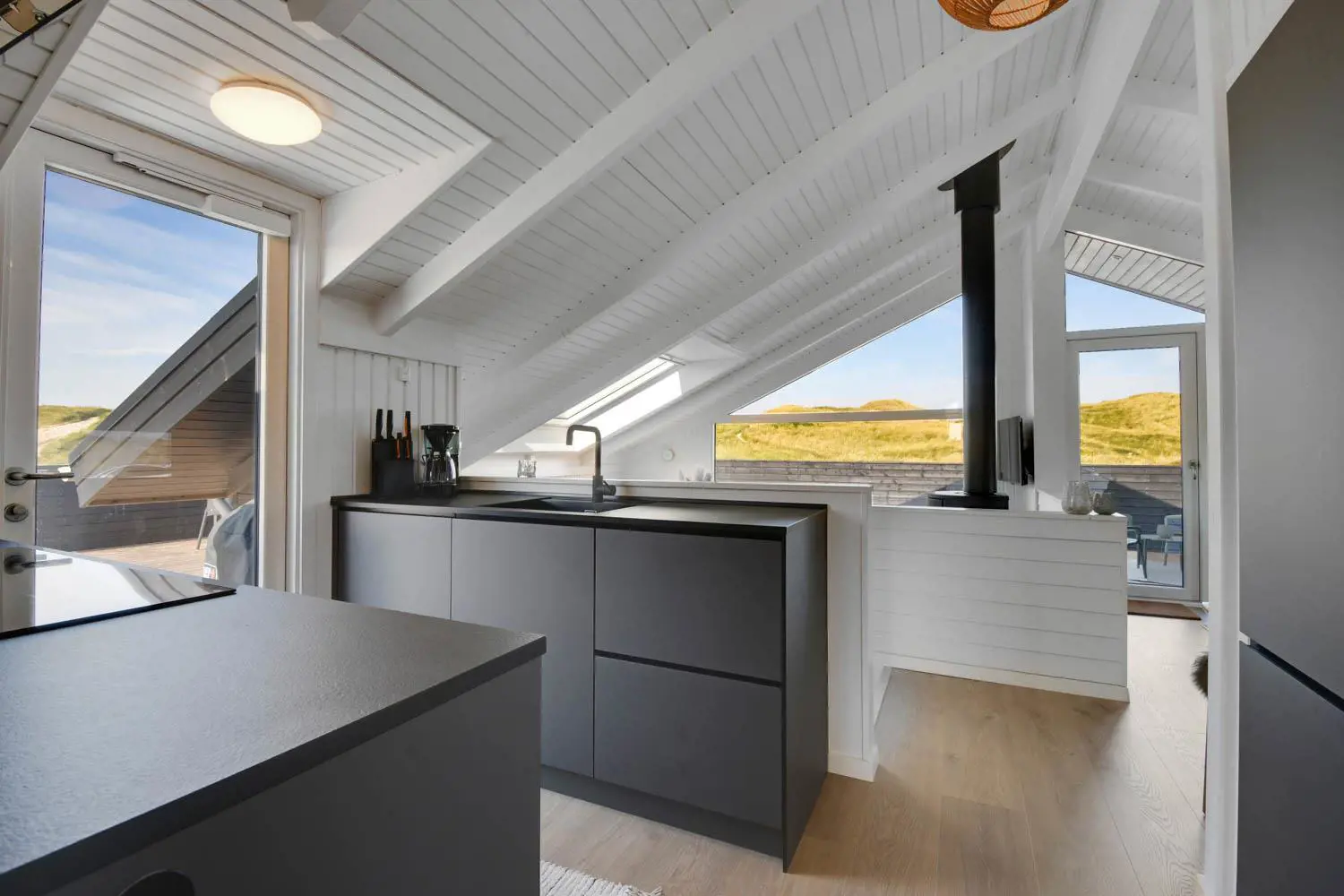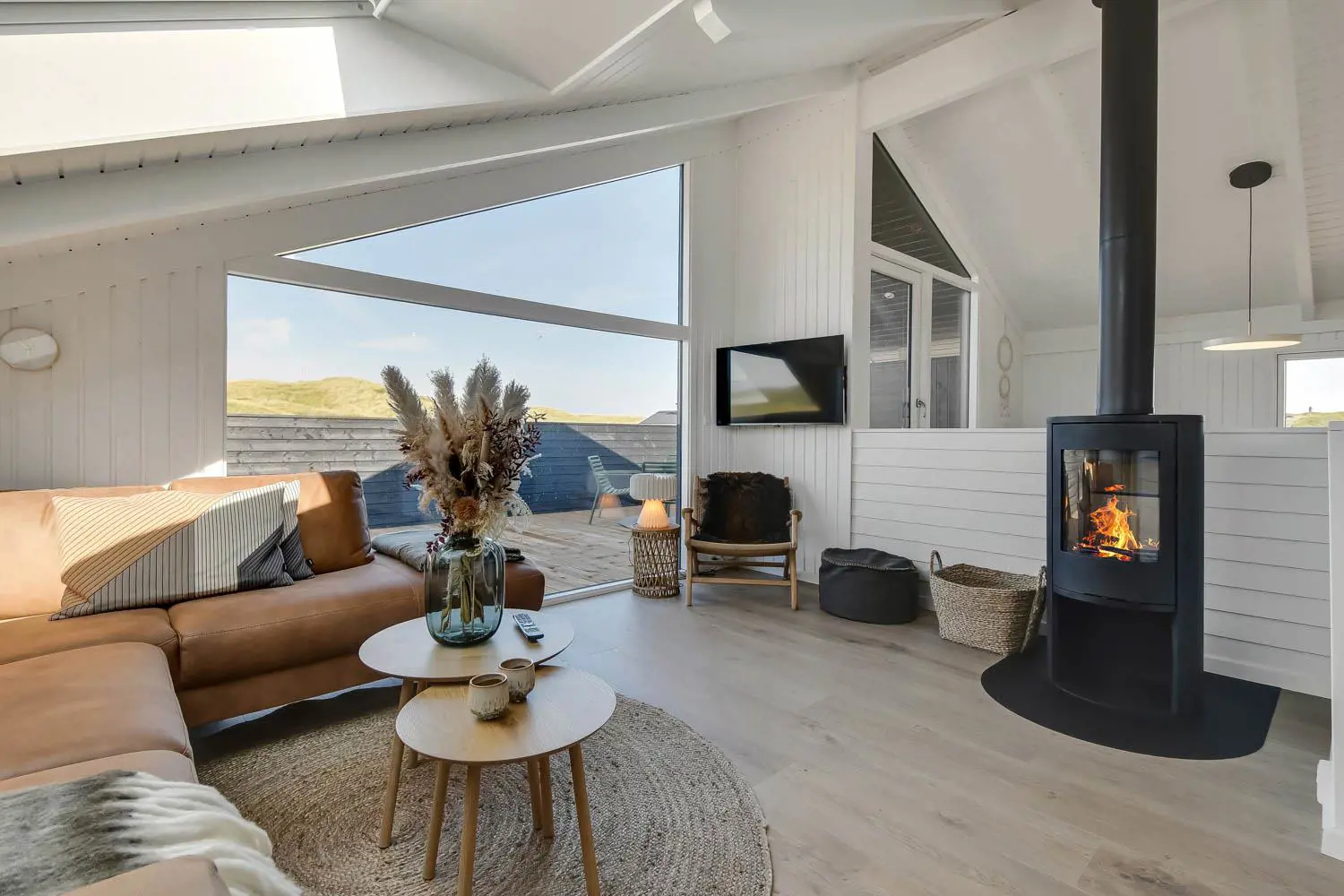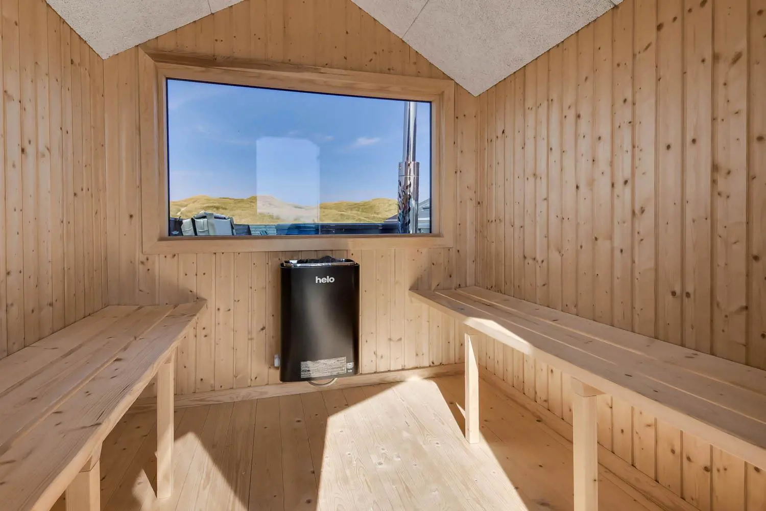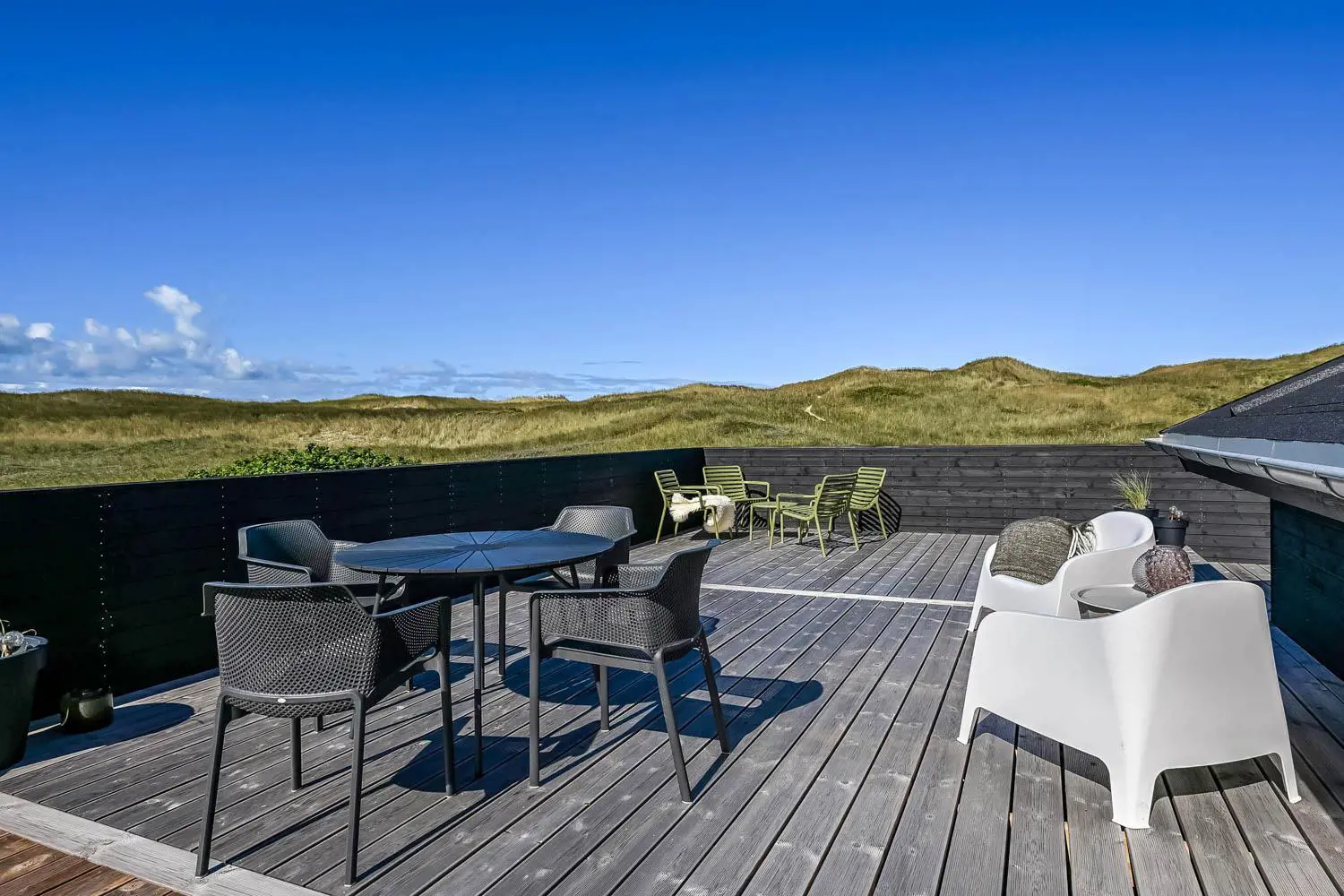 Es gibt viel Platz auf dem 1350 qm großen Dünengrundstück; auf der prachtvollen Terrassen-Anlage gibt es viele Möglichkeiten, einen Platz in der Sonne oder im Schatten zu finden. Auch von hier aus haben Sie ein tollen Blick und es ist an das Meiste gedacht. Grill, Gartenmöbel und Sonnenliegen. Ein Ausflug in den aussen-Whirlpool im Freien macht das Erlebnis an dunklen Abenden mit klarem Sternenhimmel einzigartig und besonders. Ein einzigartiges Erlebnis, das reine Therapie für Körper und Seele ist. Das Haus liegt auf einem der besten Grundstücke in Velby Klit am Ende einer Schotterstraße. Vom Grundstück aus können Sie über einen Weg durch die Dünen bequem direkt über die Dünen zur Nordsee laufen, die nur 75 m vom Haus entfernt ist. So ist es nicht weit zu Strandvergnügen wie Schwimmen, Drachensteigen, Angeln oder Wandern an der frischen Luft, bei denen man manchmal völlig aus dem Häuschen sein kann. Darüber hinaus liegt das Haus in der Nähe einer der schönsten Rad-/Wanderrouten Westjütlands mit der Möglichkeit, See und Meer gleichzeitig zu sehen. Es liegt in der Nähe von Einkaufsmöglichkeiten und Restaurants. Das nächste saisonale Lebensmittelgeschäft befindet sich nur 400 Meter entfernt am Vejlby Torv, wo es auch ein Café/Restaurant gibt. Wir empfehlen auch einen Besuch der Hafenstadt Thyborøn, 15 km nördlich des Sommerhauses, oder der alten Marktstadt Lemvig, 13 km östlich. Dieses Haus bietet eine einzigartige Lage und Aussicht und eignet sich für Paare oder Familien, die nahe am Meer auf einem schönen Dünengrundstück wohnen und ein ganz besonderes Erlebnis erleben möchten, das sie nie vergessen werden.