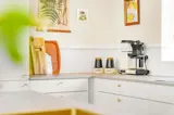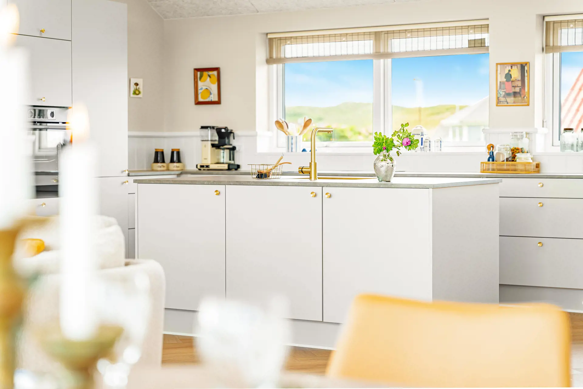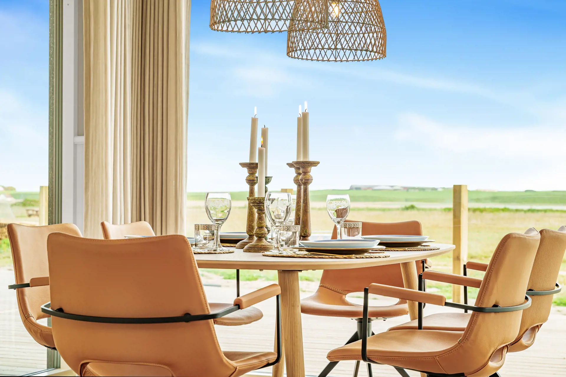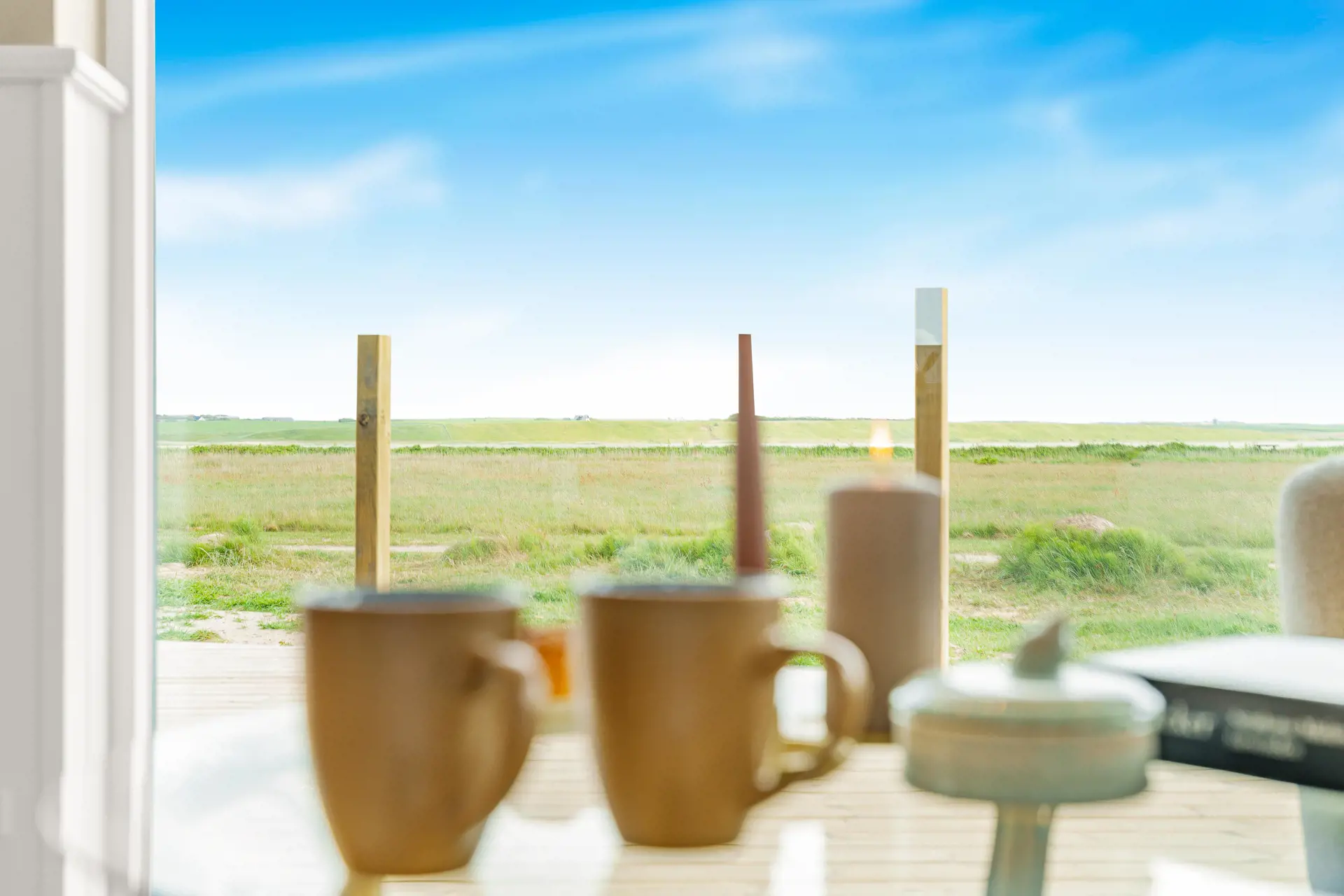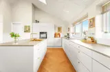 Die offene Küche verfügt u. a. über ein Induktionskochfeld mit integriertem Dunstabzug, Einbaubackofen, Geschirrspüler, Mikrowelle sowie Kühl-/Gefrierkombination. Die zubereiteten Mahlzeiten können am Esstisch in unmittelbarer Nähe zur Küche genossen werden – stets mit Blick auf den Ferring See und die umliegende Natur.