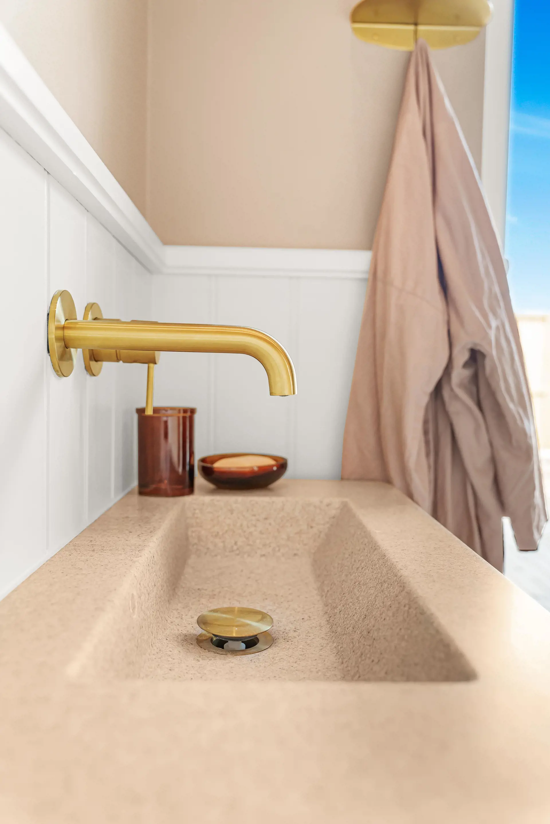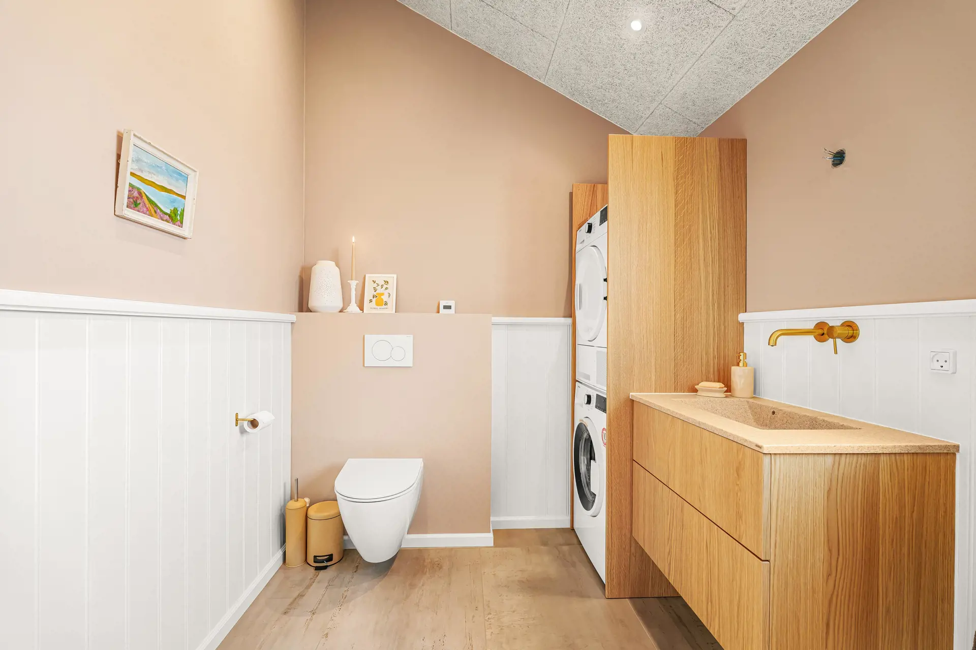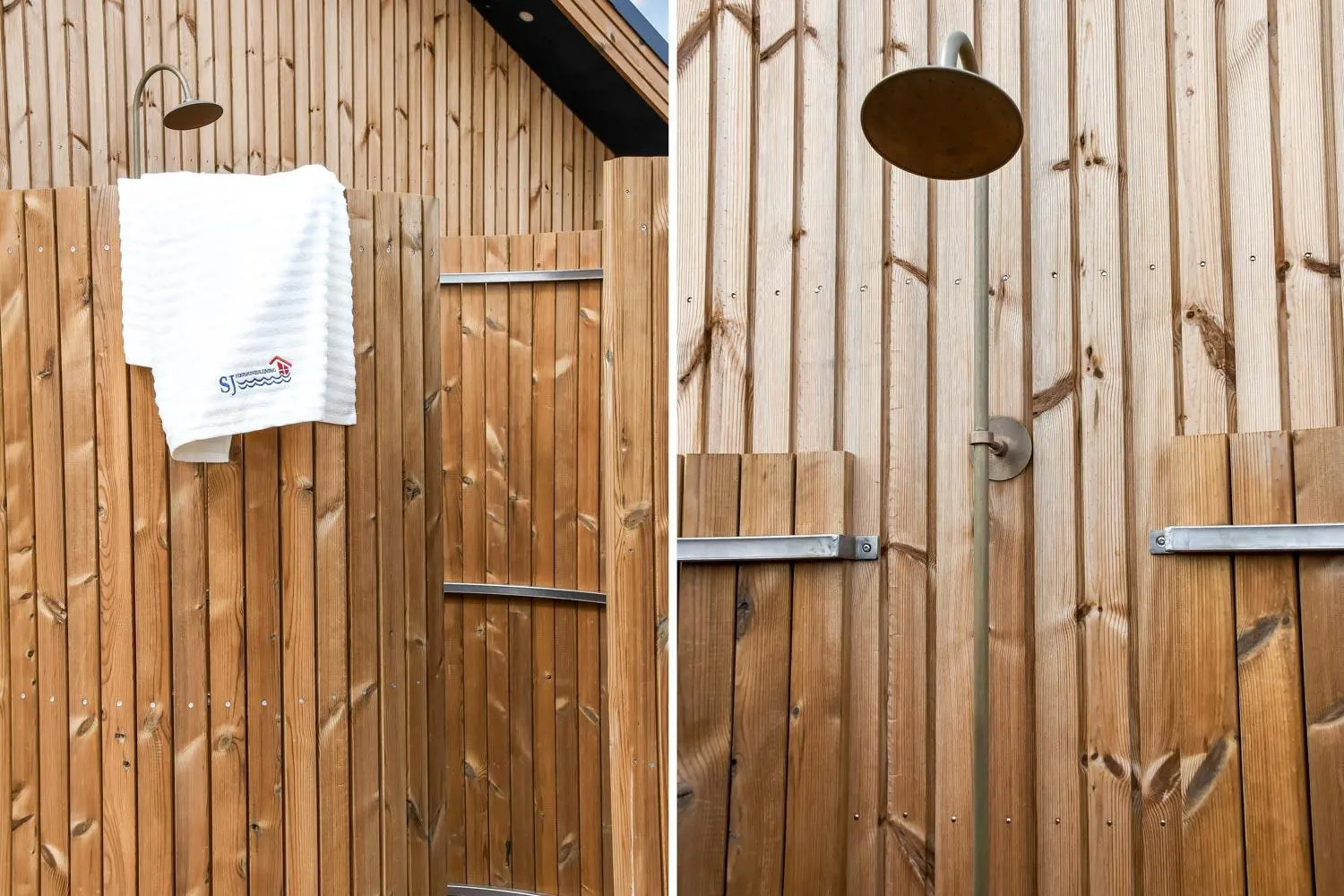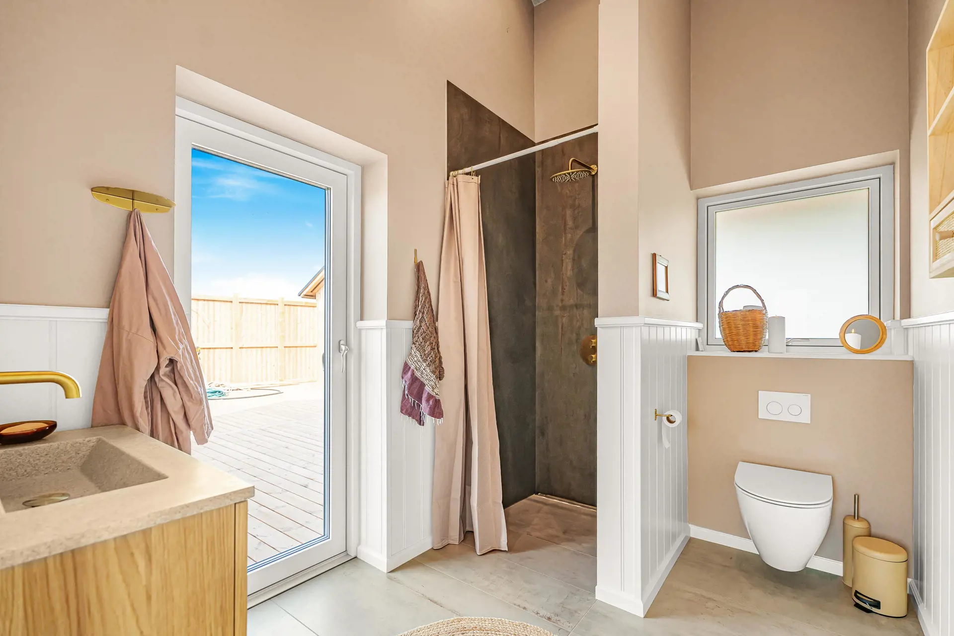 Es gibt zwei Badezimmer, beide mit WC, Waschbecken und Dusche. Eines der Badezimmer ist zusätzlich mit Waschmaschine und Trockner ausgestattet und verfügt über einen direkten Ausgang zur Terrasse sowie zu einer der Außenduschen – ideal nach einem Besuch am Nordseestrand.