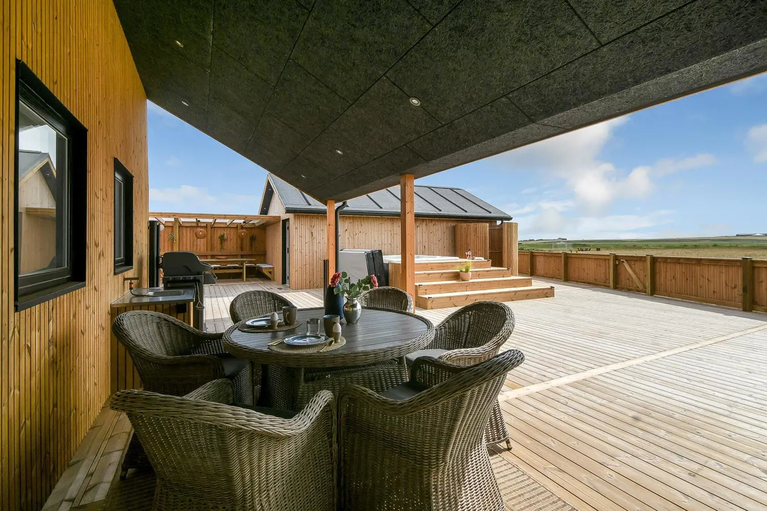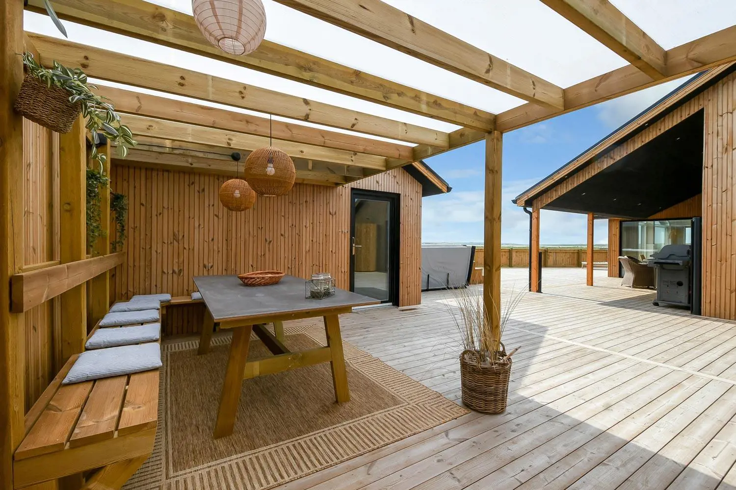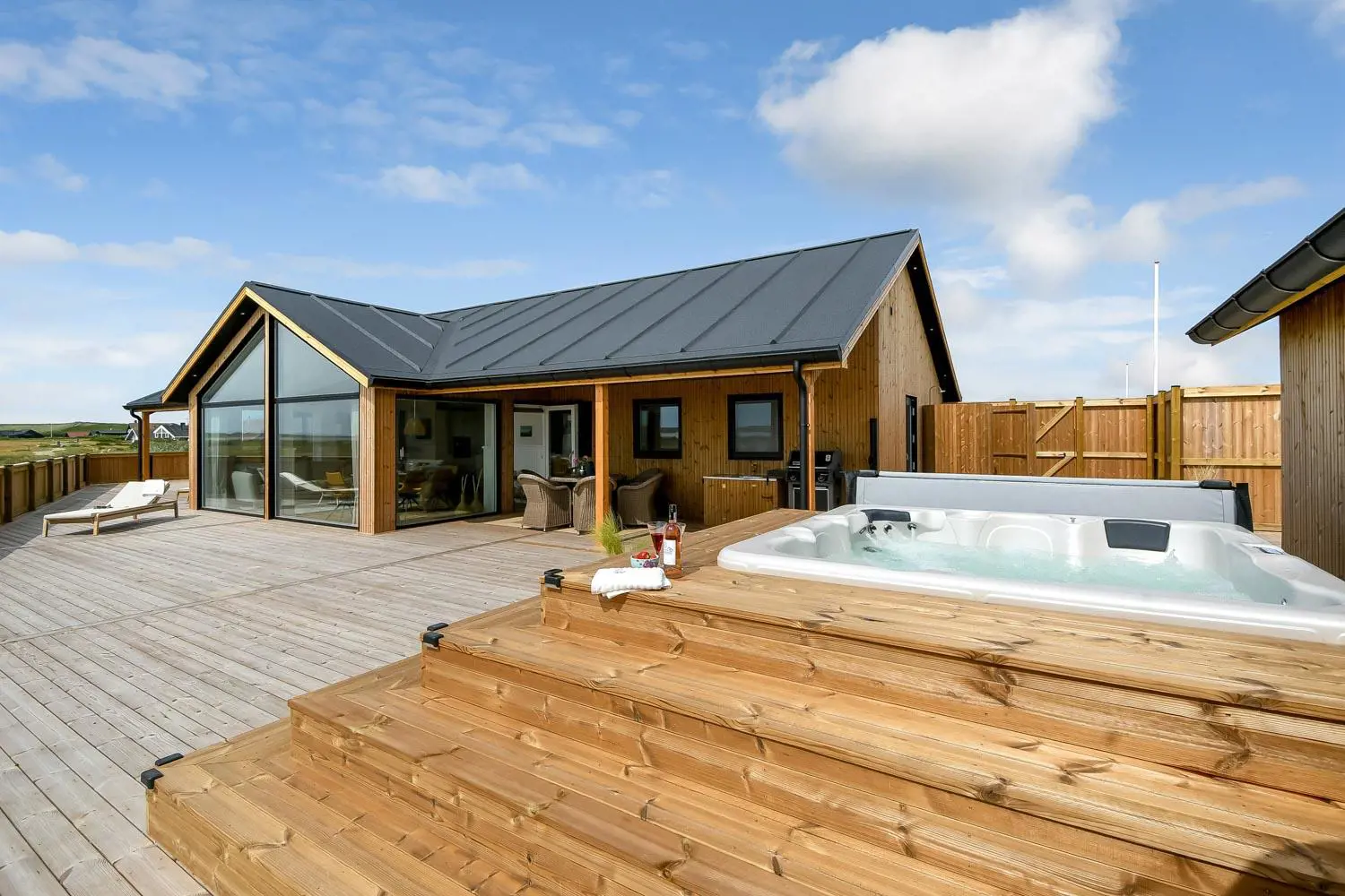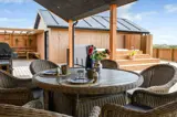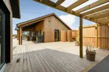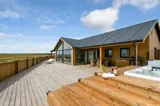 Rund um das Haus befindet sich eine sehr große, eingezäunte und teilweise überdachte Terrasse. Hier stehen Ihnen unter anderem ein Außen-Whirlpool sowie zwei Außenduschen mit warmem und kaltem Wasser zur Verfügung. Kostenloses Glasfaser-Internet ist vorhanden.