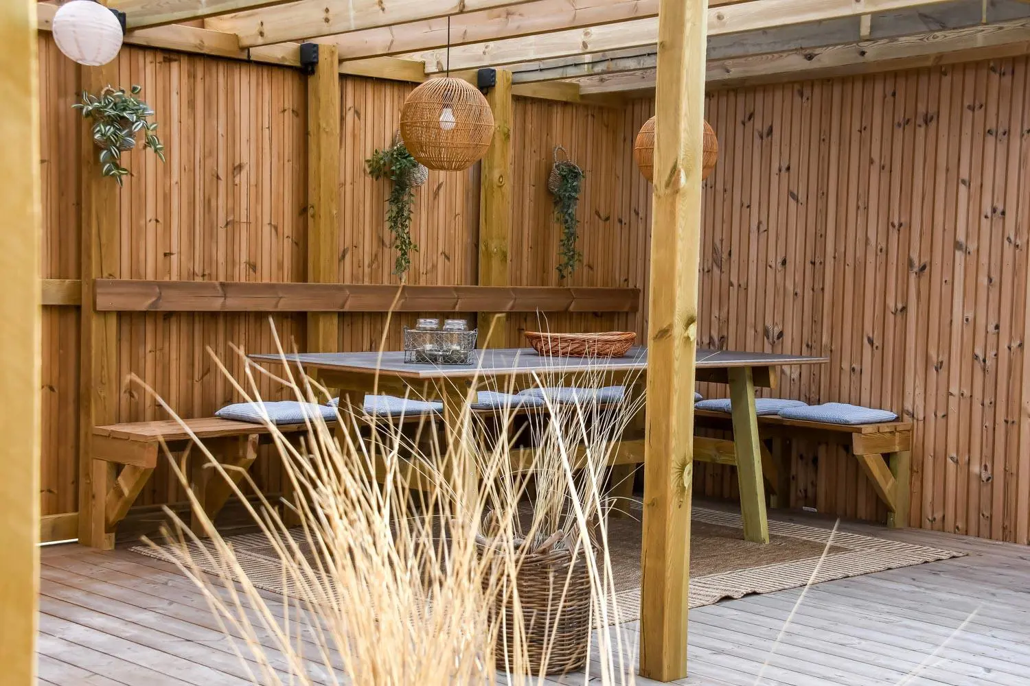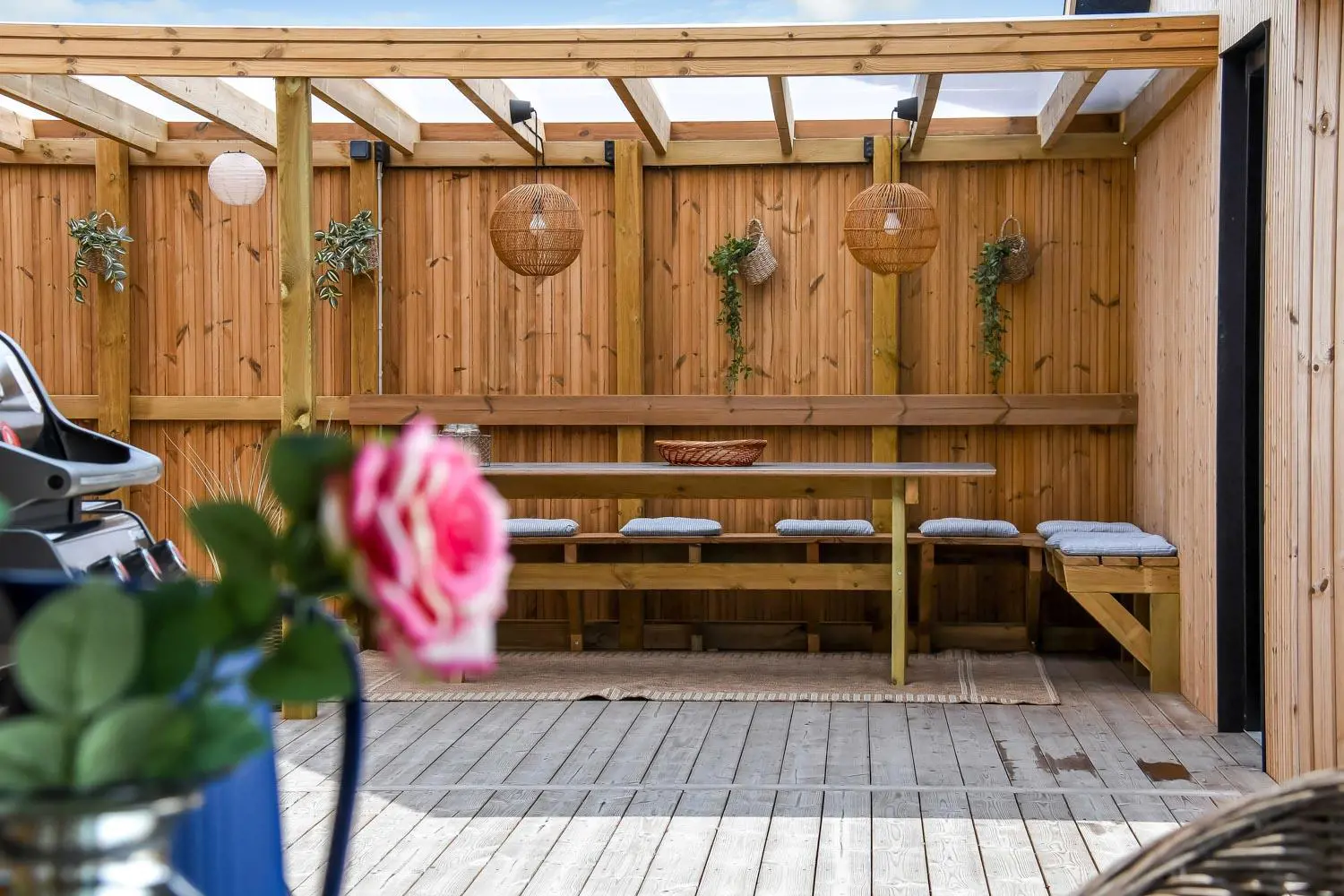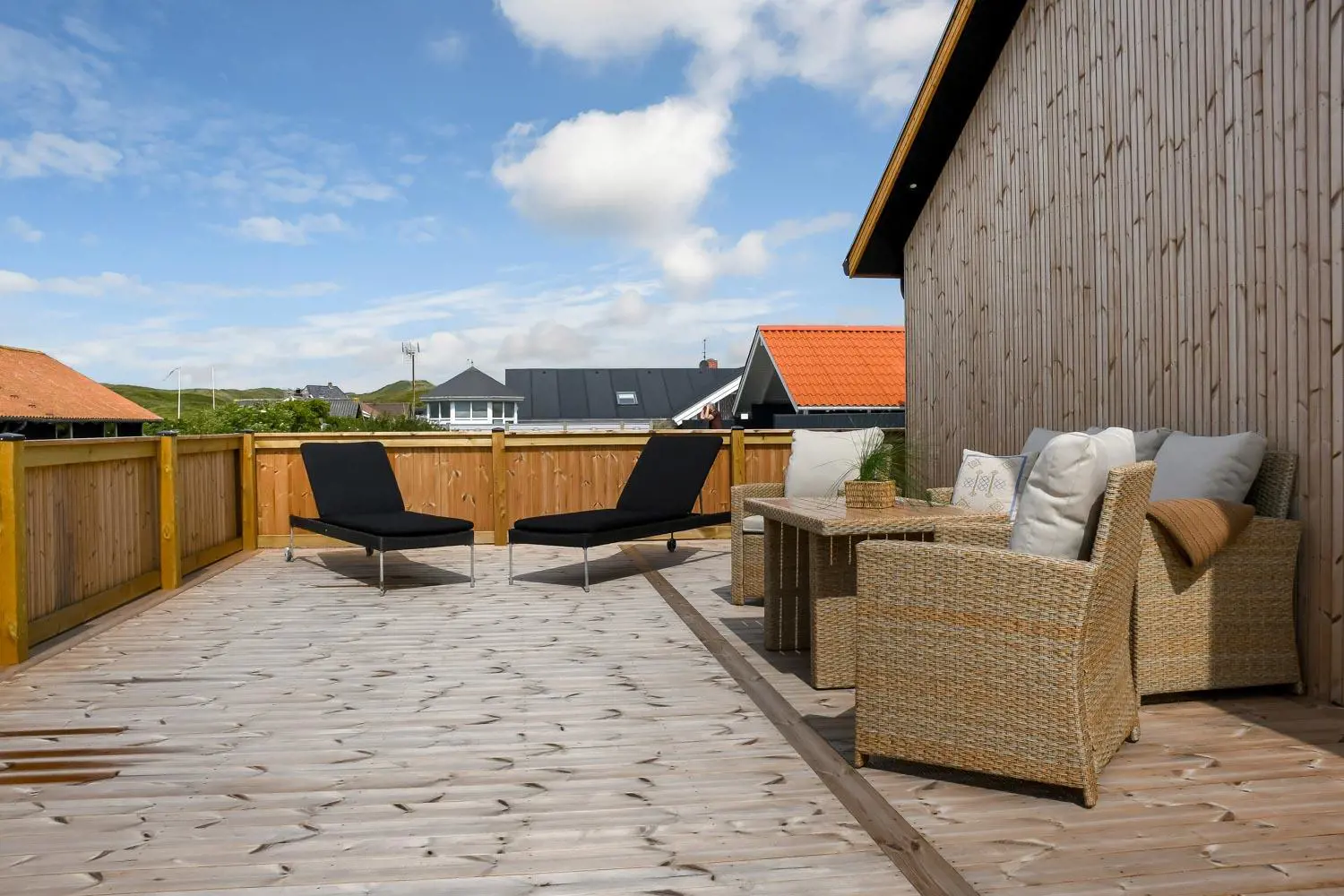 Rund um das Haus befindet sich eine sehr große, eingezäunte und teilweise überdachte Terrasse. Hier stehen Ihnen unter anderem ein Außen-Whirlpool sowie zwei Außenduschen mit warmem und kaltem Wasser zur Verfügung. Kostenloses Glasfaser-Internet ist vorhanden.