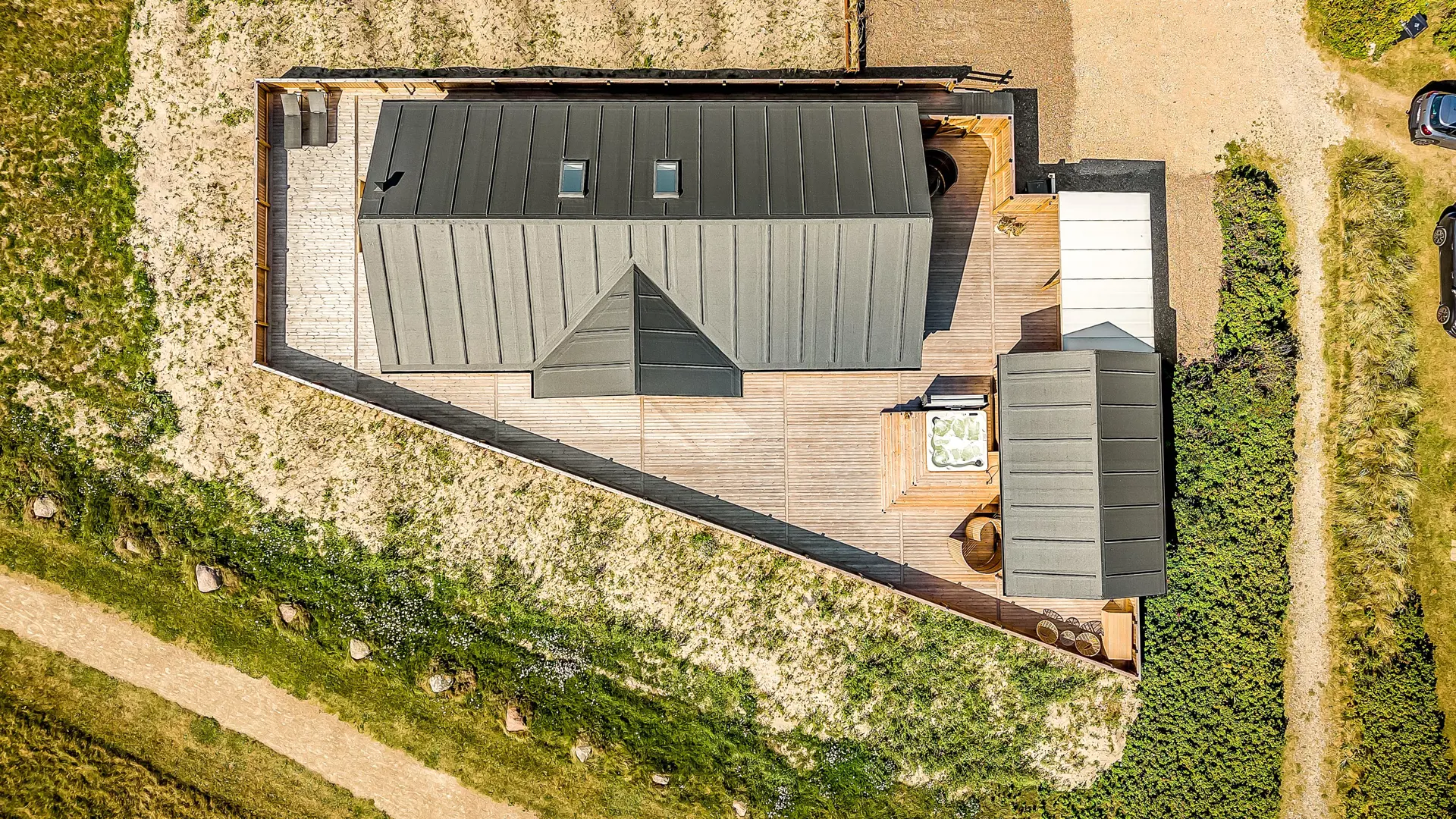 Schon bei der Anfahrt über den Schotterweg, nur wenige Meter vom Haus entfernt, wird deutlich, dass sowohl Lage als auch Haus etwas ganz Besonderes sind. Das Ferienhaus liegt auf einem Naturgrundstück am Ende einer Sackgasse.