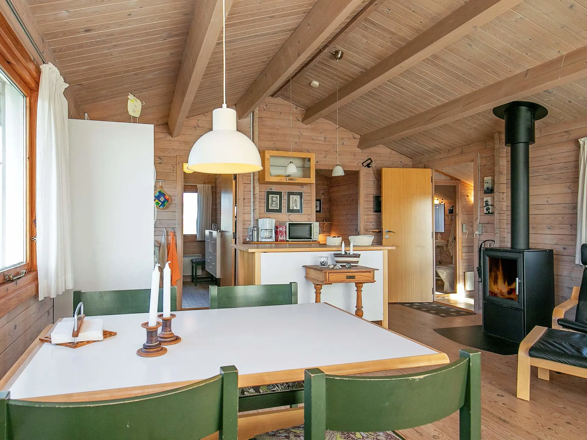 Das Ferienhaus ist gut eingerichtet und komfortabel möbliert. Es bietet u.a. einen offenen Küchen-/Wohnbereich mit Essecke und Holzofen. Im Ferienhaus selbst gbt es zwei Schlafzimmer. Außerdem steht nebenan auf dem Grundstück noch ein 11 m2 kleiner Annex mit zwei Doppelbetten in 3/4 Größe bzw. vier Schlafplätzen, ideal für Teenagner oder mitreisende Großeltern.