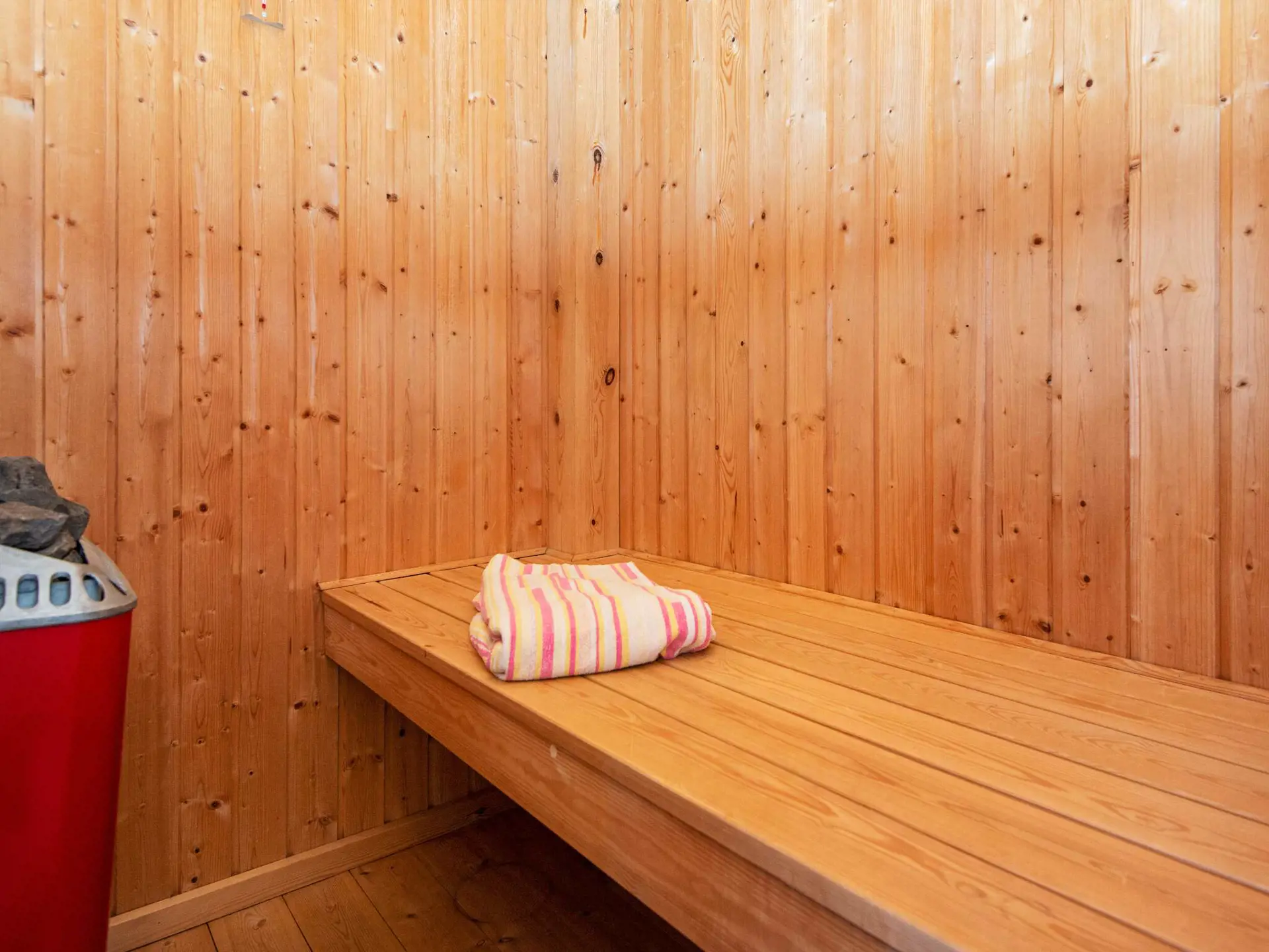 Helles Badezimmer mit 2-Personen Whirlwanne, Dusche, WC und kombiniertem Waschtrockner. Zusätzlich Sauna für 4 Personen. Zweites Bad mit Dusche und WC.