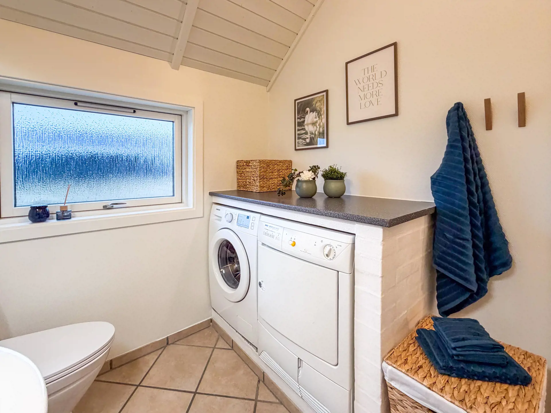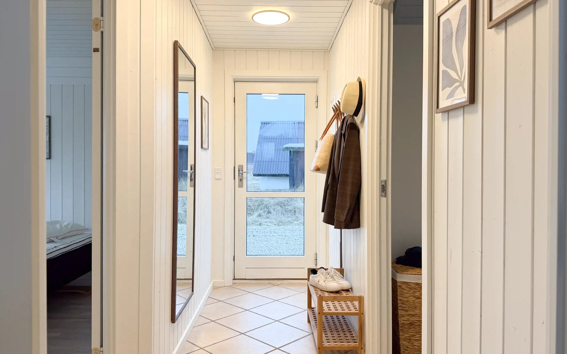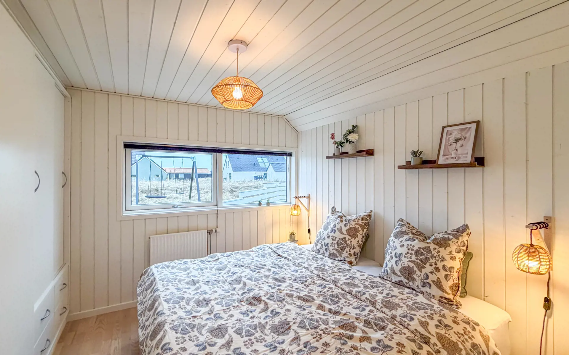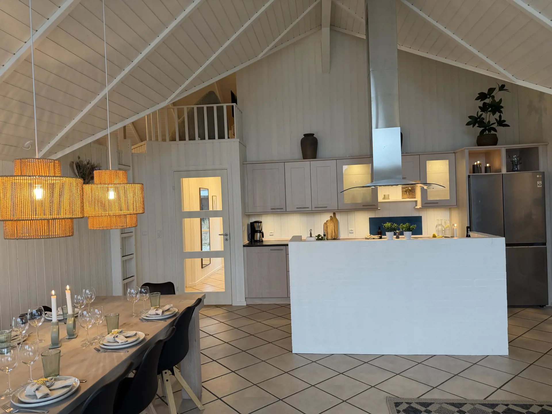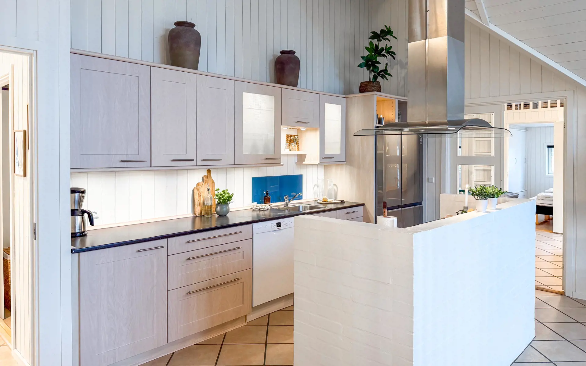 Im Inneren bietet das Haus 125 m² Wohnfläche mit einer durchdachten Raumaufteilung. Es gibt vier Schlafzimmer mit insgesamt vier Doppelbetten und einen Hems mit zwei Einzelbetten sowie zwei Badezimmer mit Dusche und WC. Eines der Badezimmer ist zusätzlich mit Waschmaschine und Trockner ausgestattet. Der natürliche Treffpunkt des Hauses ist der gemütliche Wohnbereich in offener Verbindung mit der Küche, wo Sie nach einem Tag am Meer gemeinsam kochen, essen oder entspannen können. Die Küche ist gut ausgestattet mit Herd, Dunstabzugshaube, Geschirrspüler, Mikrowelle, Kühlschrank, Gefrierschrank (60 l) sowie Kaffeemaschine. In Teilen des Hauses sorgt eine für zusätzlichen Komfort.