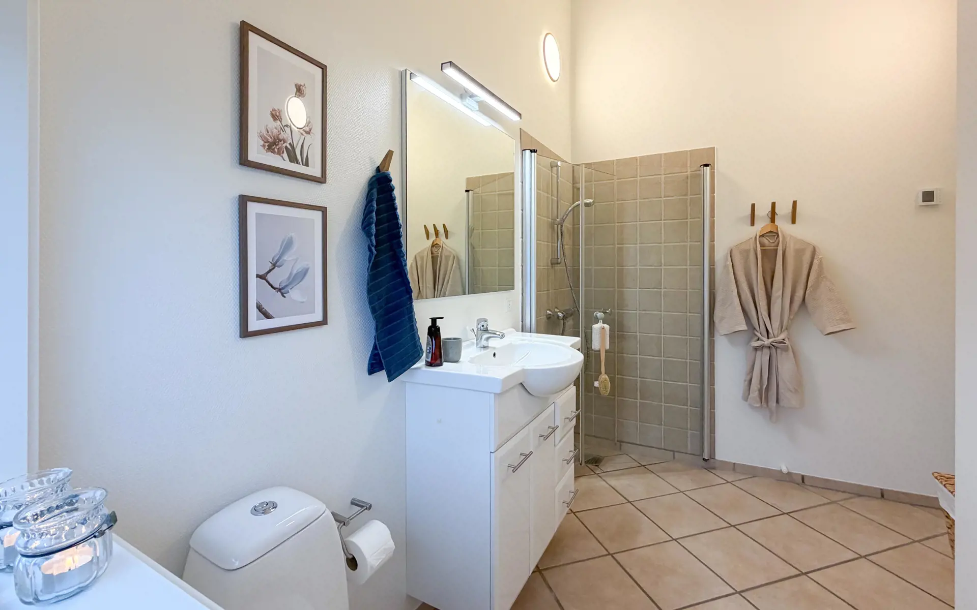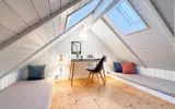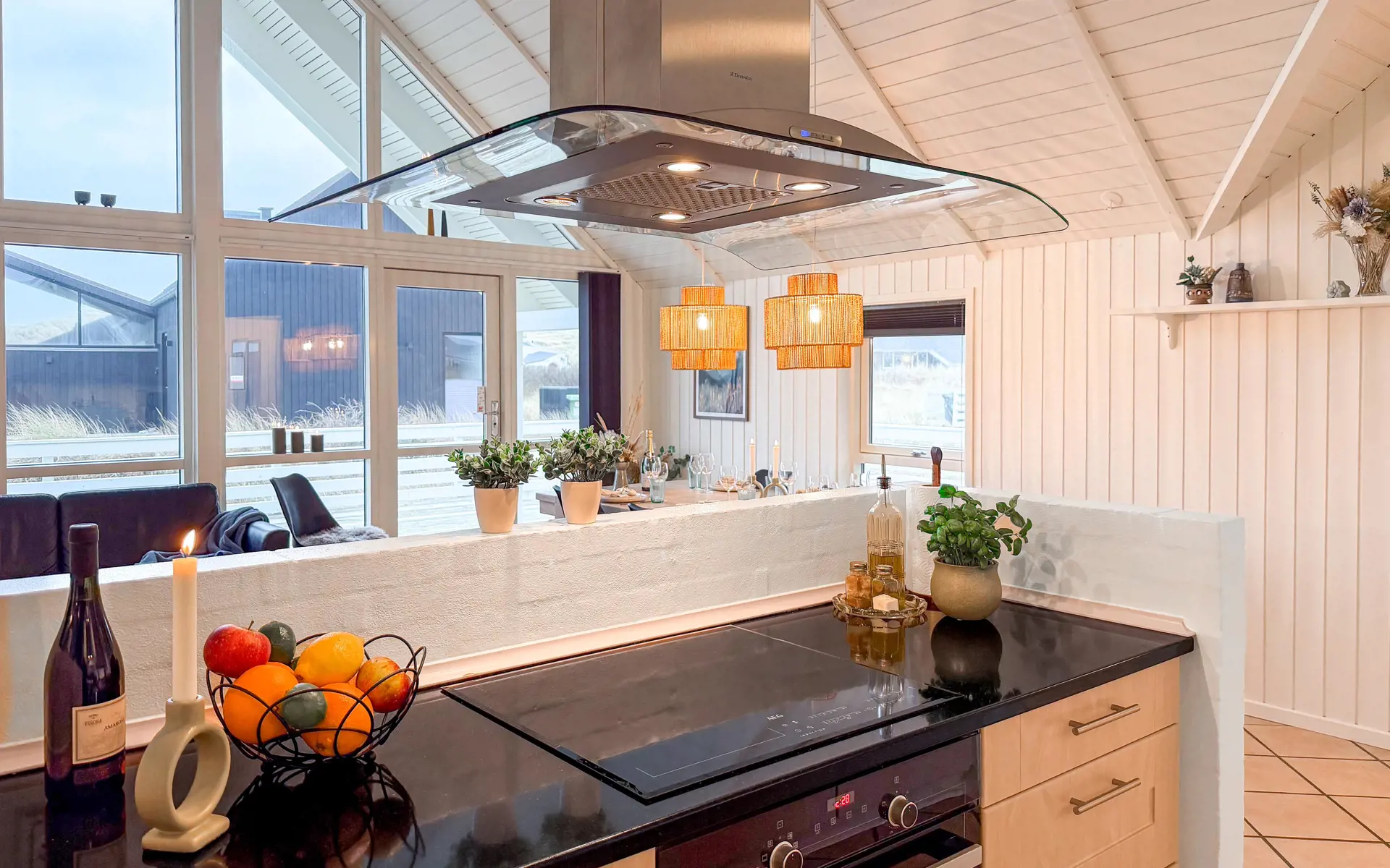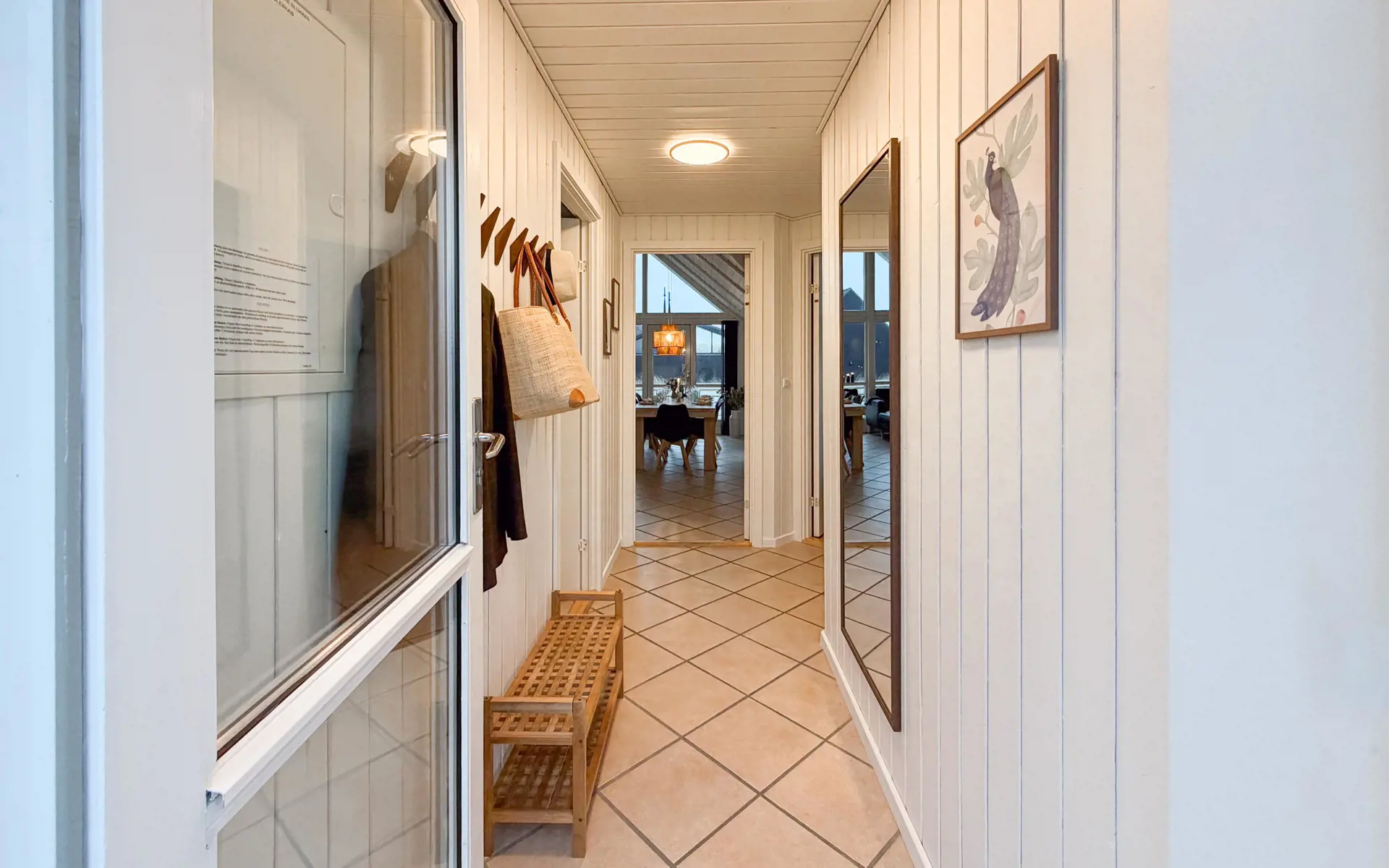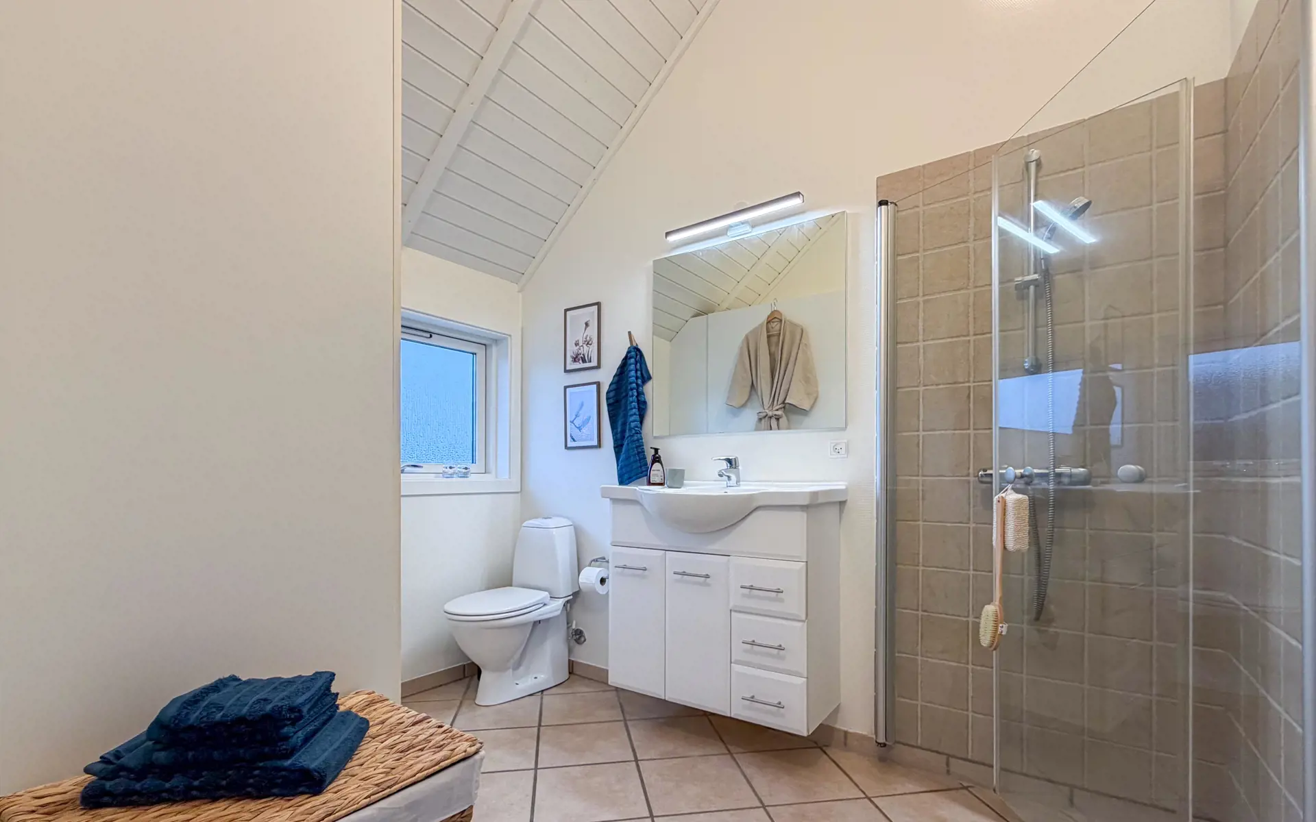 Im Inneren bietet das Haus 125 m² Wohnfläche mit einer durchdachten Raumaufteilung. Es gibt vier Schlafzimmer mit insgesamt vier Doppelbetten und einen Hems mit zwei Einzelbetten sowie zwei Badezimmer mit Dusche und WC. Eines der Badezimmer ist zusätzlich mit Waschmaschine und Trockner ausgestattet. Der natürliche Treffpunkt des Hauses ist der gemütliche Wohnbereich in offener Verbindung mit der Küche, wo Sie nach einem Tag am Meer gemeinsam kochen, essen oder entspannen können. Die Küche ist gut ausgestattet mit Herd, Dunstabzugshaube, Geschirrspüler, Mikrowelle, Kühlschrank, Gefrierschrank (60 l) sowie Kaffeemaschine. In Teilen des Hauses sorgt eine für zusätzlichen Komfort.