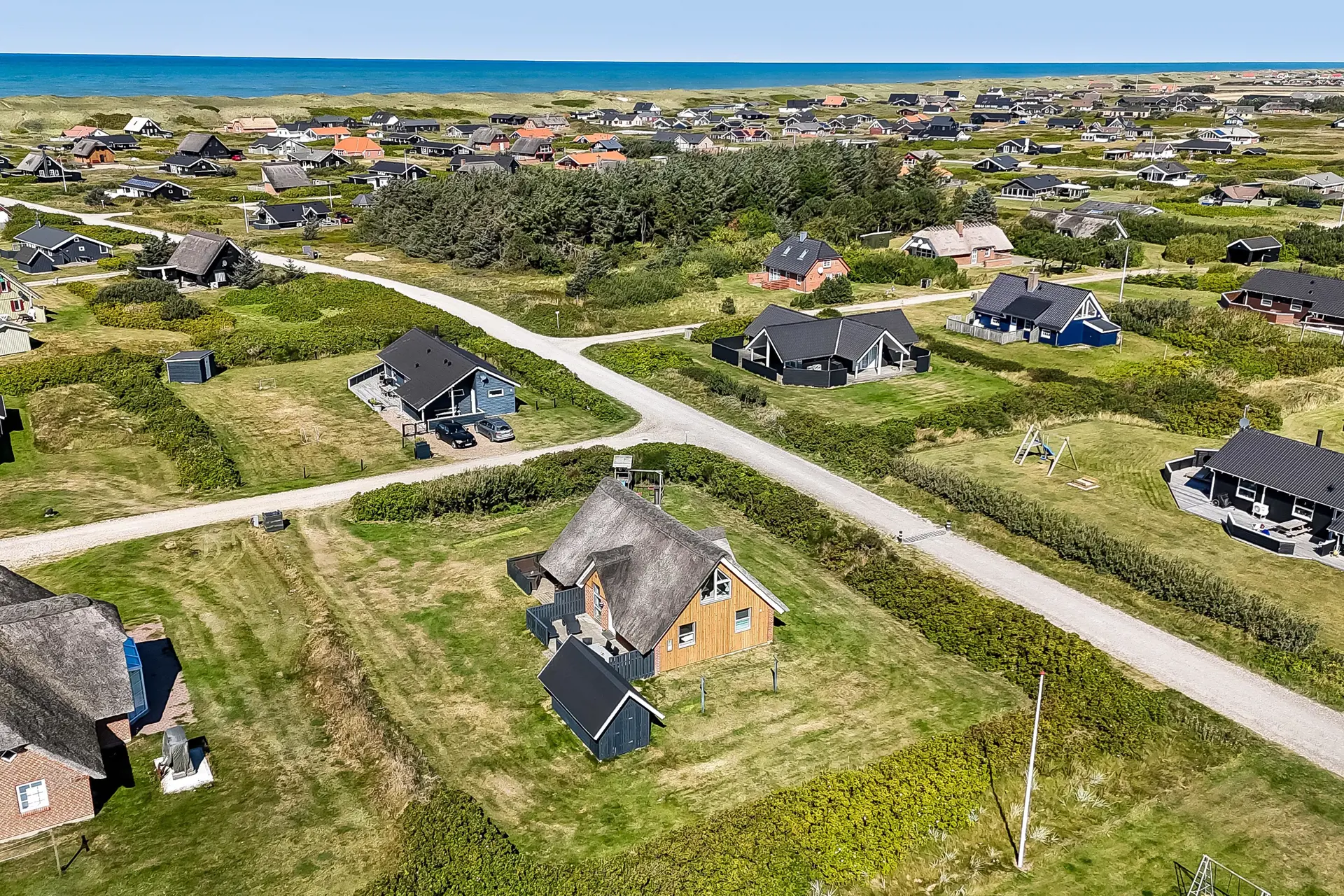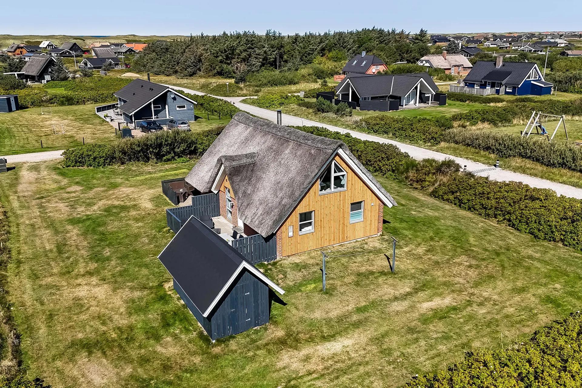 Das Haus liegt auf einem 1.200 m² großen Naturgrundstück, nur 300 Meter von der Nordsee entfernt. Zwei teilweise geschlossene Terrassen mit Gartenmöbeln, Grill und Sonnenliegen laden dazu ein, entweder ein windgeschütztes Plätzchen oder einen sonnigen Platz zu finden.