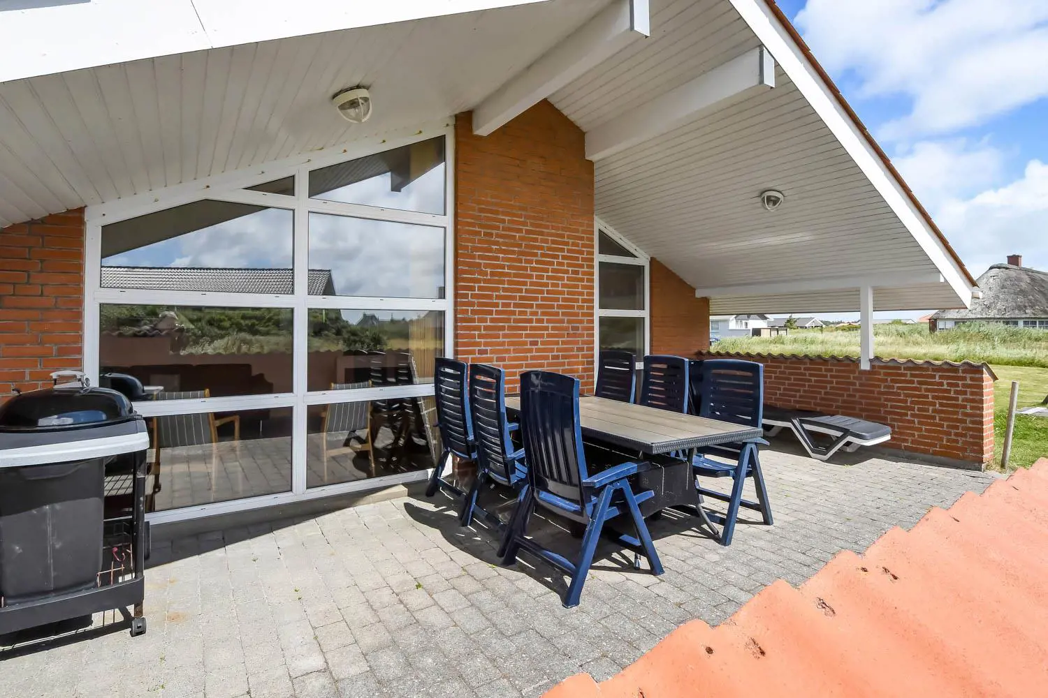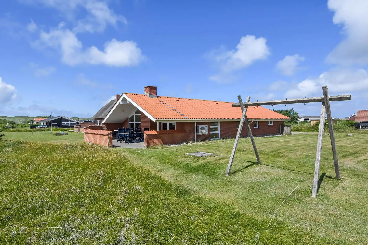 Das Haus liegt auf einem etwa 1573 qm großen Naturgrundstück dicht an der Nordsee. Vom Wohnraum gibt es Ausgang zu einer teilweise überdachten Terrasse mit einer Mauer, die Windschutz bietet. Es gibt Gartenmöbel, Sonnenliegen und Grill. Auf dem Grundstück gibt es eine Schaukel und Sandkasten für die kleinsten Gäste. Möchten Sie mehr als Strand und Wasser erleben, liegen Thyborøn und Lemvig eine kurze Autofahrt vom Haus entfernt. Der gemütliche Hafenort Thyborøn bietet gute Einkaufsmöglichkeiten, Aktivitäten und Attraktionen, die alle einen Besuch wert sind. Lemvig ist eine alte Handelsstadt, die sehr schön im Land der Hügel und Wellen liegt. Hier gibt es eine schöne Hafenpromenade, wo es auch einen Spielplatz gibt. Die Fußgängerzone bietet sehr gute Fachgeschäfte und auch gute Restaurants. Dieses Haus ist sehr gut geeignet für eine oder zwei Familien, die gerne zusammen Urlaub machen möchten in einem schönen Haus dicht an der Nordsee.