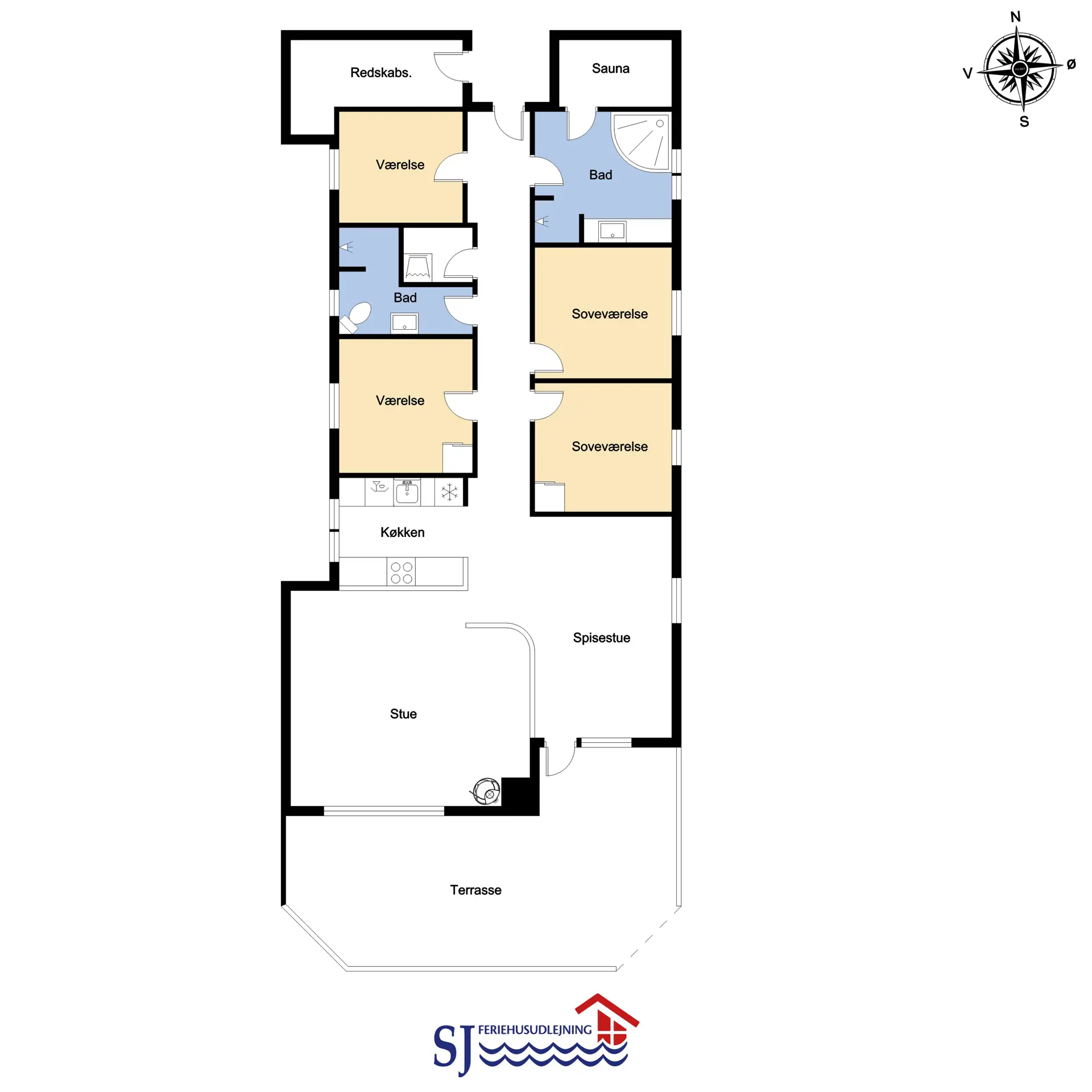 Komfortabel eingerichtetes Ferienhaus aus Stein mit versenkter Kaminstube mit schönen Möbeln und Inventar, der Fußboden ist mit Fliesen. Der Wohnraum ist mit einem Kaminofen und einer Wärmepumpe, die beide für eine schöne und günstigere Wärme sorgen. Stereoanlage mit CD und TV mit DR-Kanälen, es gibt außerdem WLAN im Haus. Die Küche ist mit dem Wohnraum kombiniert und hat ein Ceranfeld-Kochherd, Abzugshaube, Kühlschrank mit 40 l Gefrierfach, Mikrowelle und Geschirrspüler. Der Boden in der Küche und ein Teil vom Wohnraum sind aus Holz. 4 Schlafräume: 1DB + 1DB + 2B + 2B. Das Haus hat 2 Badezimmer, beide mit Toilette, Waschbecken und Dusche. Das große Badezimmer ist mit Whirlpool und Zugang zur Sauna. Beide Badezimmer sind mit Fliesenboden mit Fußbodenheizung. Für die kleinsten Gäste gibt es einen Kinderstuhl. Im Abstellraum gibt es eine Waschmaschine und einen Trockner. Nichtraucher-Haus. 2 „erzogene„ Haustiere sind erlaubt. Eintritt zum Harboørecenteret mit u.a. Fitness und Internetcafé. www.harbooere.dk/hallen.