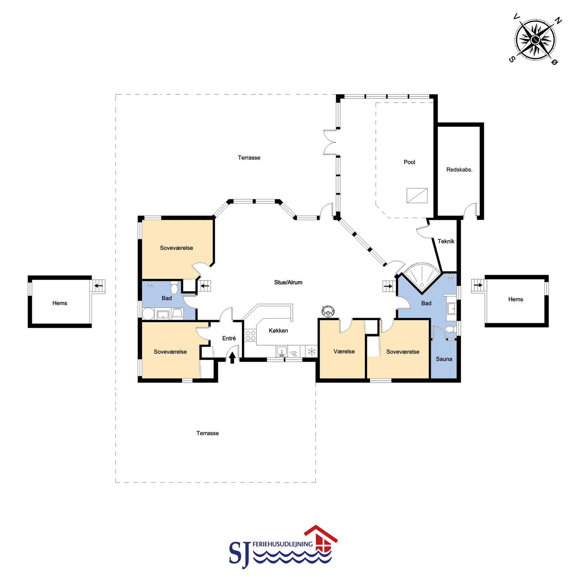 Die Küche des Hauses, die mit dem Wohnzimmer kombiniert ist, ist gut ausgestattet, unter anderem mit Geschirrspüler , Mikrowelle und Kühlschrank mit Gefrierfach. Das gemütliche Wohnzimmer ist mit komfortablen Möbeln, Kaminofen und Flachbildfernseher mit DR-Kanälen, Chromcast, Satellitenschüssel für die deutschen Kanäle und Stereoanlage ausgestattet. 4 gute Schlafzimmer, die mit 1DB+ 1DB + 2B + 2B und offenem Schlafboden mit 2 Schlafmöglichkeiten eingerichtet sind. In allen Zimmern können Doppel- und Einzelbetten hergestellt werden. Für die Kleinen gibt es ein Kinderbett und einen Hochstuhl. Das Haus verfügt über 2 Badezimmer, eines davon mit Toilette, Waschbecken, Dusche und Fußbodenheizung sowie Sauna. Die zweite ist auch mit Dusche und Fußbodenheizung und es gibt Platz für eine Wickelunterlage. Der schöner Poolraum hat Panoramafenster zu 3 Seiten, die ein schönes Licht bieten. Neben dem Pool gibt es einen Whirlpool. Im Haus ist eine Luft-Wasser-Wärmepumpe installiert, über die der Pool beheizt wird. Energifreundliches Haus. Das Haus ist natürlich auch mit Waschmaschine und Trockner ausgestattet. Wenn Sie ein Elektroauto oder einen Plug-in-Hybrid haben, verfügt das Haus über eine Ladegerät, Type 2 die bis zu 11 kWh aufladen kann. Kaution Wintersaison EUR 600 und Sommersaison EUR 300.