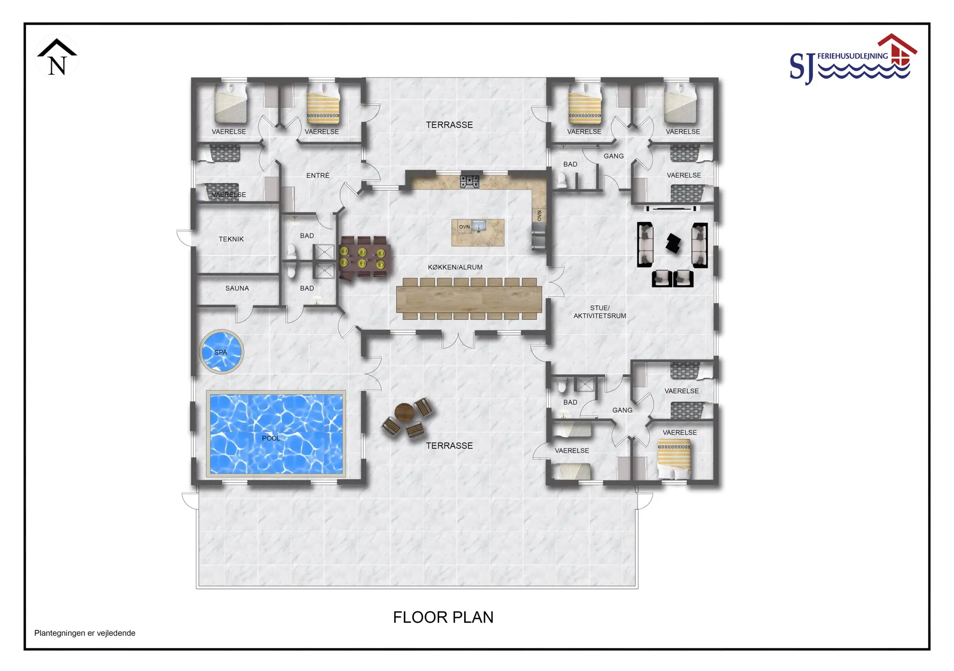 Das 339 m² Luxushaus ist mit allen möglichen modernen Annehmlichkeiten ausgestattet. 9 Schlafzimmer: 1 DB + 1 DB + 1 DB + 1 DB + 1 DB + 2 EB + 2 EB + 2 EB + 2 EB, zusätzlich gibt es 3 große Schlafböden (3 x Hems) - alle mit Matratzen (1,85 x 70) und gemütliche Stühle für die Kleinsten. Geräumige, helle und freundliche Küche mit großen Fensterfronten, sehr gut ausgestattet mit Mikrowelle, Elektroherde mit Backöfen und großem Kühlschrank mit Gefrierfach. Flachbildschirm-TV auf allen 3 Schlafböden (Hems) und Radio. Das Haus hat einen großen Aktivitätsraum mit TV, Billardtisch, Tischtennistisch, Tischfußball, eine gemütliche Sitzecke mit Sofas und eine Bar mit amerikanischem Kühlschrank. Toller Pool-Wellness-Raum, wo sich die Familie im großen Pool oder im einladenden 4-Personen-Whirlpool richtig entspannen und Spaß haben kann. Vom Poolraum haben Sie direkten Zugang zu Sauna und Badezimmer. Darüber hinaus gibt es 3 separate Familieneinheiten, bestehend aus jeweils 3 Zimmern und einem eigenen Badezimmer, komplett ausgestattet mit Toilette, Waschbecken und Dusche. Die Familienabteilungen befinden sich in jede Himmelsrichtung des Hauses, sodass Sie Raum für Privatsphäre haben. In den Familienabteilungen gibt es jeweils einen Hems (Schlafboden), wo kleinere Kinder schlafen können. Schöner, geräumiger Eingangsbereich mit Waschmaschine und Wäschetrockner. Fliesenboden mit Fußbodenheizung überall, Schlafzimmer mit Holzboden. DAS HAUS WIRD NICHT AN JUGENDGRUPPEN VERMIETET. 2 Hochstühle und 2 Kinderbetten für die Kleinen. 2 Haustiere sind erlaubt. Das Haus ist ein Energiesparhaus und wird mit Erdwärme beheizt. Freier Zugang zum Harboøre Center. Schauen Sie hier: www.harboørecenteret.dk. Kaution Wintersaison EUR 800 und Sommersaison EUR 500