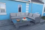 Auf der Terrasse des Hauses kannst du die Sonne genießen oder eine leckere Mahlzeit im Freien zu dir nehmen – während die Kinder auf dem großen Grundstück spielen. Der stehen Loungemöbel auf der Terrasse.