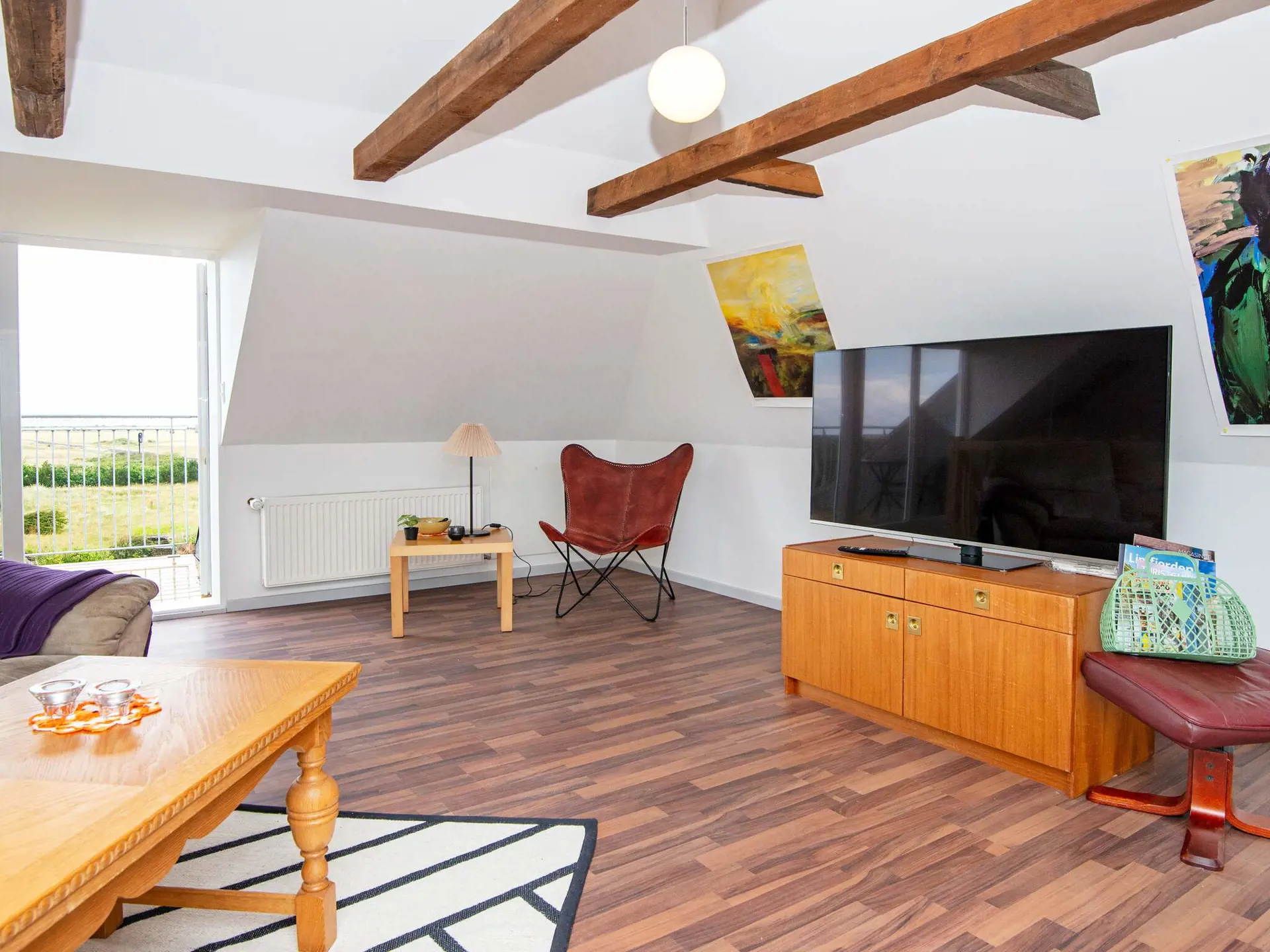 Eine Treppe führt hinauf in die 2. Etage, in der Sie über ein Wohnzimmer und zwei Balkone verfügen. Hier steht außerdem ein Fernsehraum mit WLAN und der besten Aussicht über den Limfjord sowie zur Nordsee auf der anderen Seite bereit. Genießen Sie den Ausblick, während die Sonne über dem Meer untergeht.