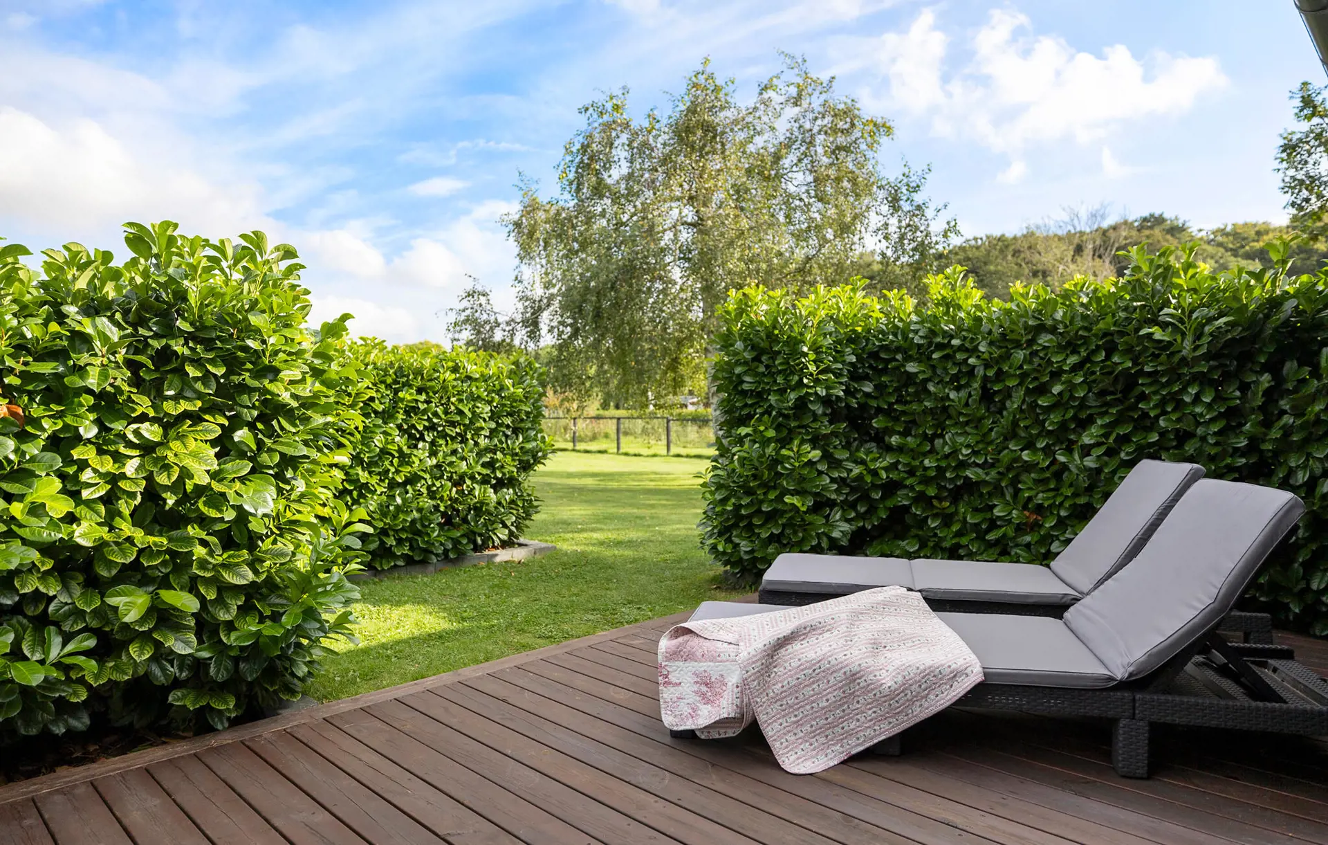 Auch der gepflegte Außenbereich lädt die ganze Familie zum Verweilen im Freien ein. Starten Sie mit einem ausgiebigen Frühstück auf der offenen Terrasse in den Tag, während die Kinder auf der weitläufigen Rasenfläche spielen. Vertiefen Sie sich auf den bequemen Sonnenliegen in Ihre Urlaubslektüre, zelebrieren Sie die gemeinsame Zeit mit stimmungsvollen Grillabenden oder backen Sie Stockbrot an der schönen Feuerstelle.