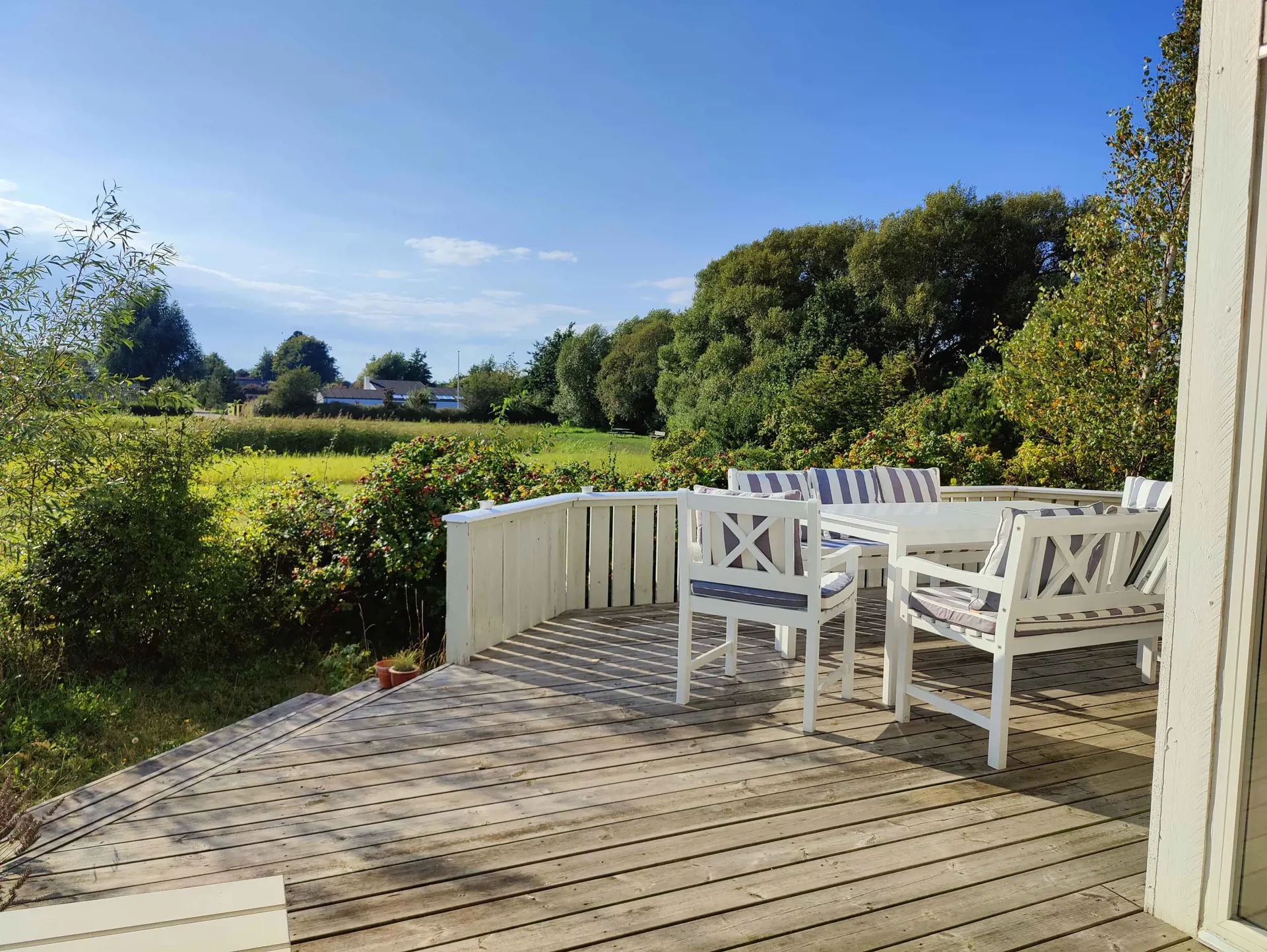Die teilweise überdachte Holzterrasse ist ein natürlicher Treffpunkt. Von hier aus genießt man den Blick auf Wiesenland und einen kleinen See, in dem manchmal ein selten brütender Zwergtaucher zu beobachten ist. Ein idealer Ort für ruhige Momente oder Vogelbeobachtung.