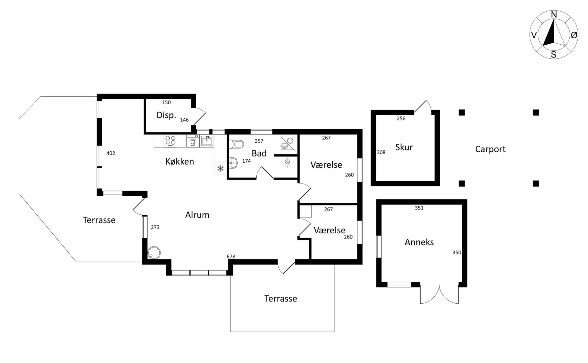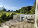 Das Haus verfügt über zwei Schlafzimmer und eine Alkove mit insgesamt sechs Schlafplätzen. Ein Schlafzimmer hat ein Doppelbett, das zweite zwei Einzelbetten, und die Alkove bietet Platz für zwei weitere Personen. Die große Küche eignet sich gut für gemeinsame Mahlzeiten und ist offen mit dem Wohnbereich und der Terrasse verbunden.