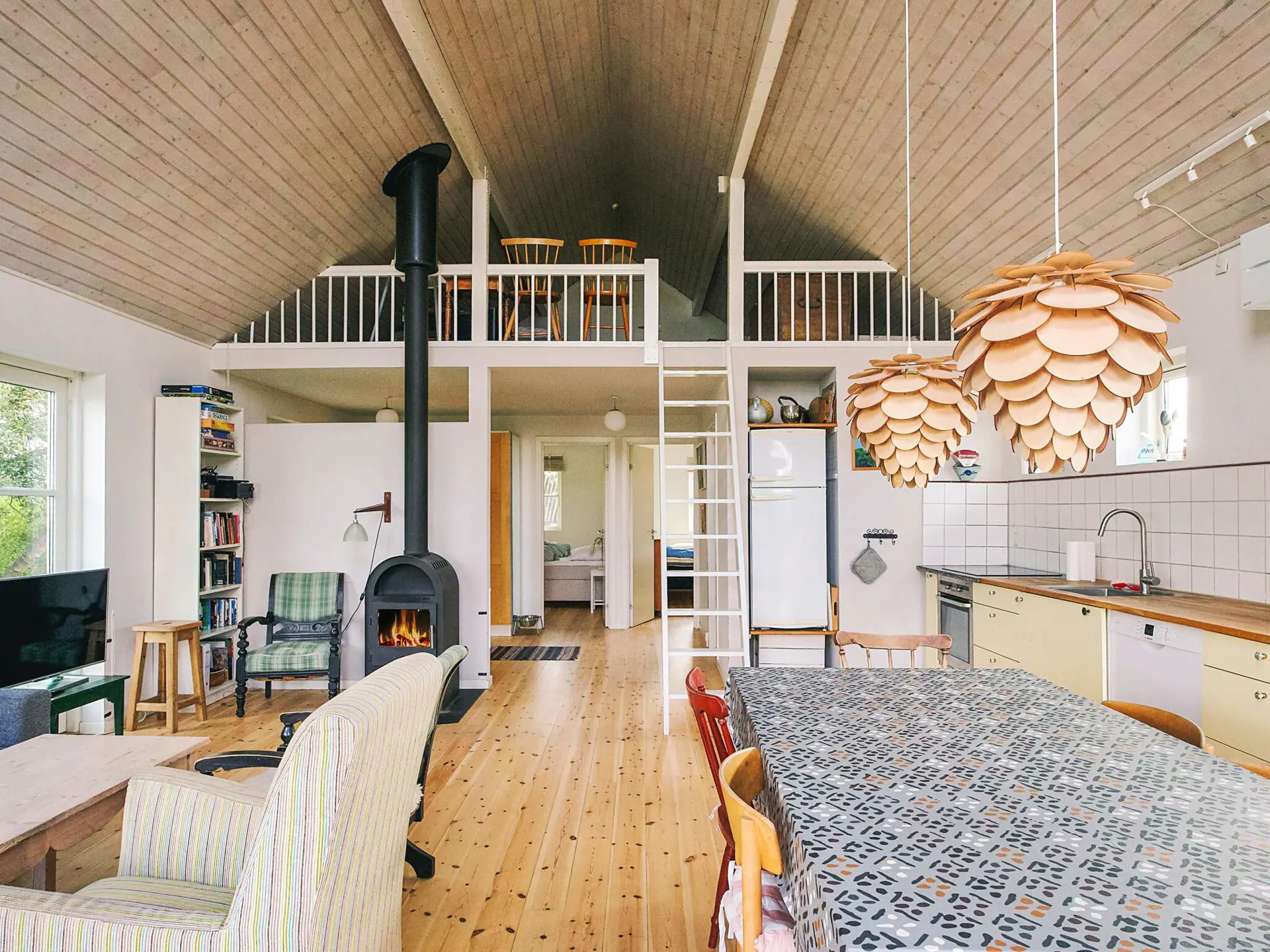 Innen offener Küchen-/Wohnbereich mit offener Zimmerdecke bis zum First für ein luftiges, helles Wohnambiente. Ein gemütlicher Holzofen steht für kühlere Tage bereit. Außerdem Bad mit angenehmer Fußbodenheizung sowie zwei Schlafzimmer und einen Hems mit jeweils zwei Schlafplätzen im Haus. Nebenan auf dem Strandgrundstück steht ein separater Annex mit zwei weiteren Schlafplätzen bereit.