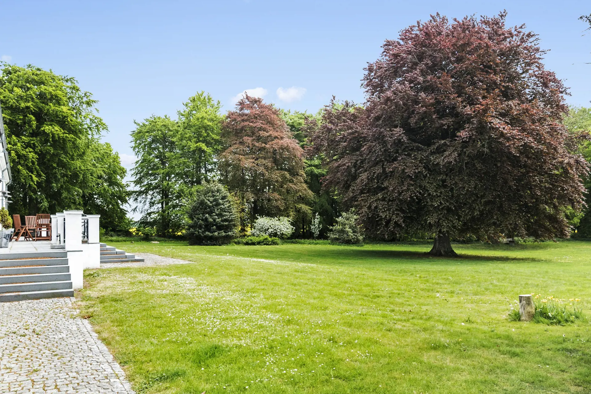 Draußen erwarten Sie Naturerlebnisse und Ruhe. Stellen Sie sich vor, Sie genießen Ihren Morgenkaffee auf der Terrasse mit Blick auf einen alten Landschaftspark – geprägt von prächtigen Bäumen, ehrwürdigen Alleen und einer vielfältigen Vogelwelt mit einigen seltenen Arten. Hier können Sie tief durchatmen, gemütliche Momente (und vielleicht das Kaminfeuer) auf sich wirken lassen und die Stille der Landschaft auf sich wirken lassen. Für alle, die das Leben und die Natur lieben, ist die Nähe zur Natur ein zusätzliches Plus.